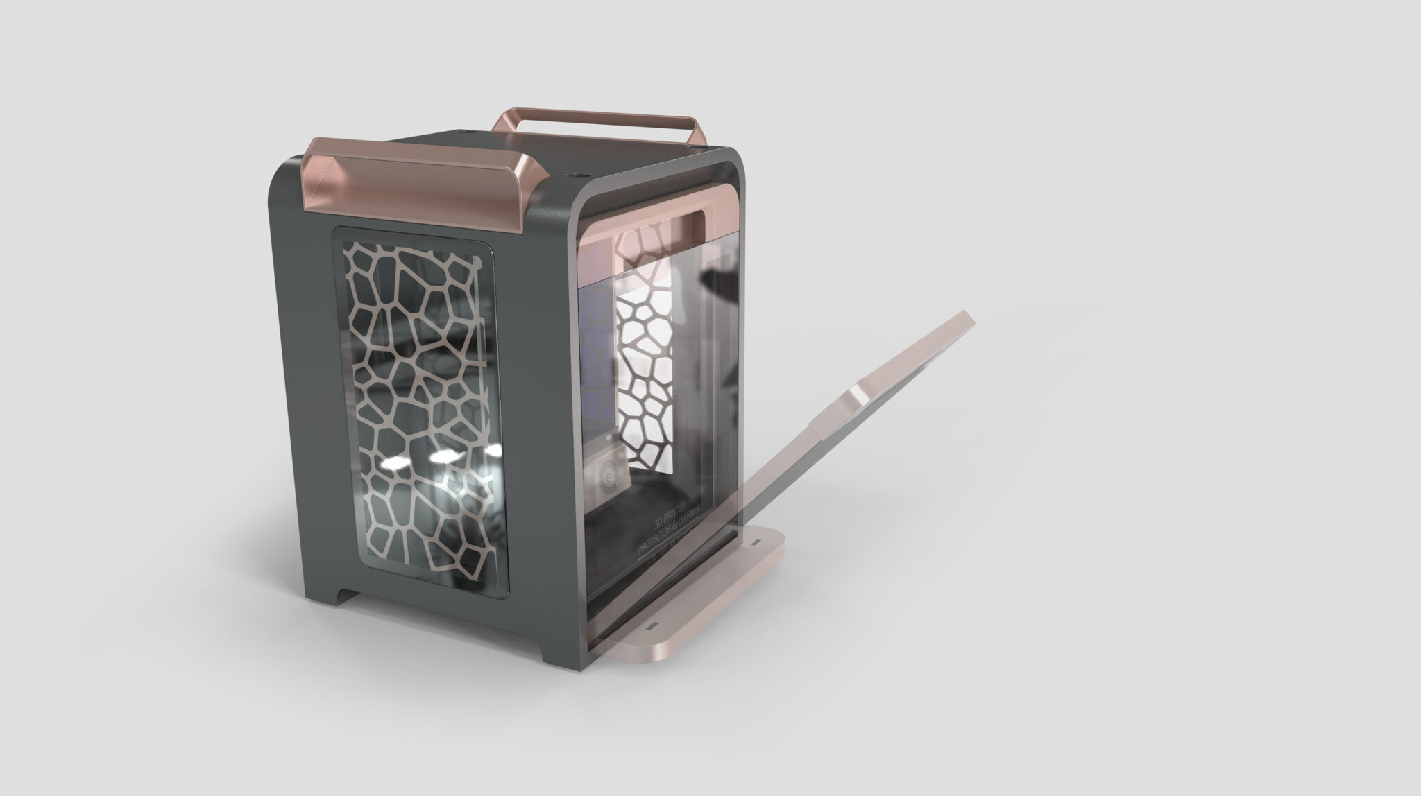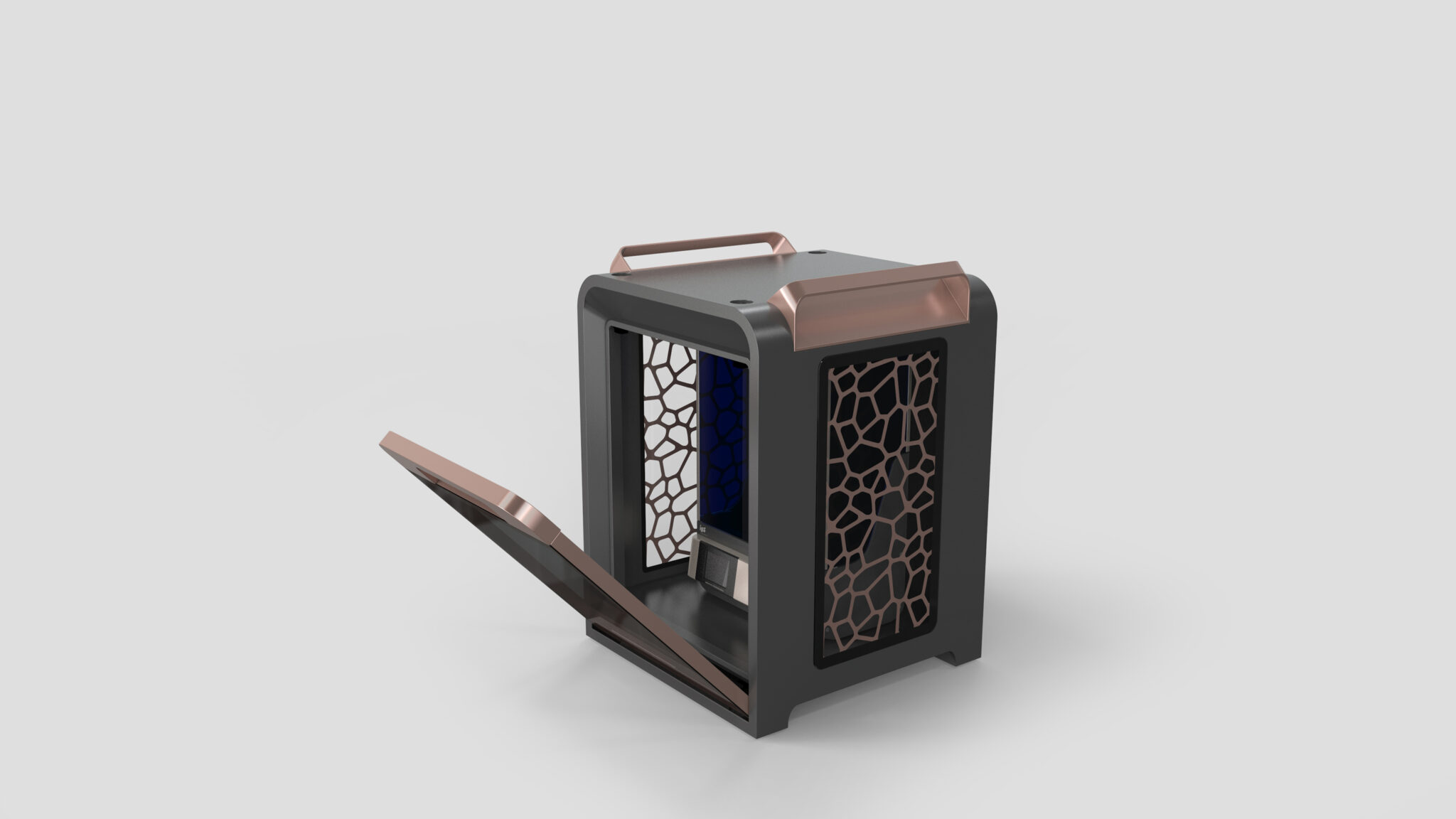 The transparent front protective window emphasizes safety, reliability, and ease of use by allowing users to intuitively monitor internal work progress. On the side, the patterned ventilation structure evolves beyond a simple functional element into a signature feature that conveys the brand’s aesthetic, consistency, and technical sensibility. The color palette, based on matte black with rose gold metal accents, expresses premium quality, precision, and professionalism instead of the coldness typical of traditional industrial equipment.