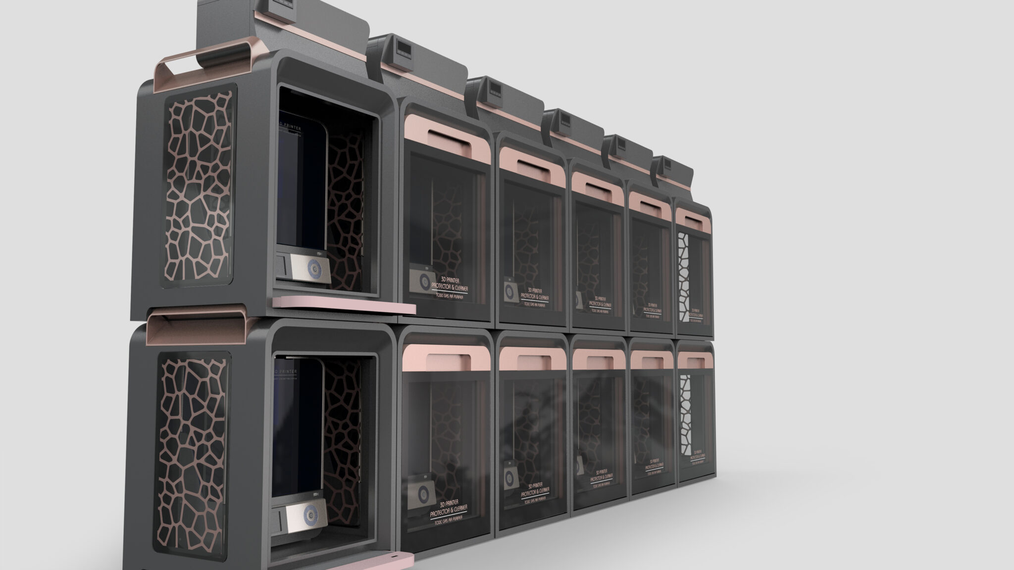 This design is based on the concept of a modular infrastructure system for safe and efficient 3D printer operation. Its structure, which allows units to expand freely vertically and horizontally, is designed to build workstations tailored to specific environments, enabling scalability, flexibility, and organized deployment in industrial settings.