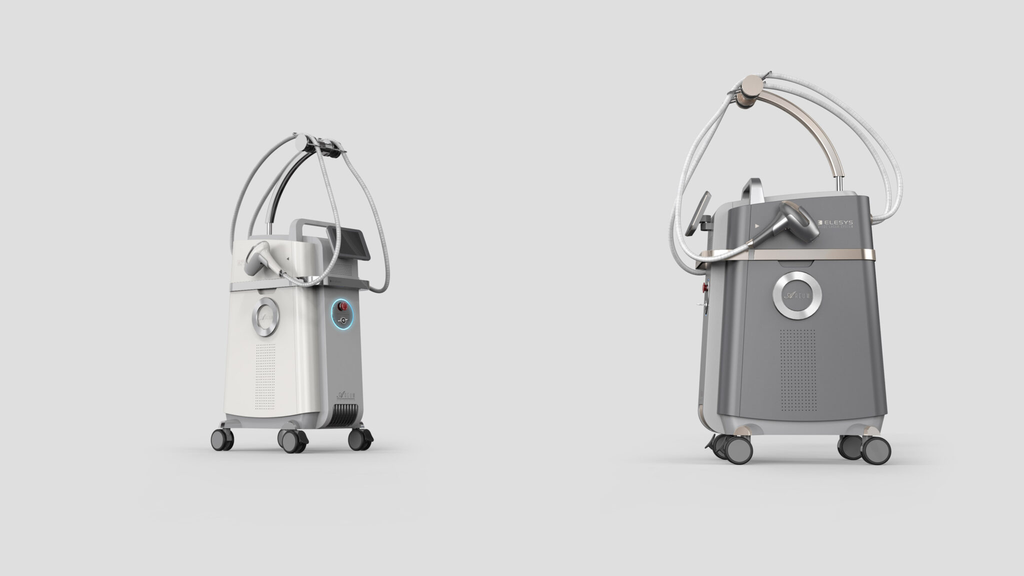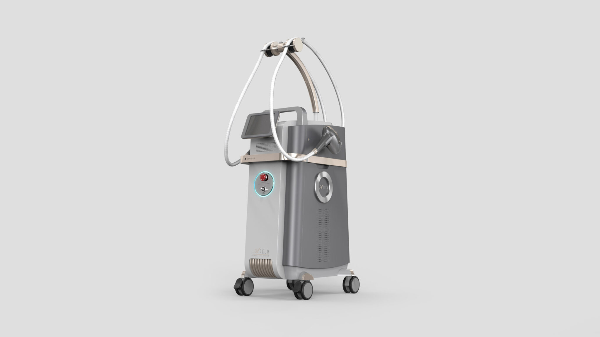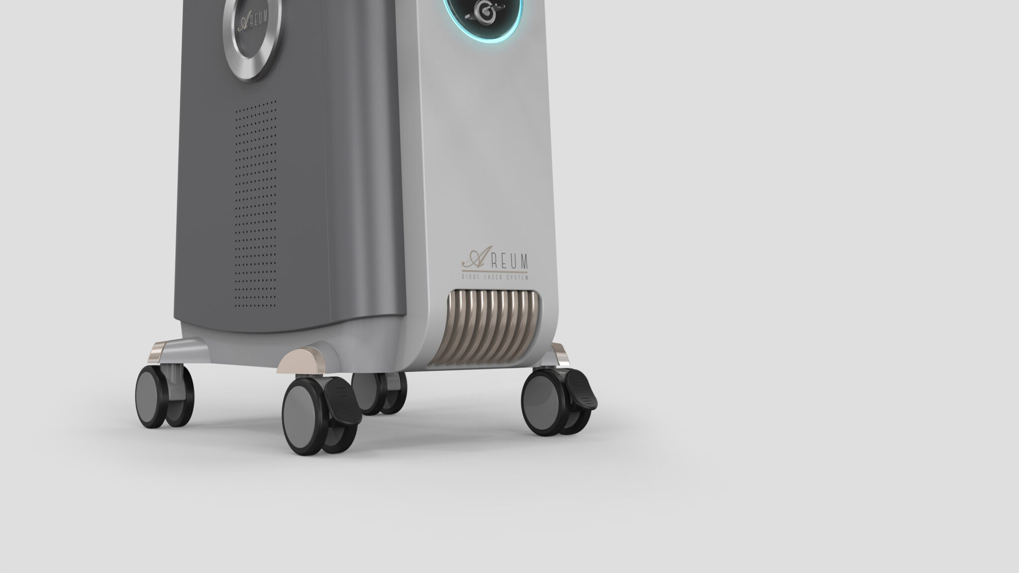 The color palette combines a calm gray base with champagne-toned metallic accents to complete a Premium Medical Tone. This provides a sense of high-end stability and brand reliability while mitigating the intimidating feel of complex medical equipment through soft curvatures. Optimized caster positioning ensures both mobility and stability, resulting in a high-end medical device concept that integrates functional stability, premium tech sensibility, and user-centered design.