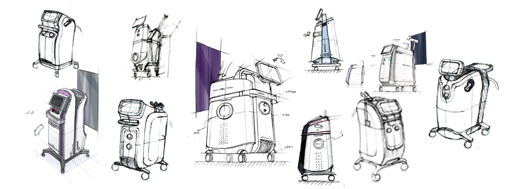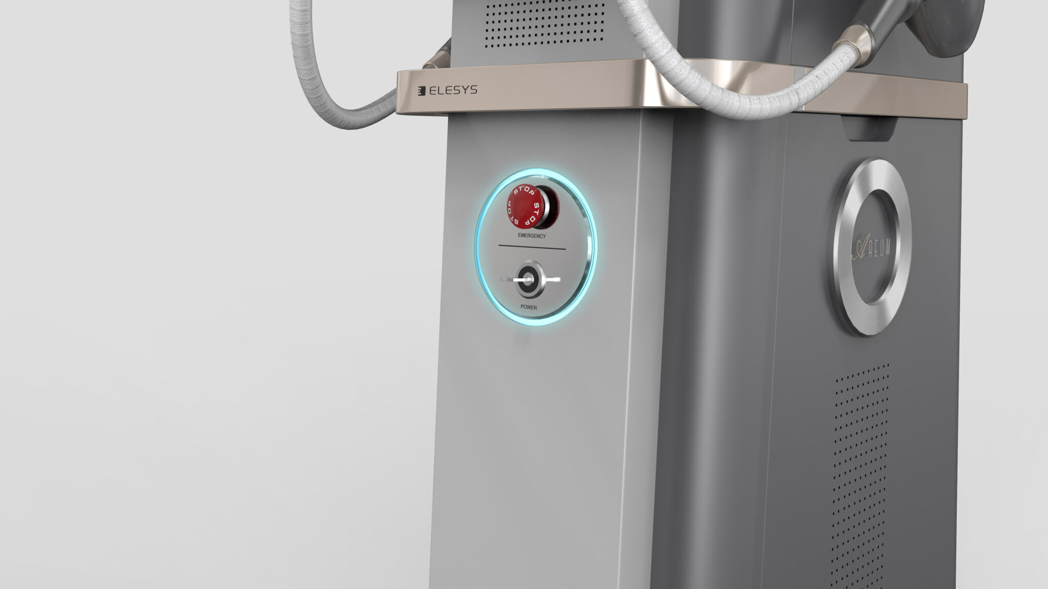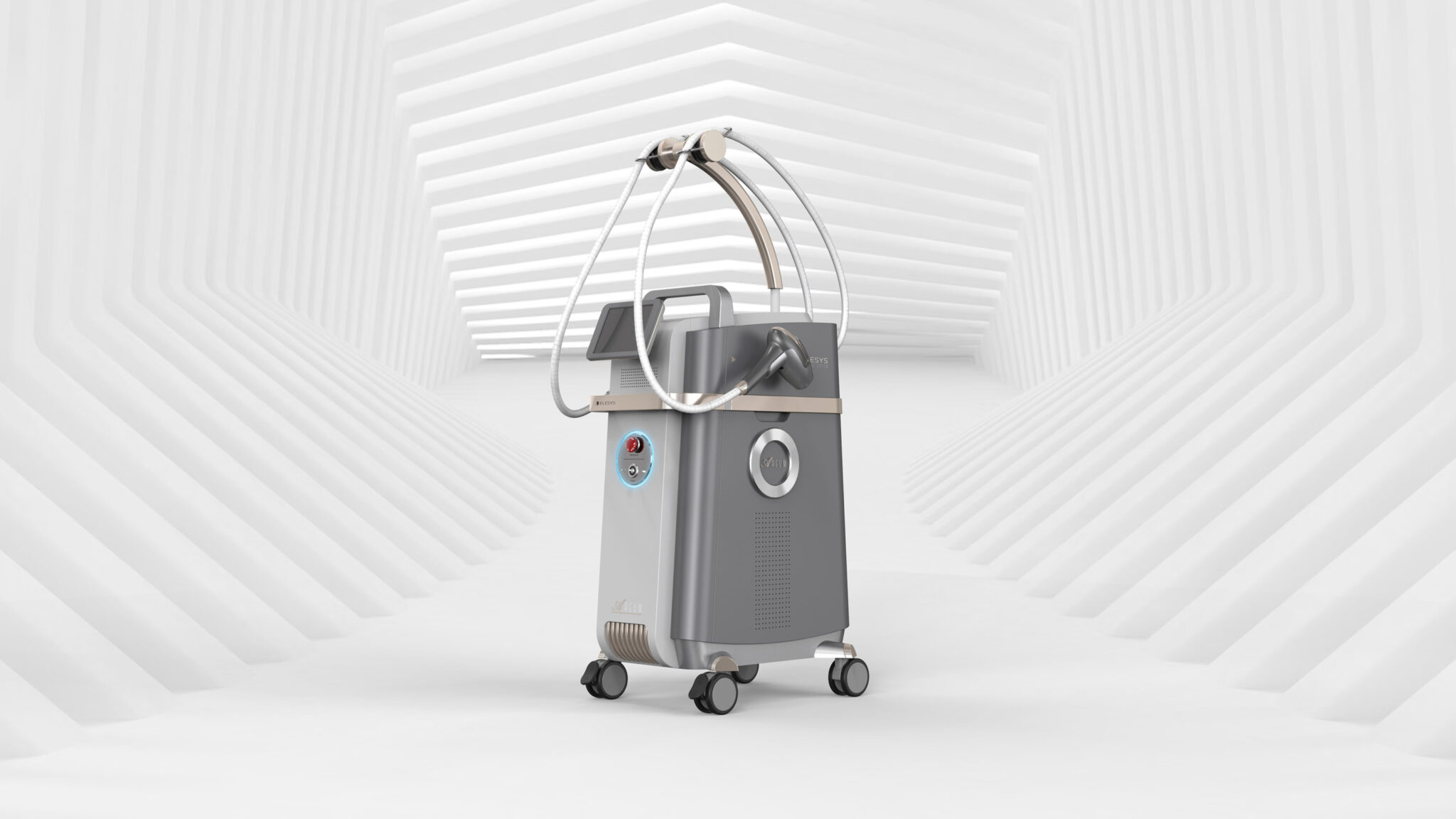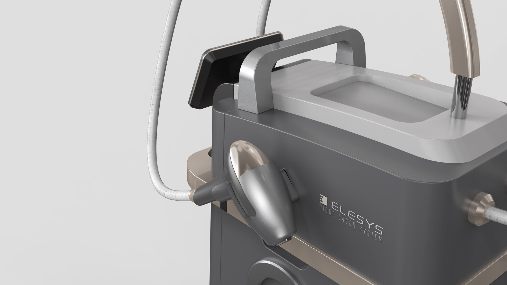 The arch-shaped holder and streamlined cable routing on top form a Dynamic Flow Line, enhancing maneuverability and visually emphasizing the Tech Expression of the device. Additionally, the handpiece cradle and interface are positioned to reflect user movement and habits, achieving a Human-Centered Layout that maximizes operational efficiency and accessibility.