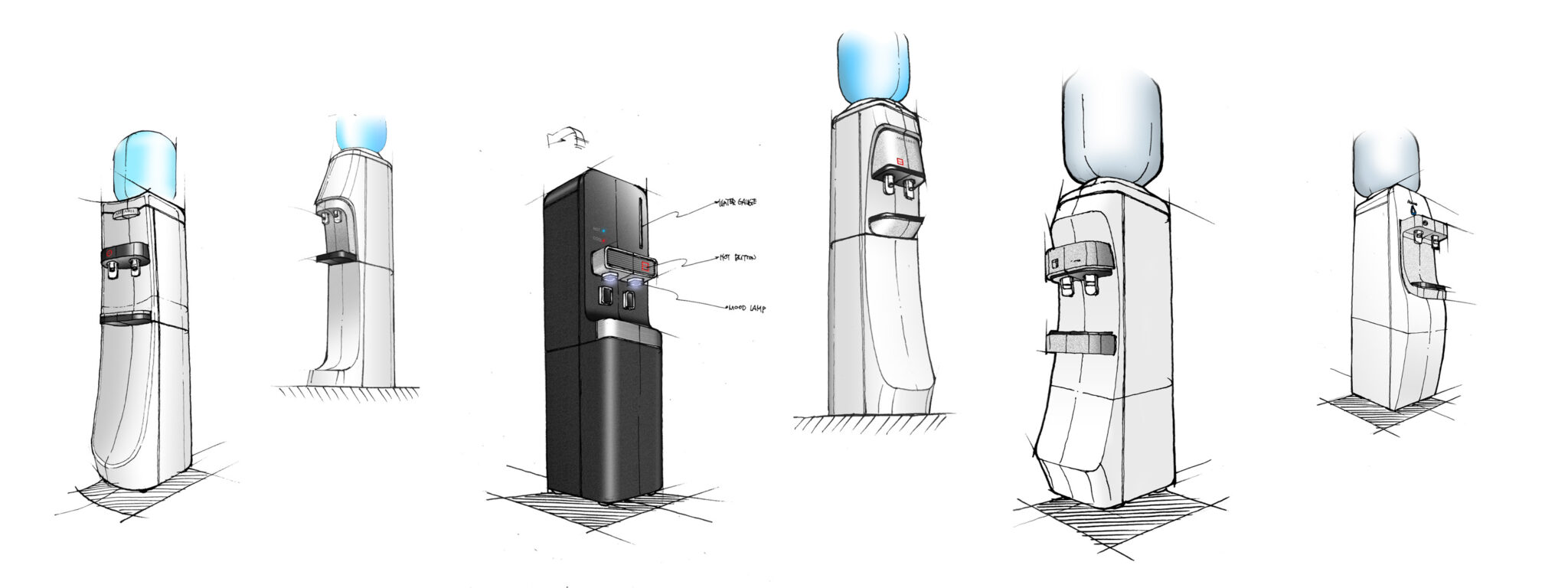 The front emphasizes a Clean Surface by excluding complex decorations, while the curve-centered minimal design delivers a friendly sensibility. The structural connection between the water tank and the body enhances visual unity, making the entire product appear as a single Ordered Object.
