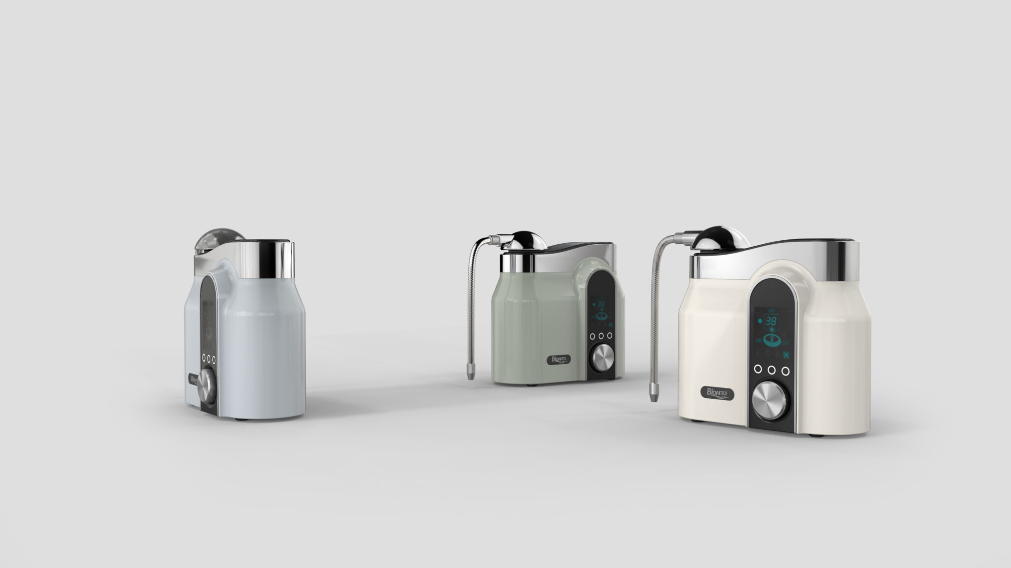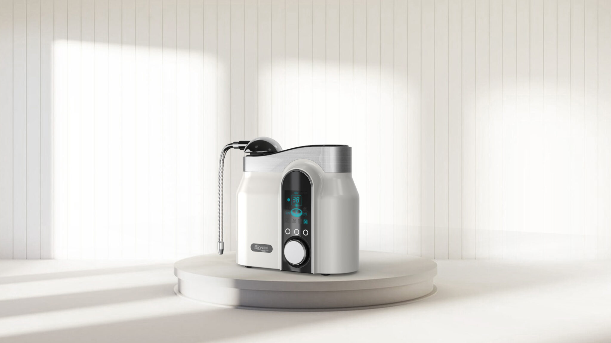 The balanced composition of curved silhouettes and linear panels ensures a clear UI hierarchy, visual stability, and the pristine, hygienic aesthetic essential for medical and water-purification product lines.
