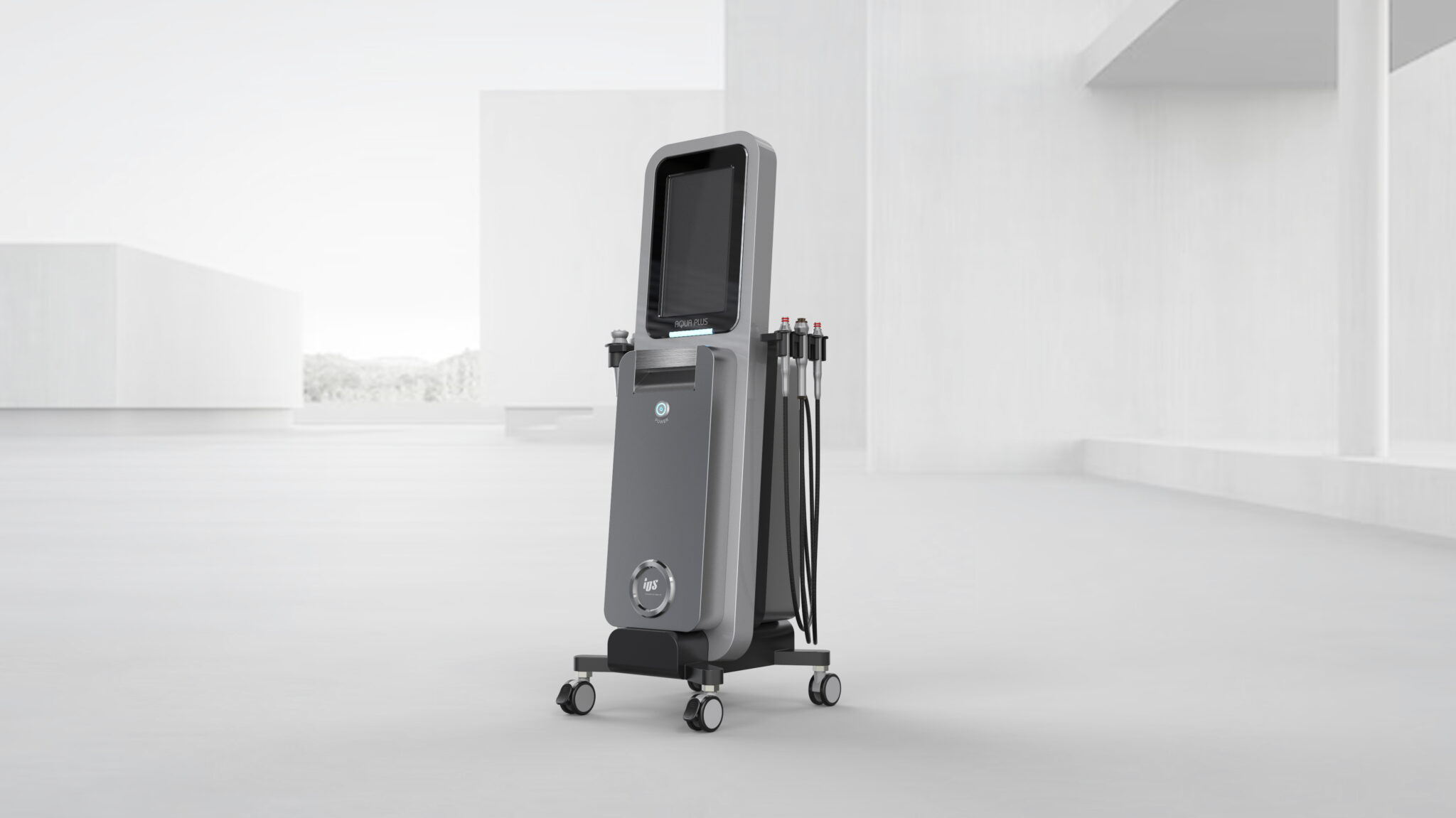 The handpieces and cables are designed as integrated components, visually communicating the reliability of professional equipment that is always ready for use. Furthermore, the matte gray finish ensures cleanliness and neutrality while offering practical durability for frequent maintenance. The compact base and caster structure allow the device to blend naturally into various layouts, functioning as both medical equipment and a sophisticated interior object.