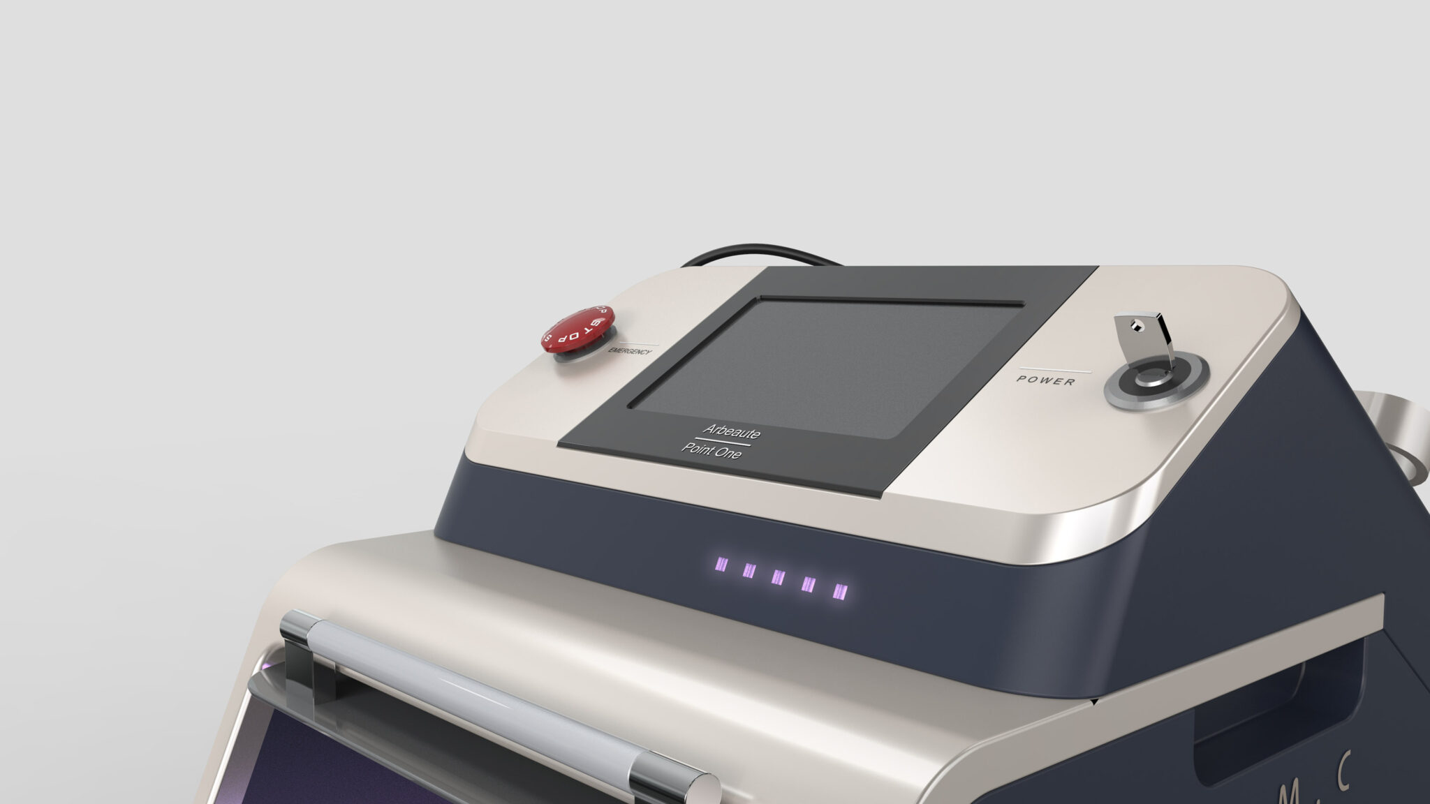 The front incline optimizes the UI panel and controls for the user’s eye level and hand reach, showcasing an ergonomic layout that considers situations where a practitioner operates the device with one hand while performing treatment with the other. A metallic frame line defines the boundaries of the equipment, adding the sturdy ambiance of premium medical devices to the overall design.
