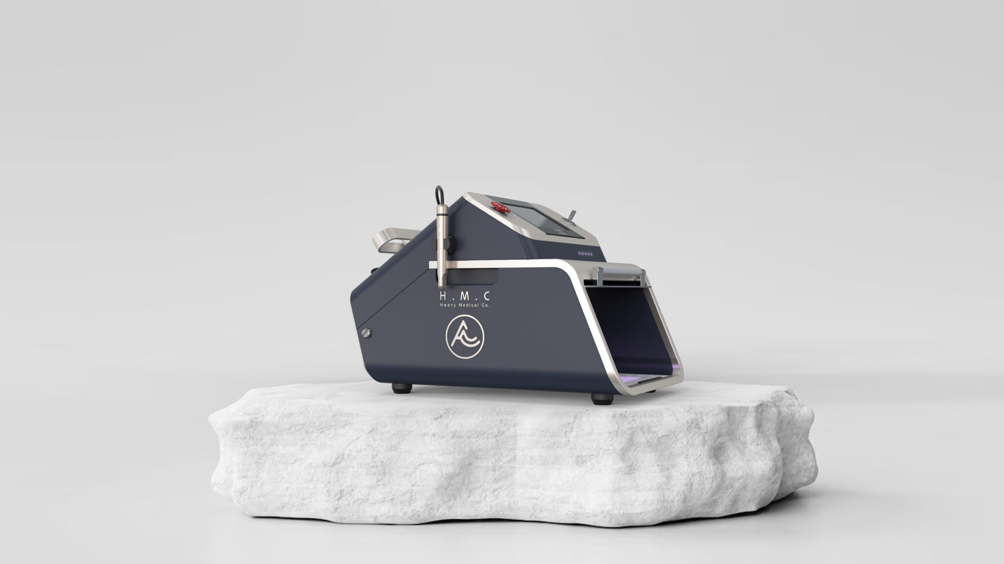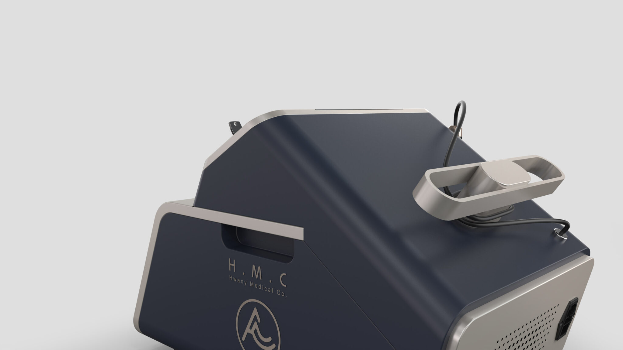 The side handpiece dock is designed for quick docking, making it suitable for repetitive procedural patterns, while the deep navy professional tone maintains a calm presence in clinical environments. The open-frame structure at the bottom responds to heat dissipation and cable management while serving as a design element that makes the device appear light yet stable. Overall, this product is defined as a Compact Medical Engineering Design, accurately visualizing the essence of a small but powerful medical laser device.