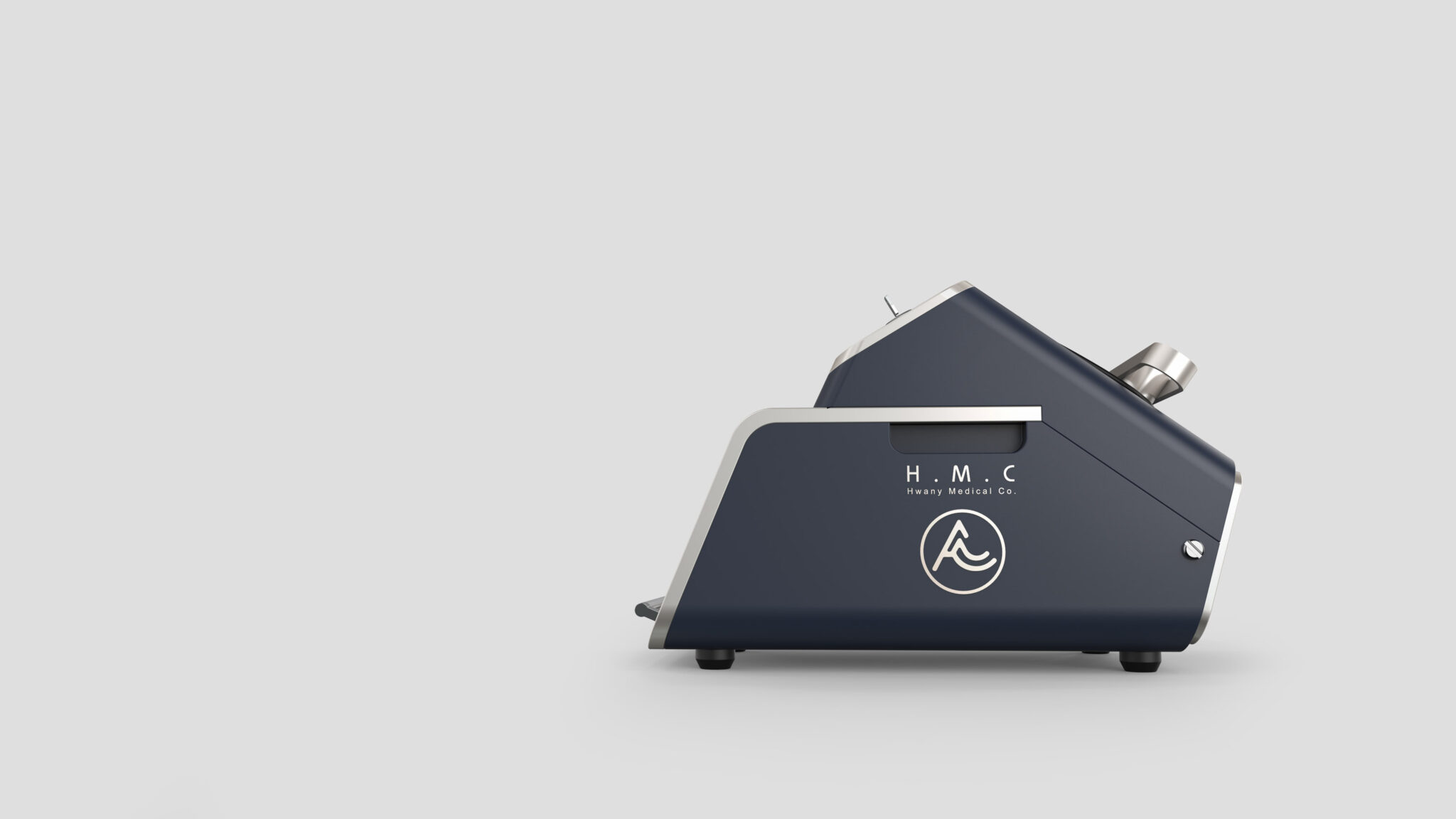 This design visually compresses the stability, reliability, and ease of use required in compact medical laser equipment. The main body is based on a robust geometric silhouette, adopting a stable, near-triangular structure designed to strongly convey heaviness, internal technology, and precision engineering.