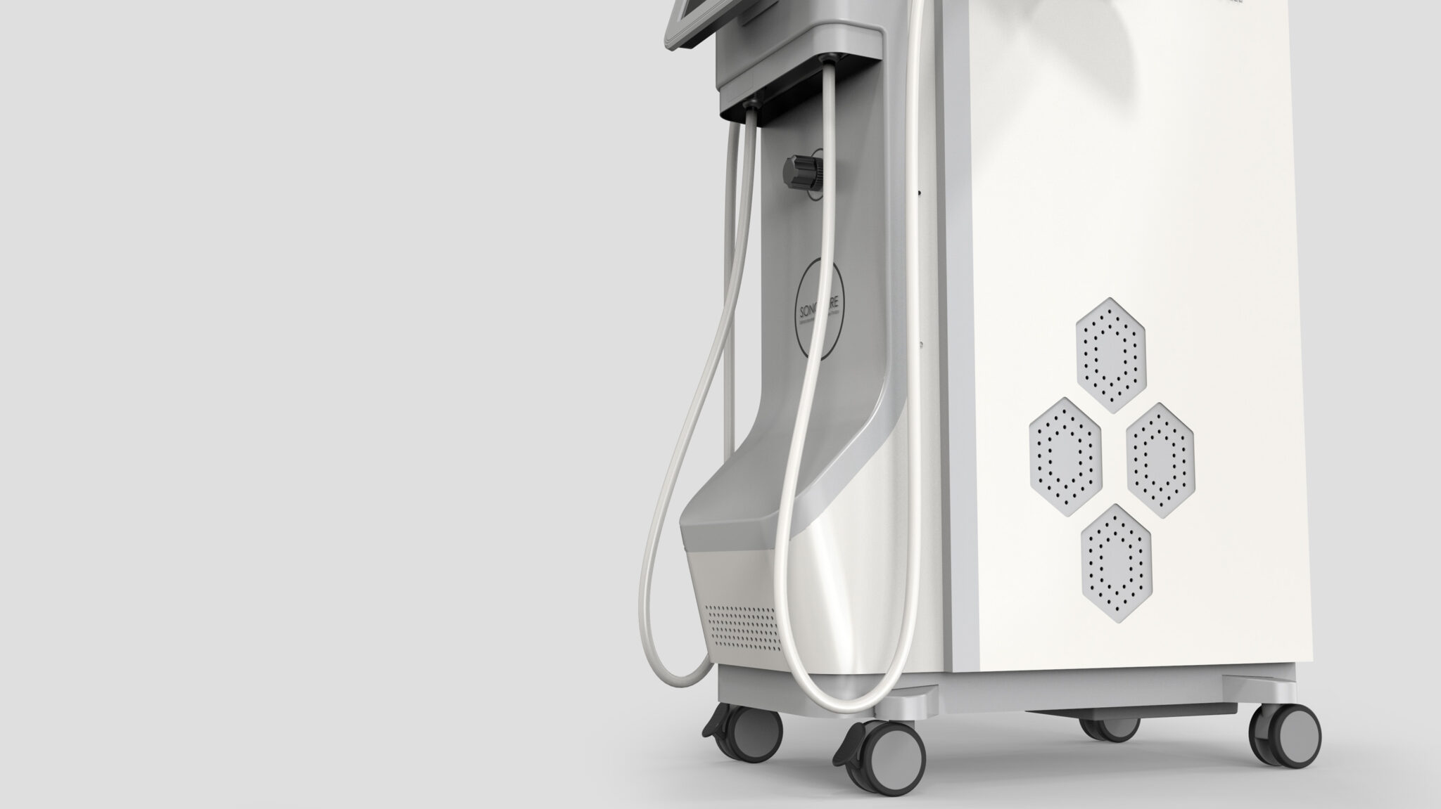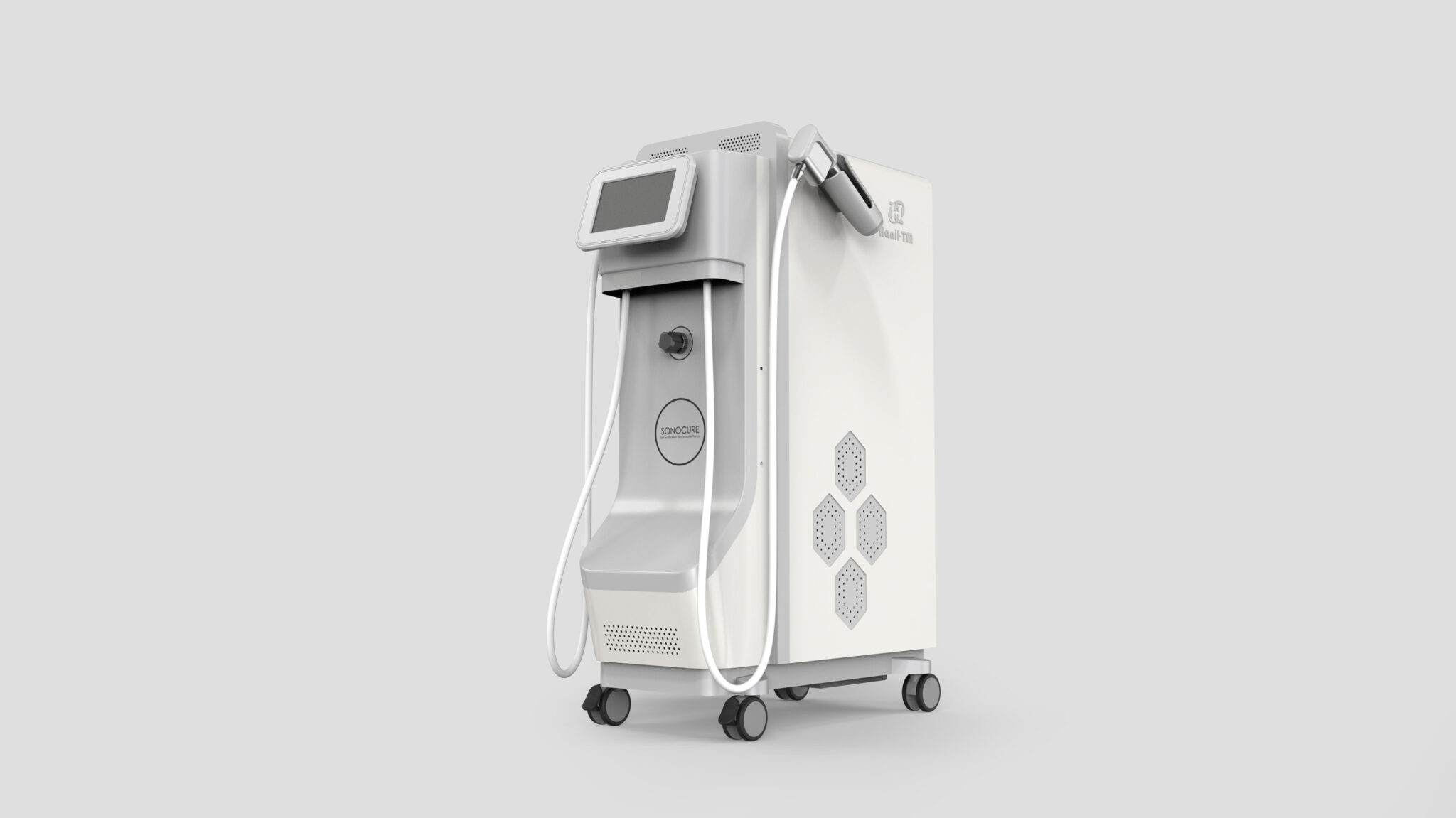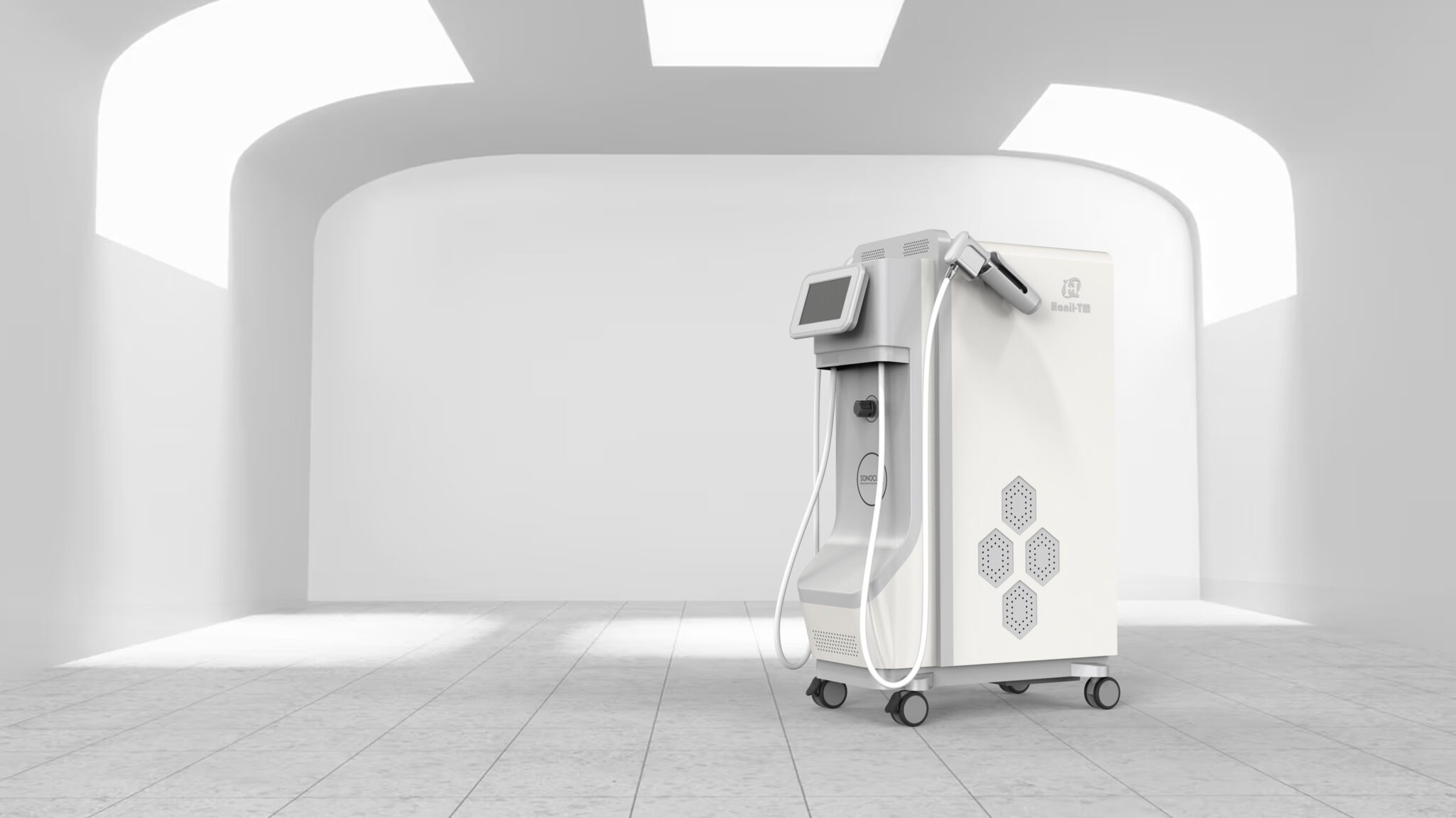 The Hexagonal Pattern Ventilation Structure on the sides secures both aesthetics and functionality, visually expressing technical precision and brand identity. Furthermore, the combination of bright neutral tones and metal accents provides a Clean and Professional Visual Experience that blends naturally with medical spaces.
