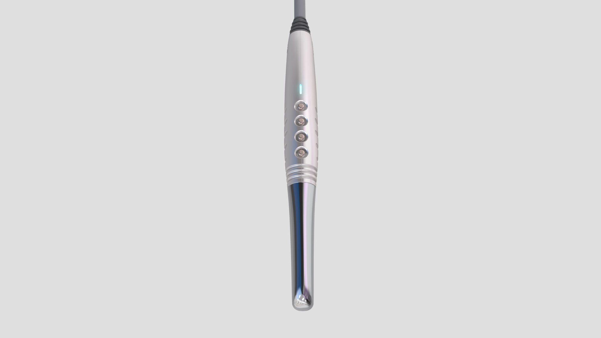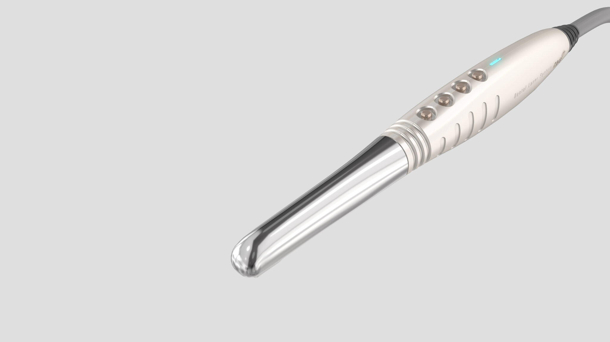 This is a High-Precision Compact Instrument designed to embody the core values of dental laser devices: precise control, rapid responsiveness, and a stable grip within spatial constraints. The exterior features metallic silver and fine highlight lines, Visually Expressing the Image Vector (Directivity and Accuracy) Unique to Laser Equipment.