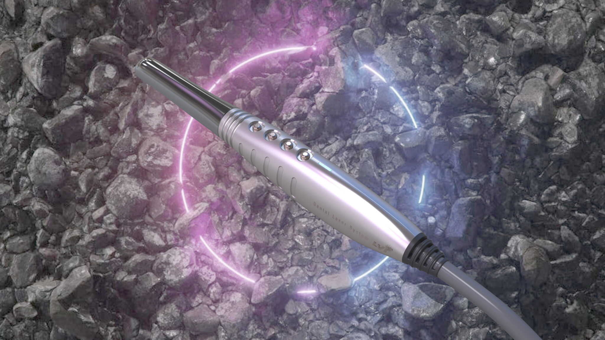 The sophisticated metal-machined points and LED indicators capture both Reliability as High-End Medical Equipment and the Symbolism of Precision Technology. The laser ring effect in the background symbolically reveals the Concentration, Transmission, and Accurate Striking of Laser Energy, giving the entire handpiece the complete impression of a refined medical tool.