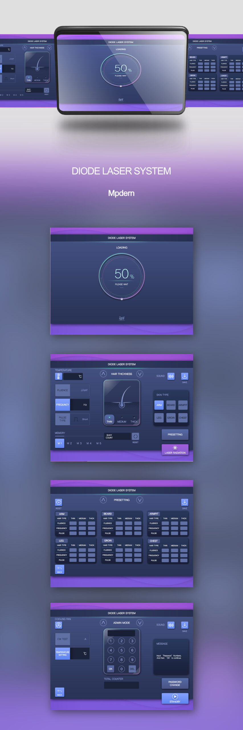 The central circular loading gauge visualizes system stability as “energy accumulation,” providing an intuitive representation of the device’s status. Simple icon graphics for body parts and hair thickness enhance understanding without distracting from the workflow. High-contrast block-style buttons and a clearly distinguished laser emission button are implemented to prevent accidental operation and ensure rapid, safe control. In summary, this design is a sophisticated laser treatment UI that organizes protocol-based workflows through a modern visual language.