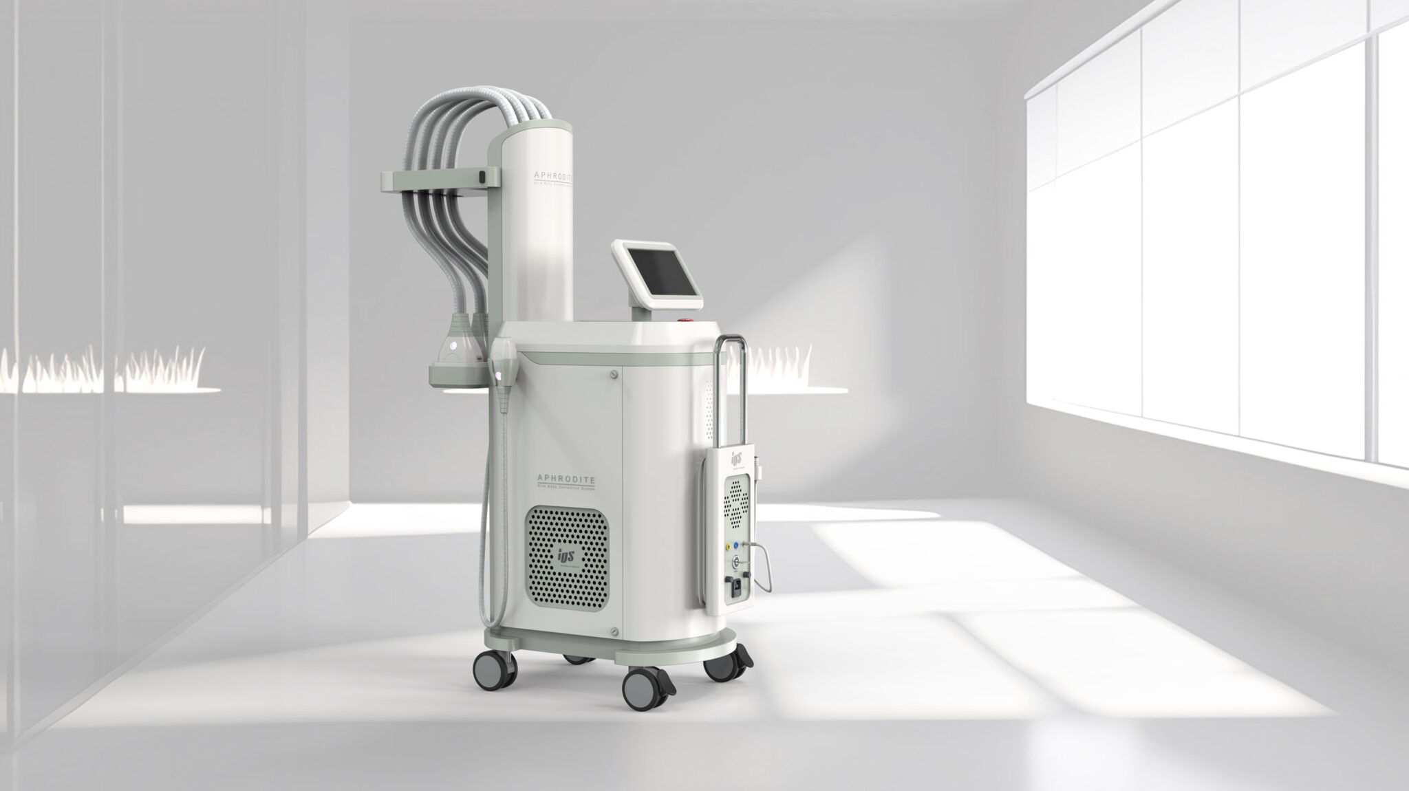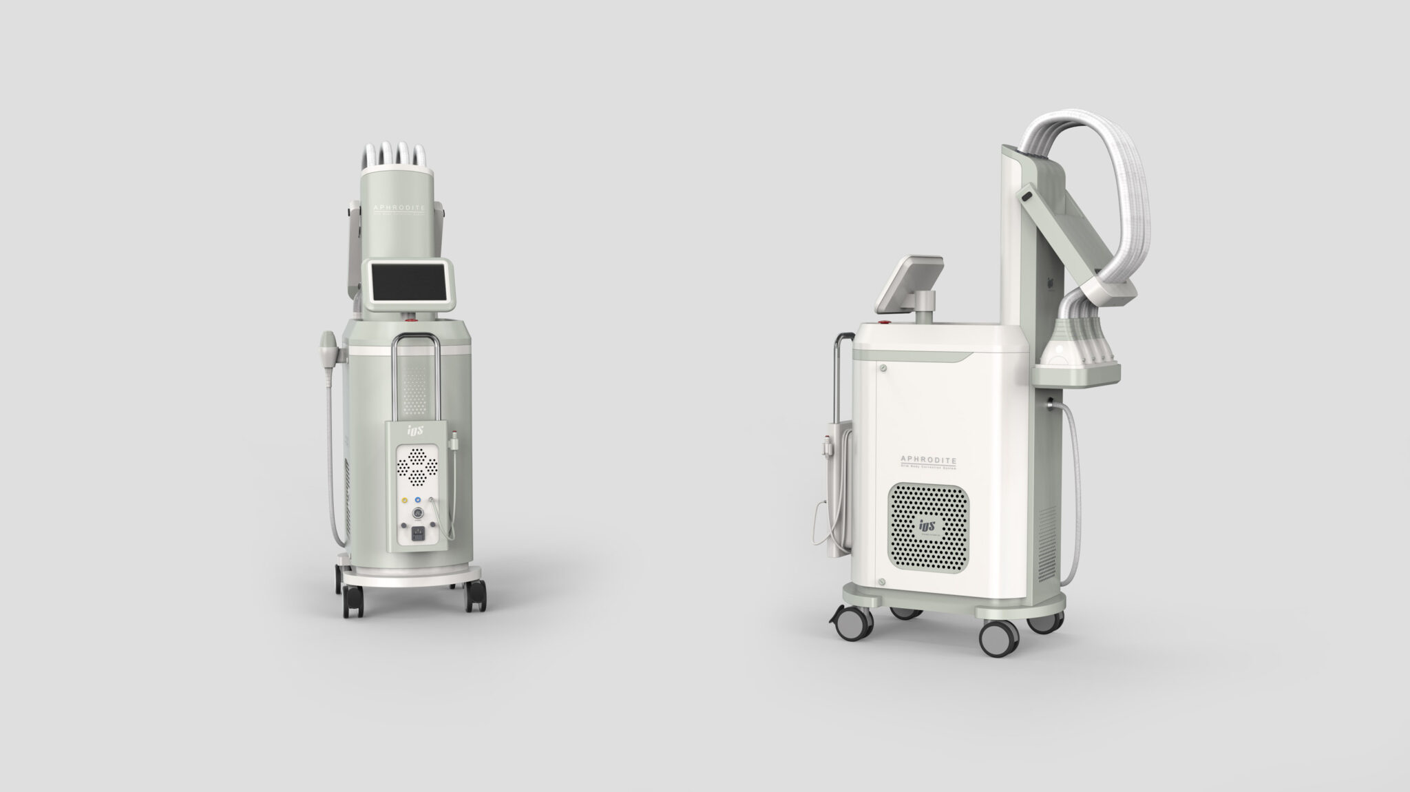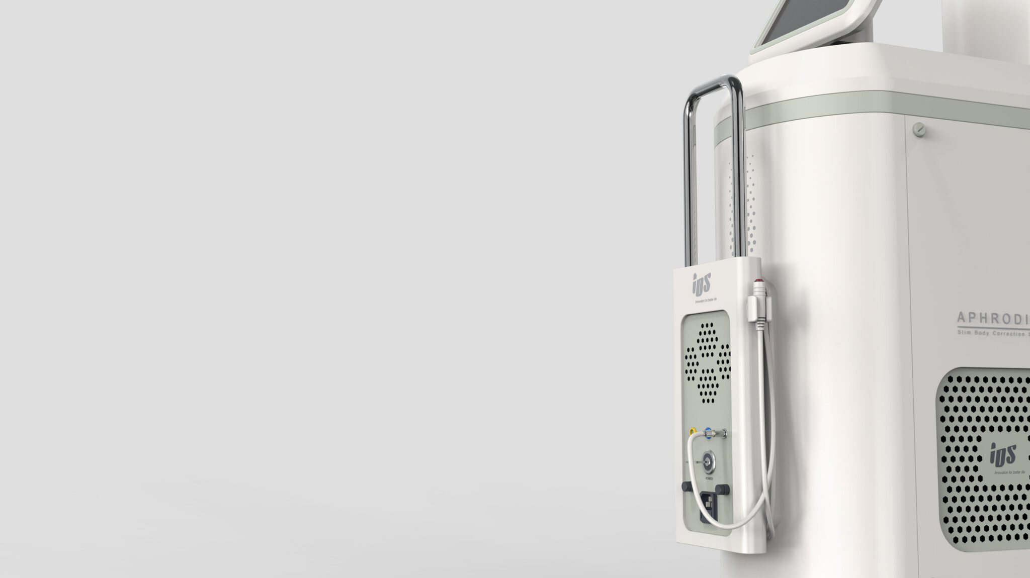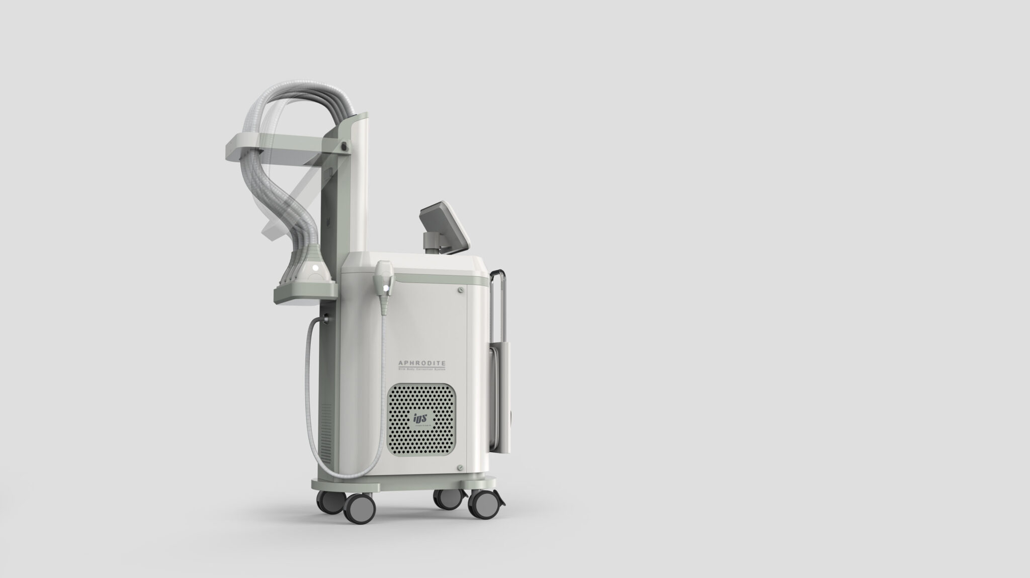 This design is based on the Soft Medical Engineering concept, developed with a focus on organized structure, soft medical sensibility, and stable operability, considering the characteristics of diode-based body and fat management equipment using multiple handpieces. The overall silhouette features a slim yet sturdy vertical structure for efficient placement in limited clinic spaces, while the curve-centered form softens the coldness typical of medical equipment and provides a friendly impression.