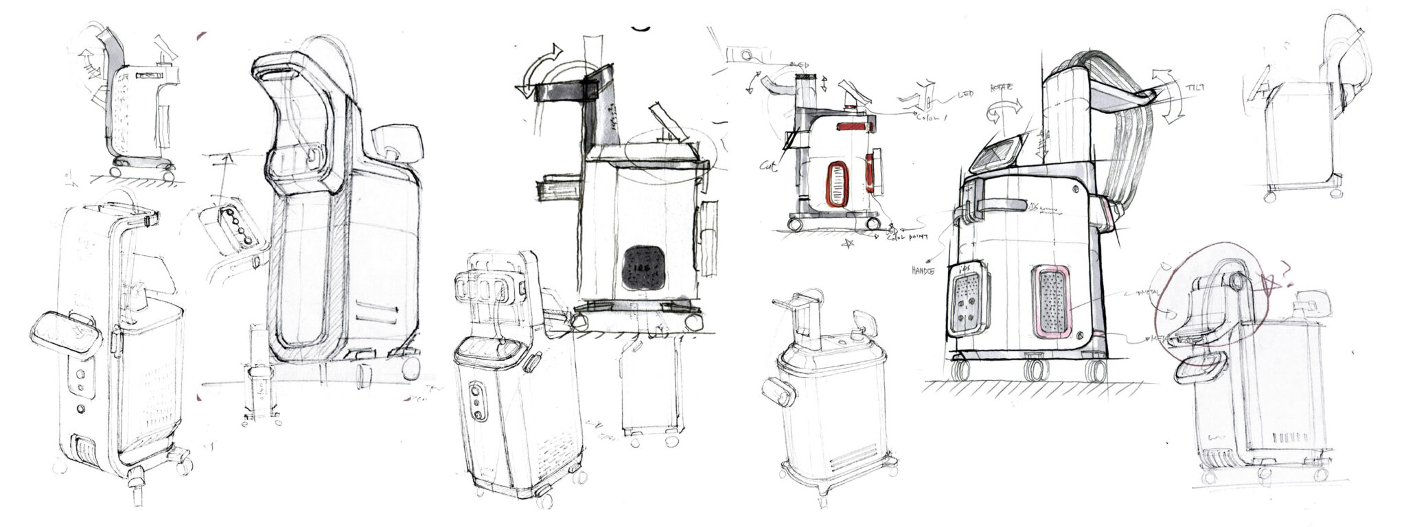 The multi-cable holder at the top is the core of the Organized Cable Architecture concept, designed to keep multiple cables neatly aligned without tangling, thereby maximizing usability and safety. The smooth curves of the descending cables create a visual unity with the device’s form and establish a structural beauty that emphasizes technical detail. The color palette uses a Calming Clinical Tone to minimize tension in the medical environment while highlighting professionalism and a hygienic image.