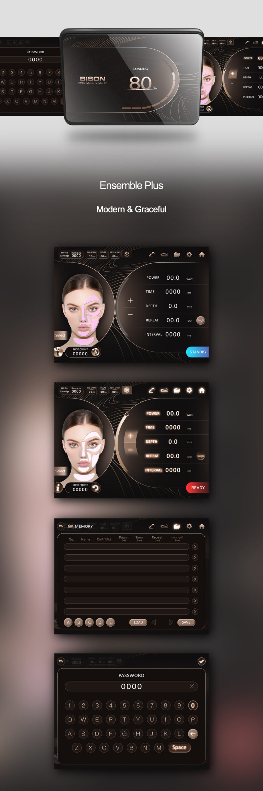 The harmony of rose gold and dark tones expresses the maturity and professionalism of a premium medical brand, enhancing the luxury of the entire treatment space. Clear color contrasts for READY and STANDBY modes, along with safety-centered interfaces like passwords and memory functions, faithfully reflect reliability and international standards for medical device UI. Ultimately, this interface presents a new standard for medical UI that connects precision, elegance, and safety.