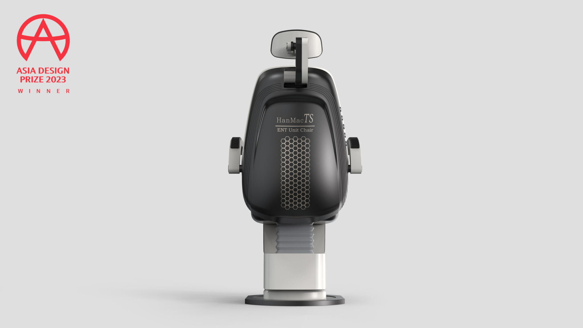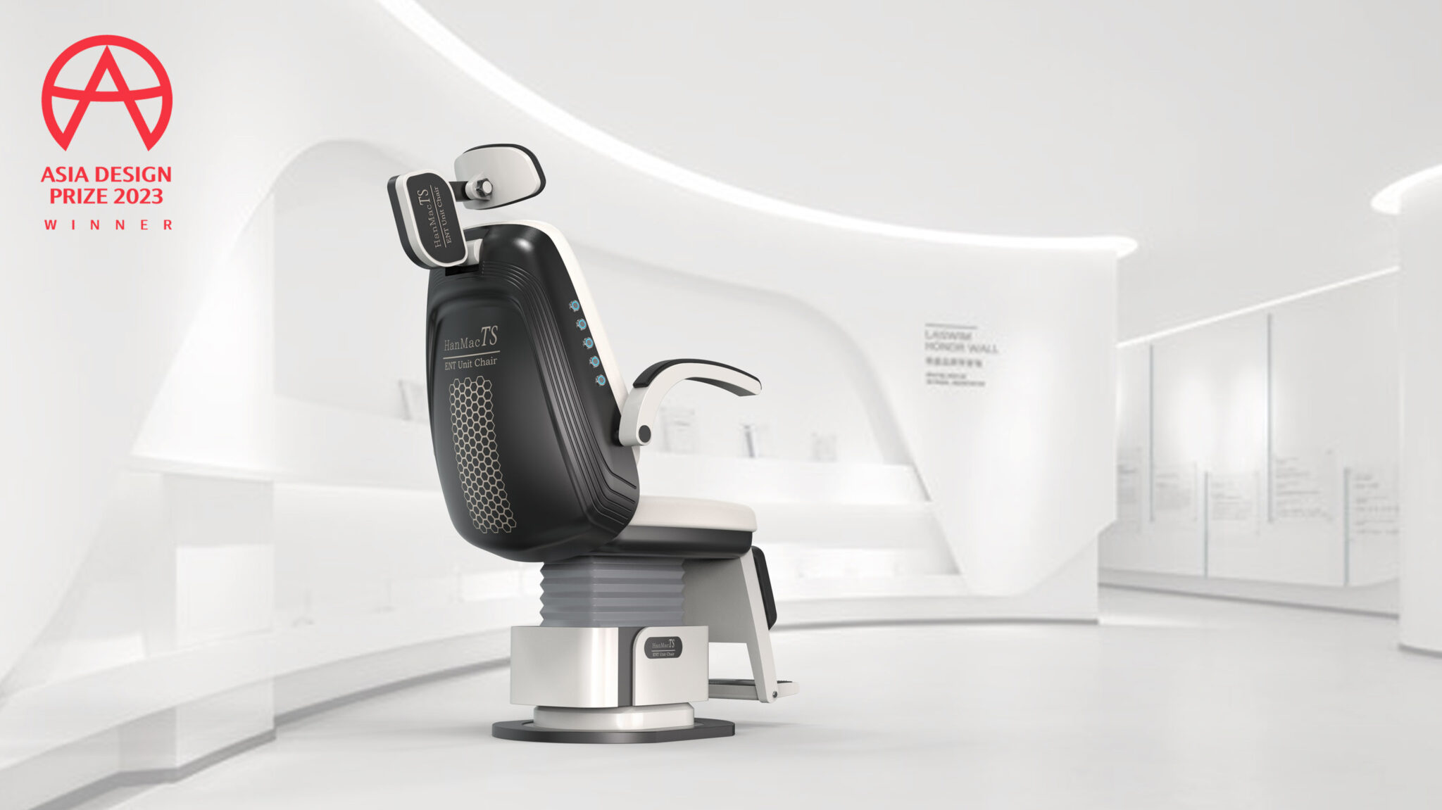 The hexagonal pattern ventilation on the backrest serves as a brand signature, satisfying both functionality and identity. UI buttons positioned on the side are arranged according to visibility and motion paths, realizing a Human-Centered Interface for intuitive operation.