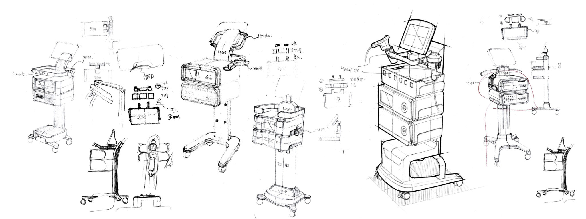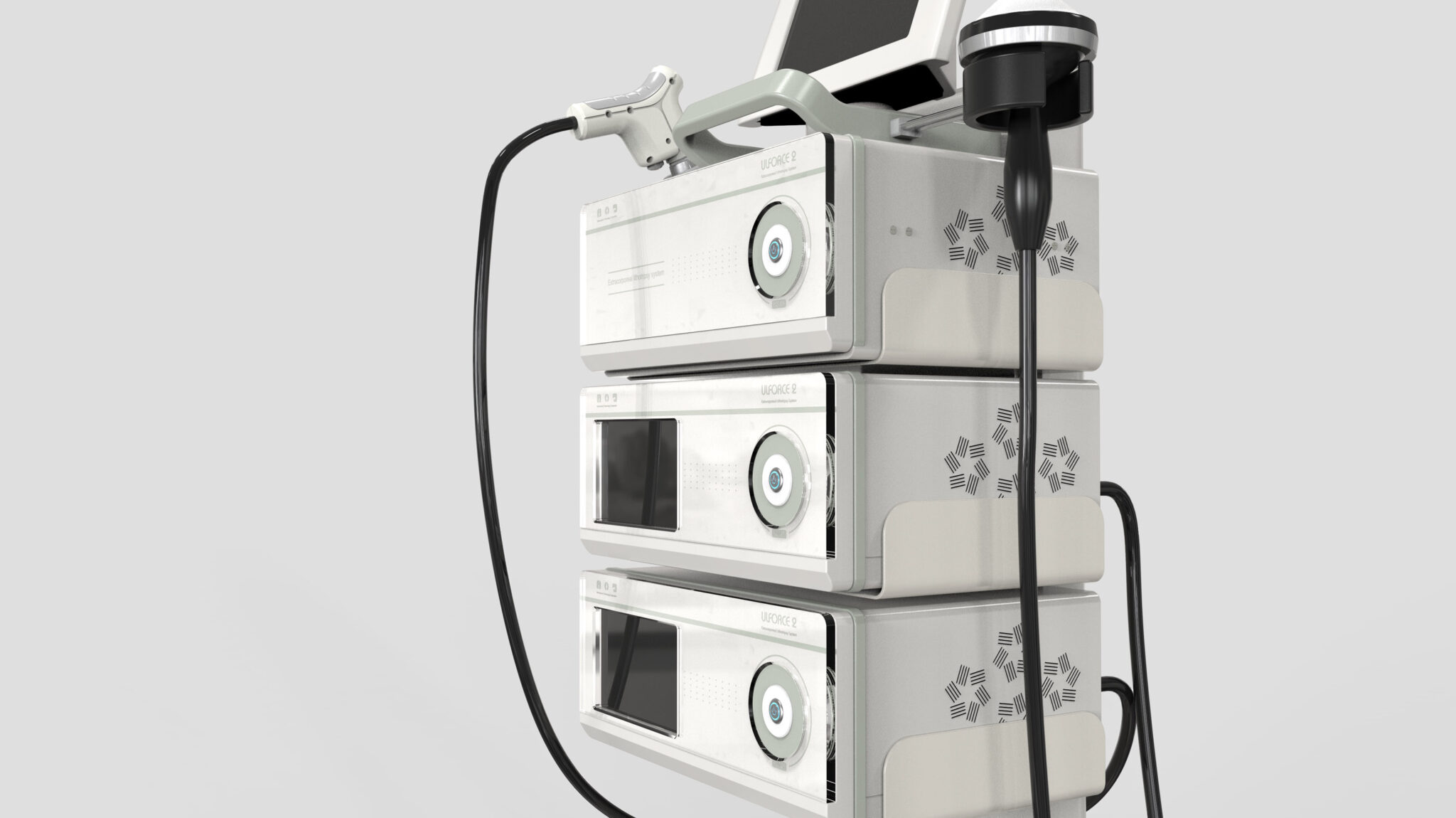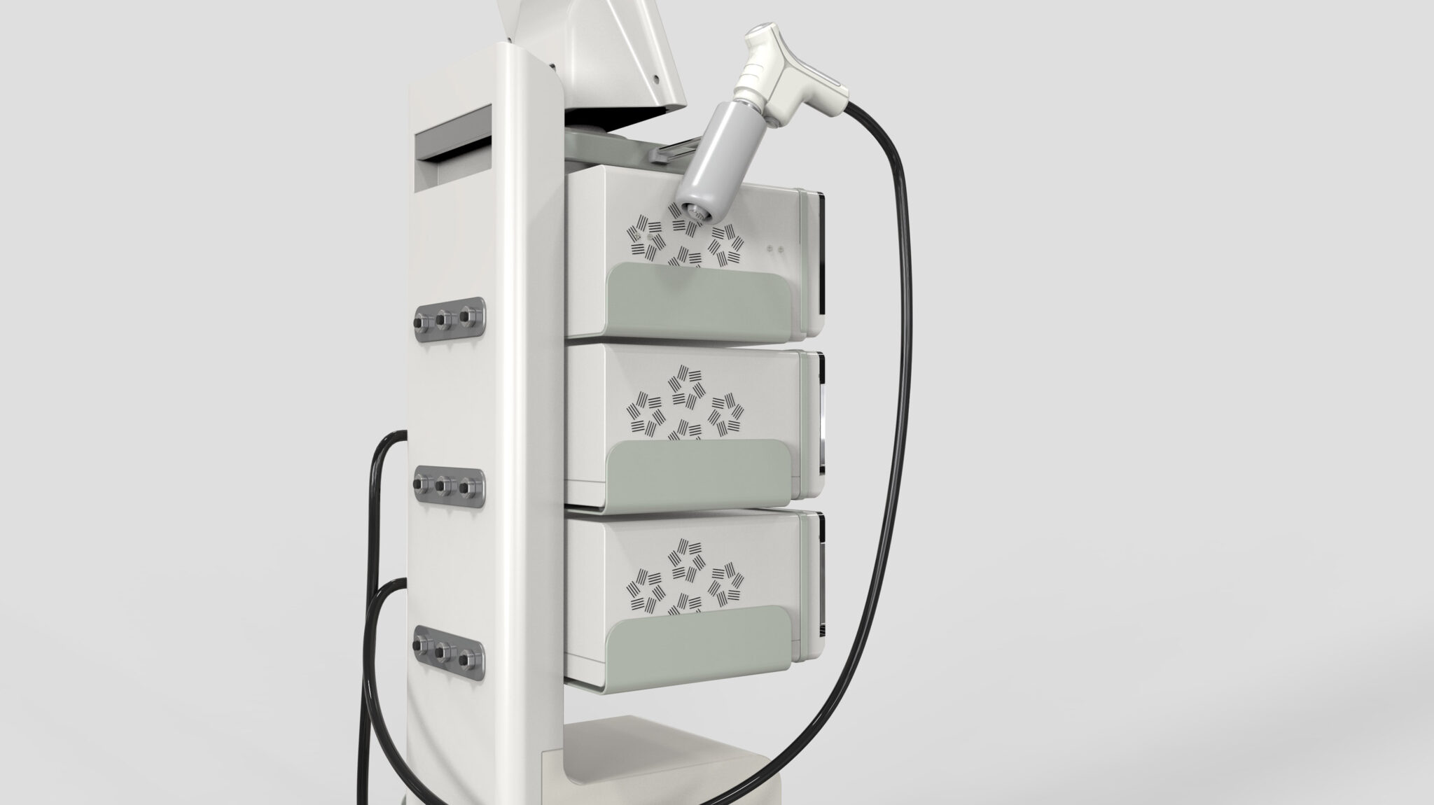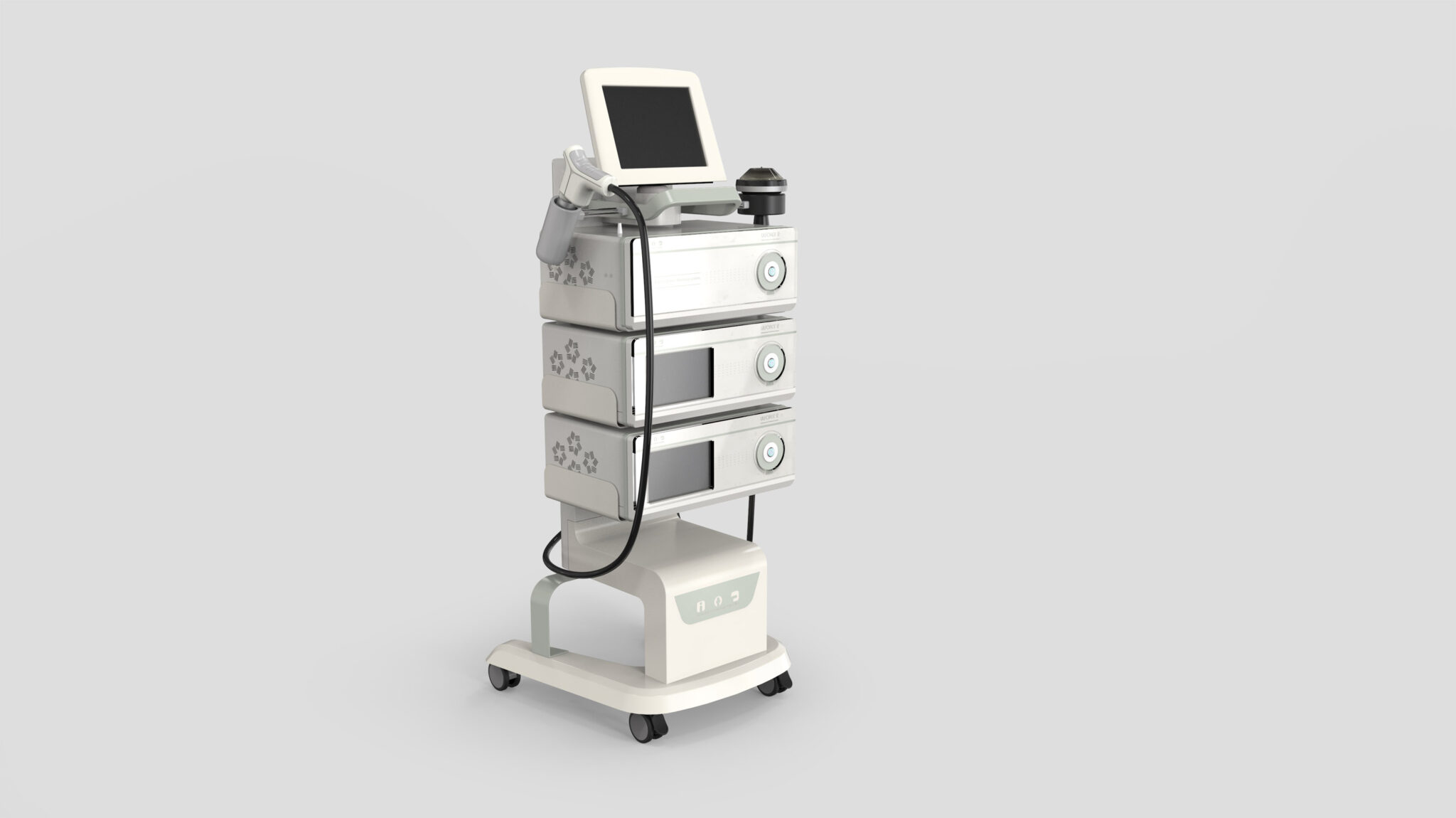 The front of each module is unified with soft rounded square shapes, softening the coldness of technical equipment and providing a stable, friendly impression in medical environments. Repeated vent patterns on the surface function both as thermal control and as graphic elements symbolizing energy delivery and wave characteristics, strengthening the brand identity. Handpieces are positioned at the top for immediate access, and cable paths are designed with a natural drop line to minimize obstructions during procedures.