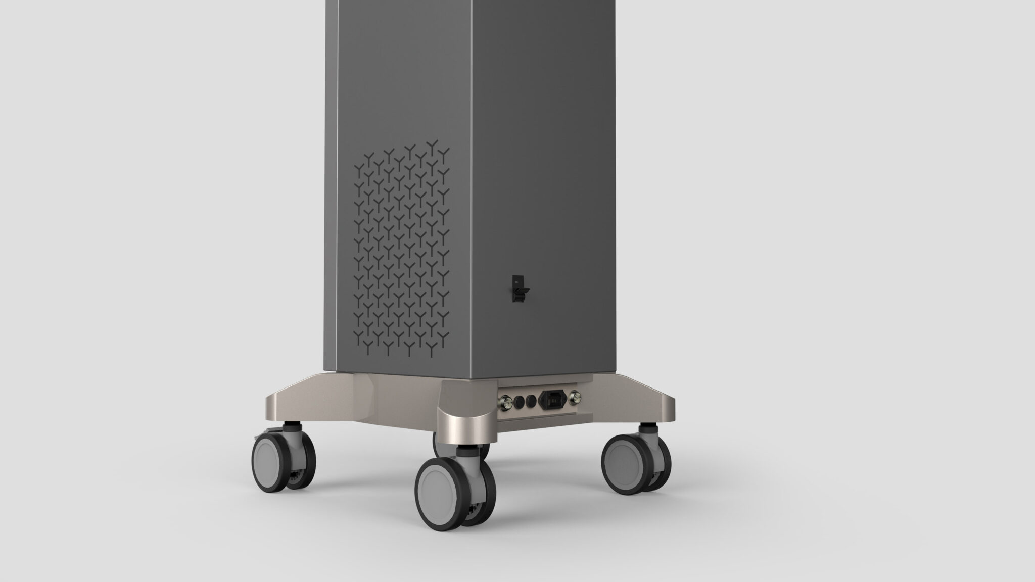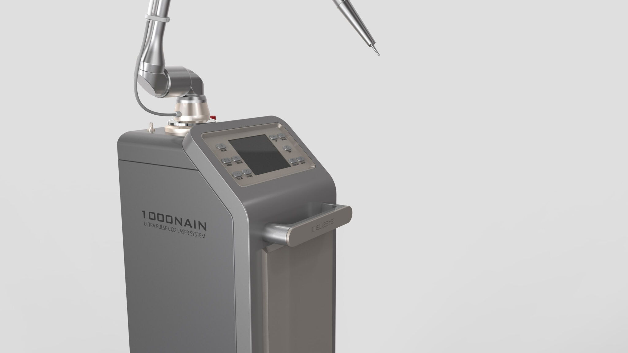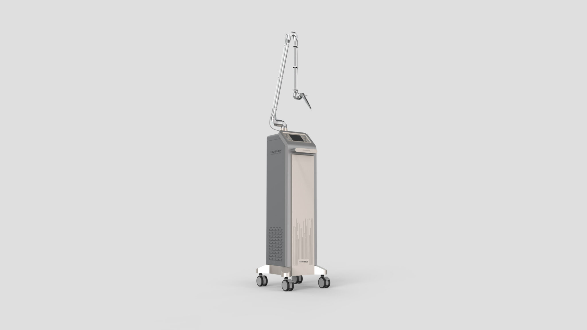 This design is centered on the Precision Clinical Device concept, visually representing the accuracy and safety of laser procedures. The slim vertical body minimizes its footprint while maintaining a stable form that serves as a focused point in medical settings, achieving a balanced proportion that ensures presence without obstructing the workspace.