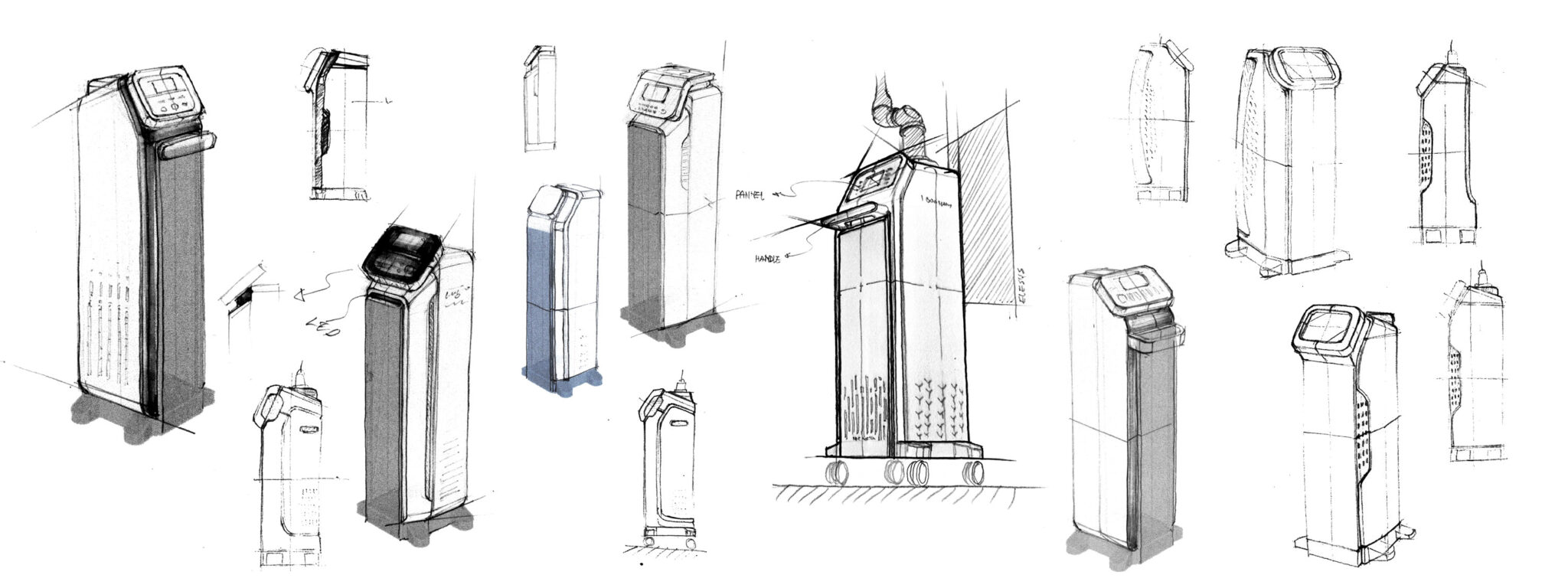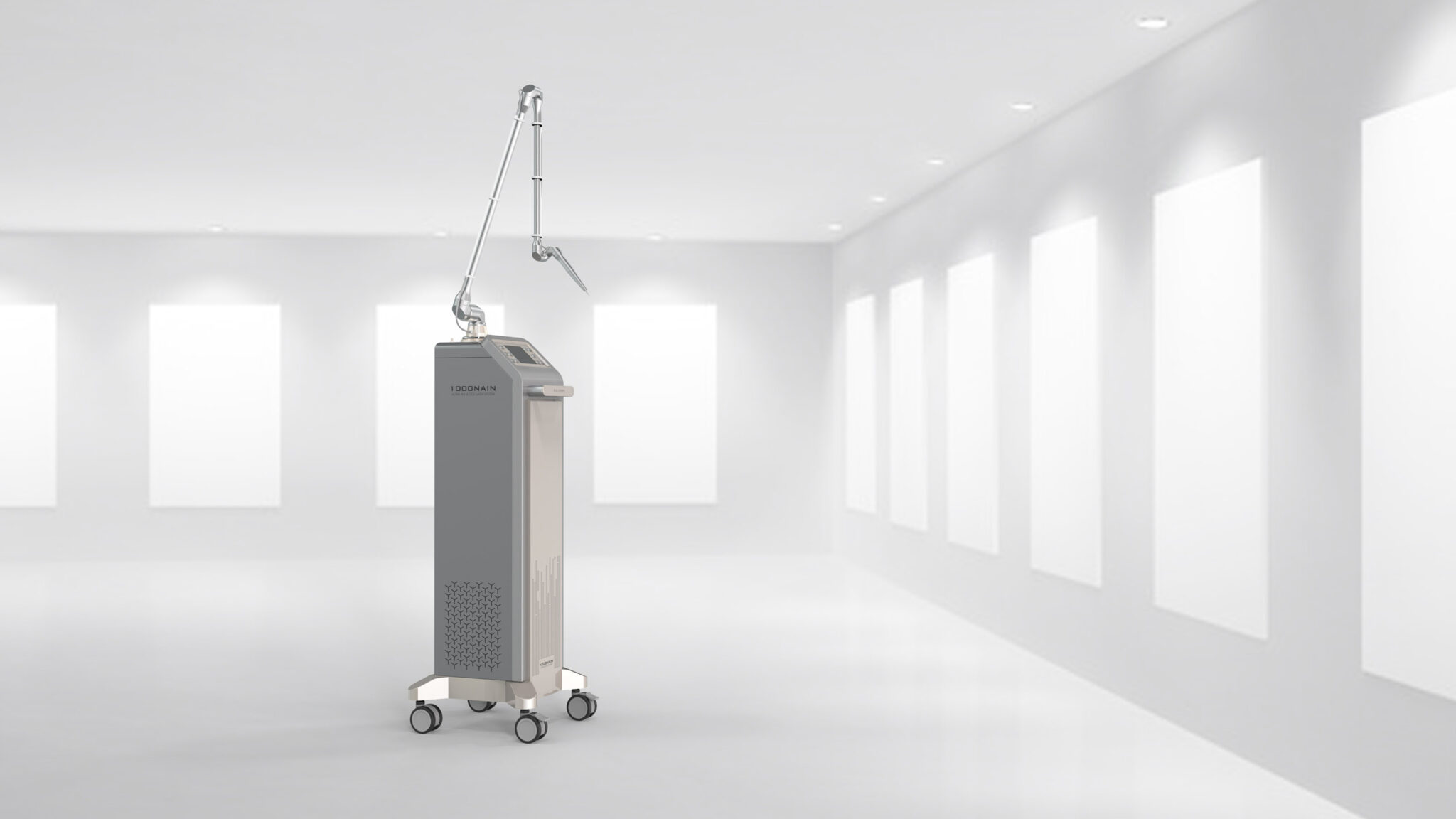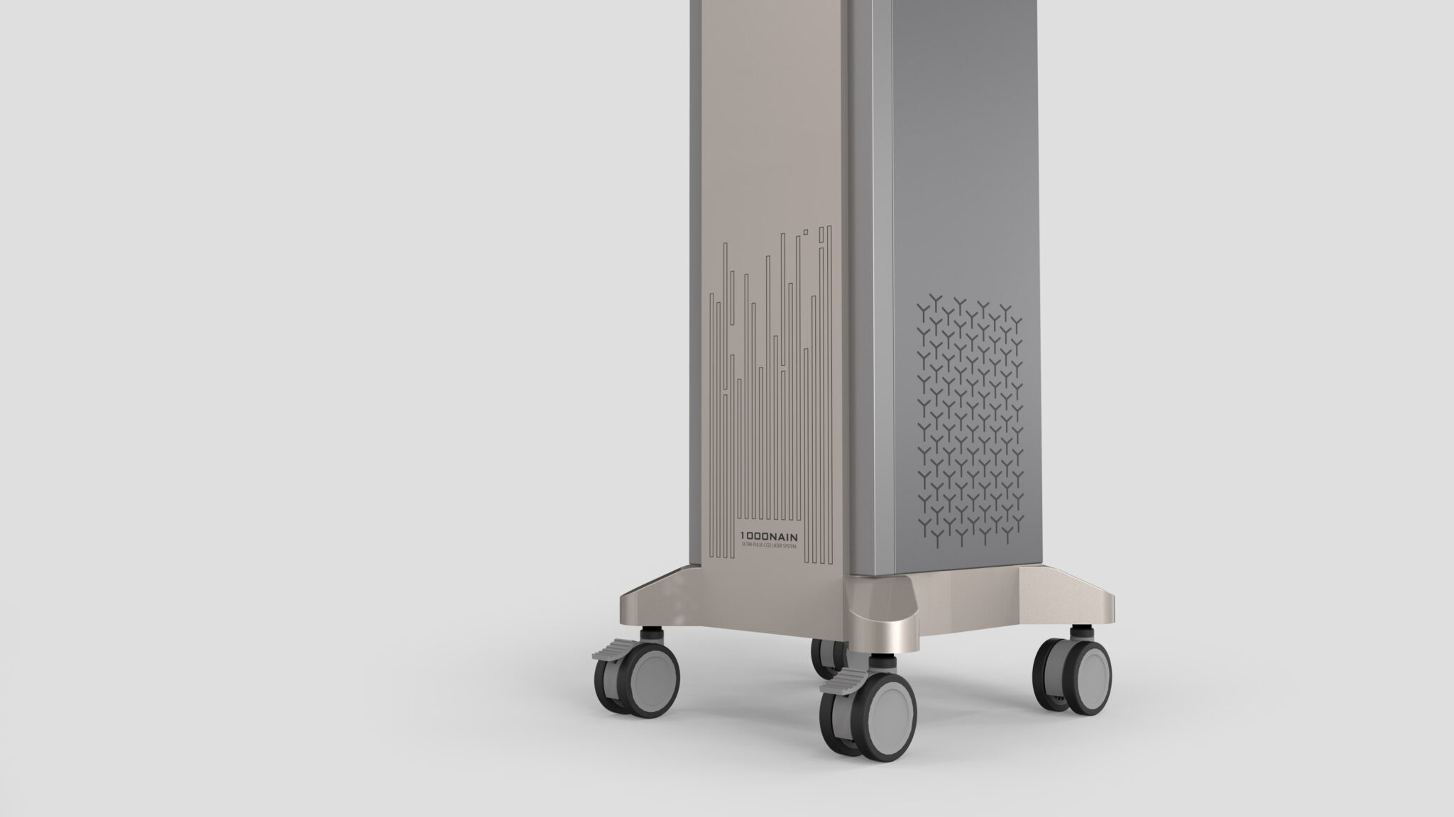 This design is centered on the Precision Clinical Device concept, visually representing the accuracy and safety of laser procedures. The slim vertical body minimizes its footprint while maintaining a stable form that serves as a focused point in medical settings, achieving a balanced proportion that ensures presence without obstructing the workspace.