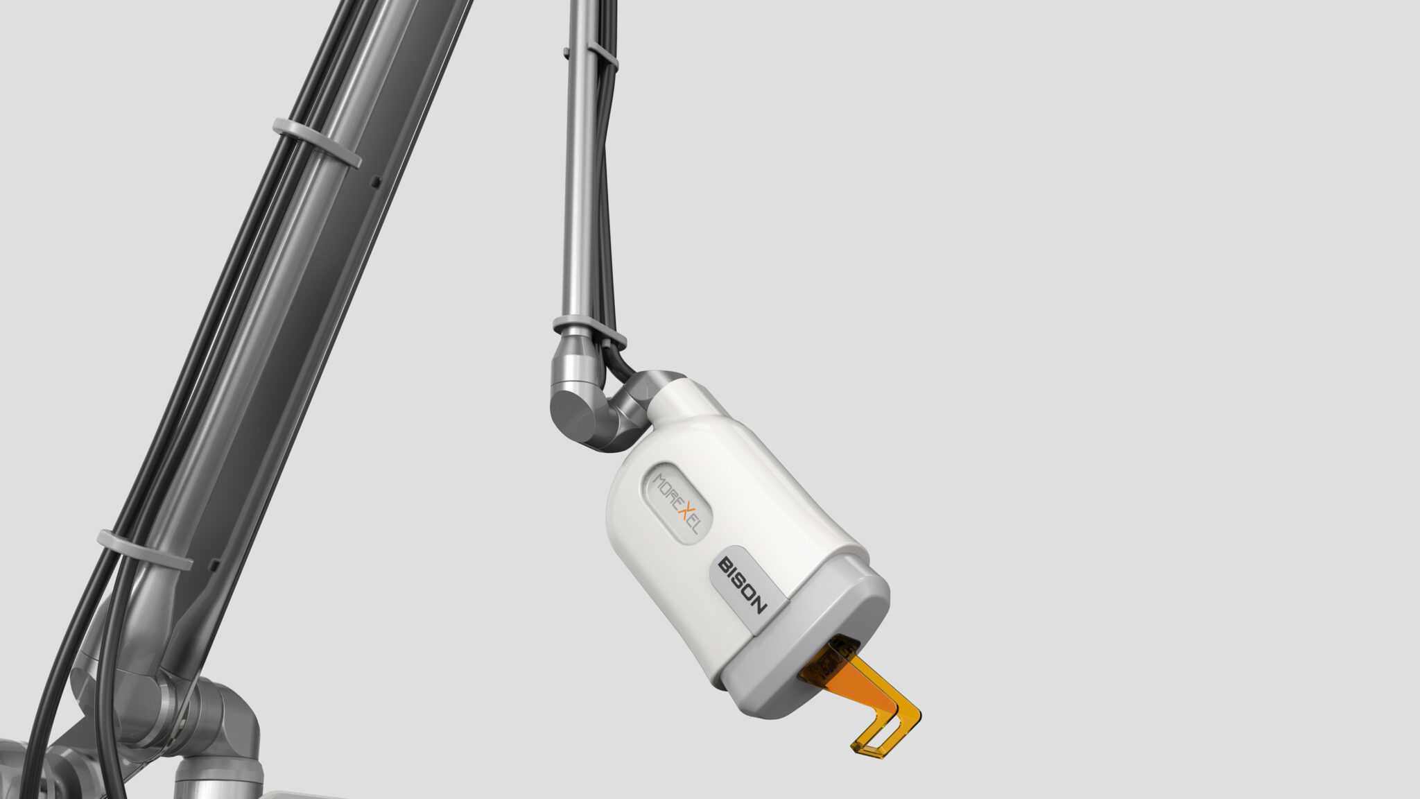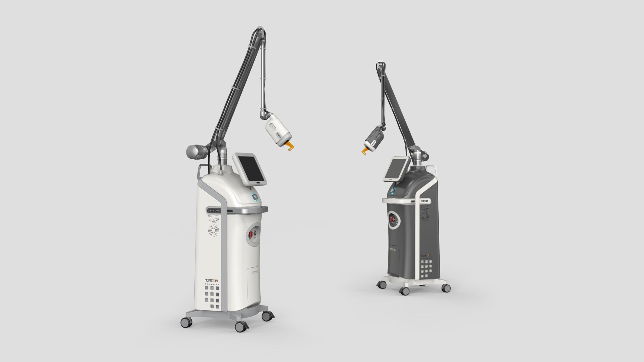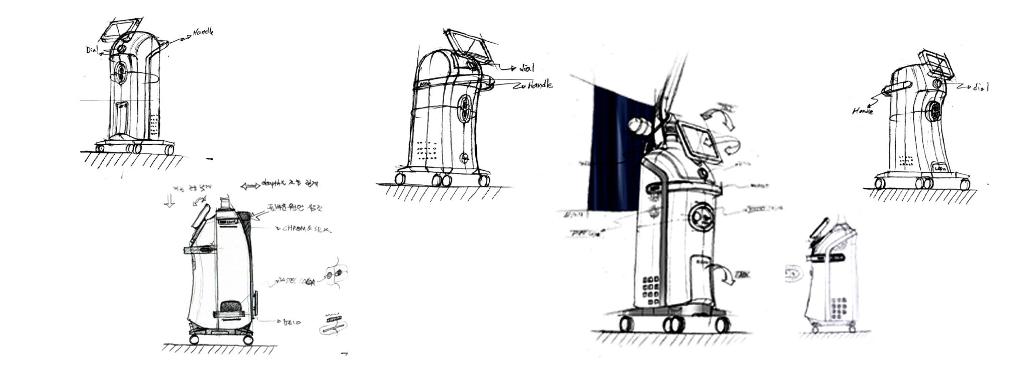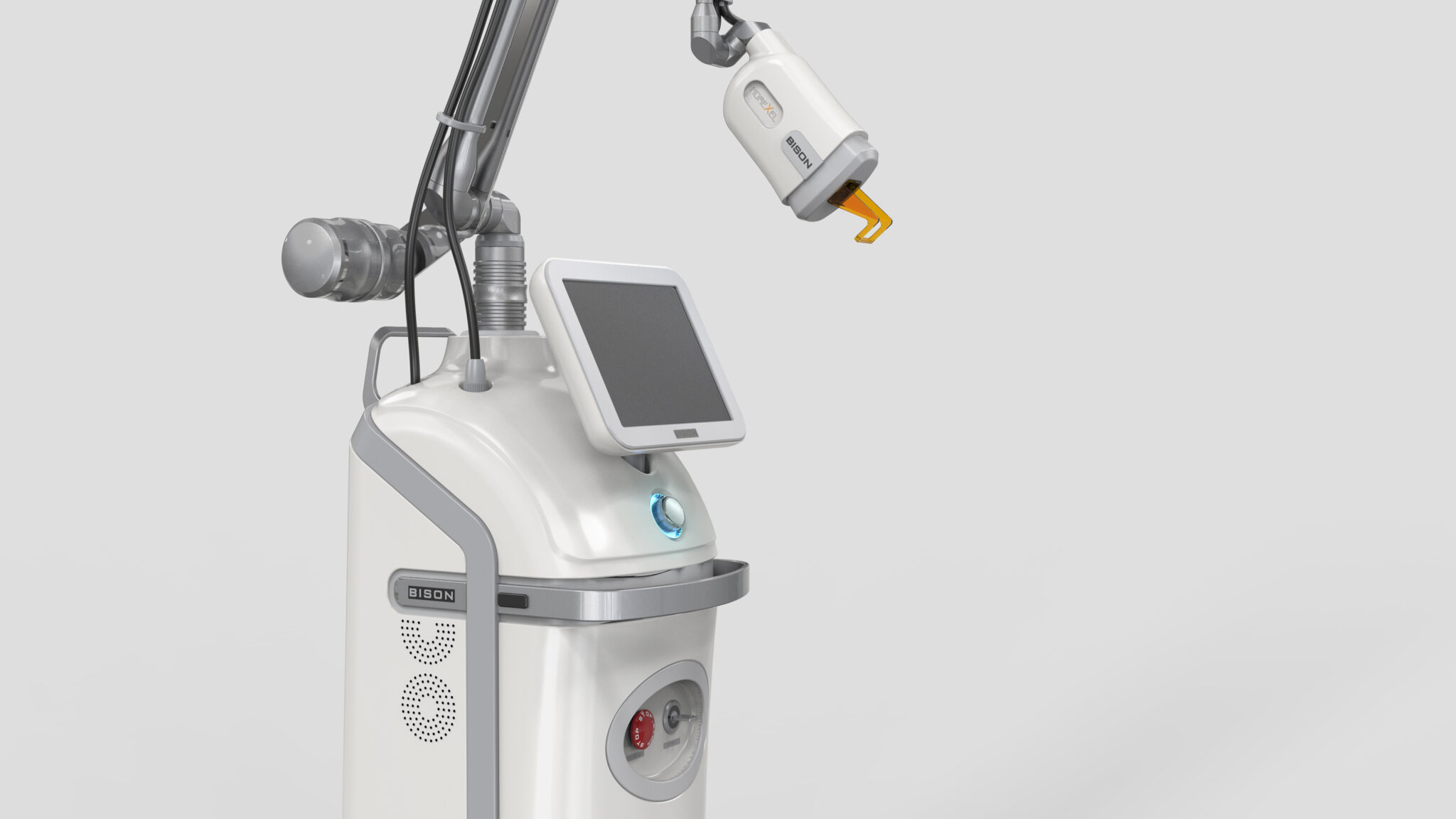 This Fractional RF laser system is designed around the core concept of Precision & Stability. The overall Slim Vertical Body minimizes its spatial footprint while emphasizing the Cleanliness, Professionalism, and Modernity essential for medical equipment. By combining a rounded, gentle medical silhouette with metallic technical details, the design symbolically expresses premium RF technology through the contrasting language of Soft Medical Contour + Technical Sharpness.