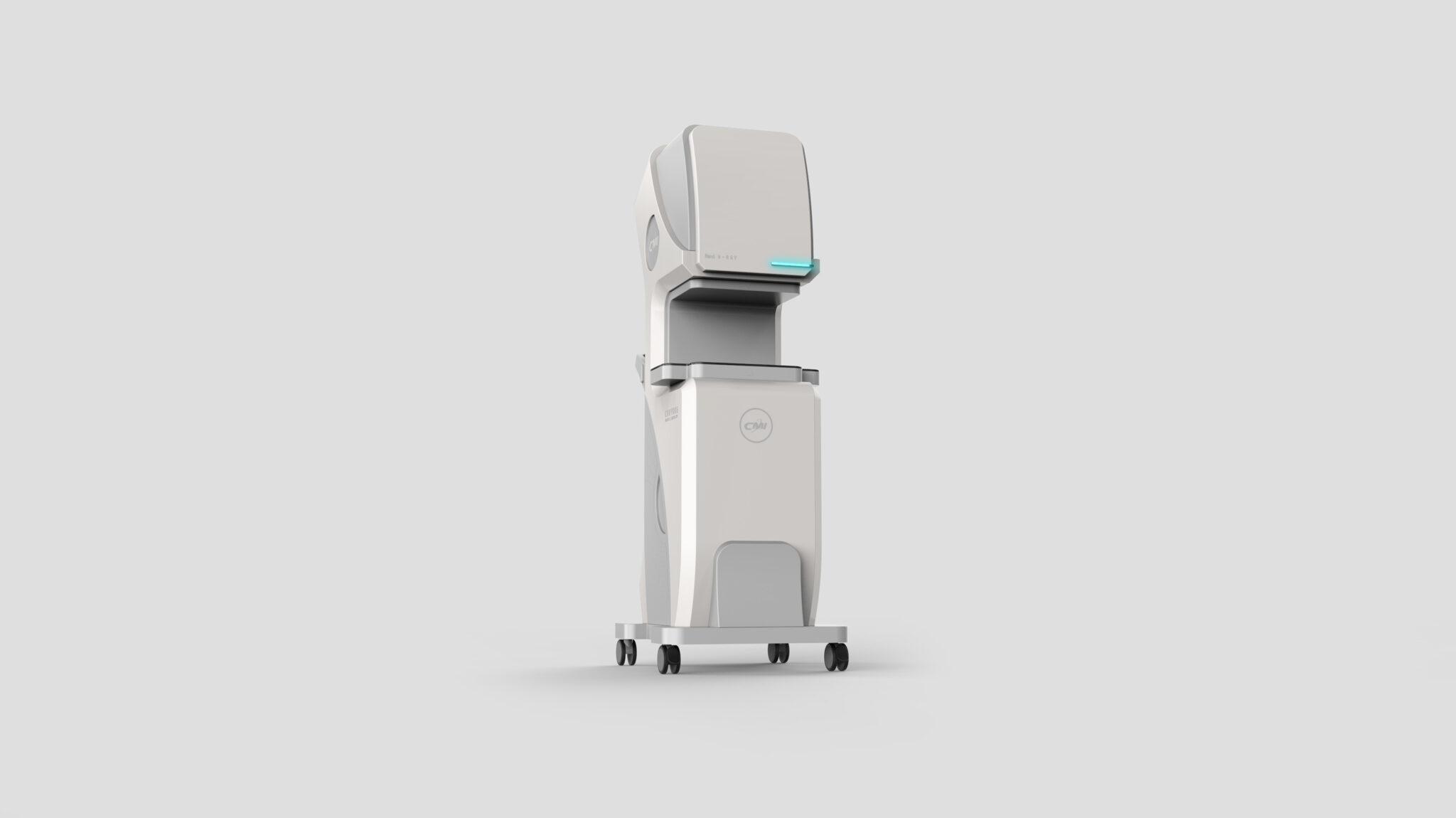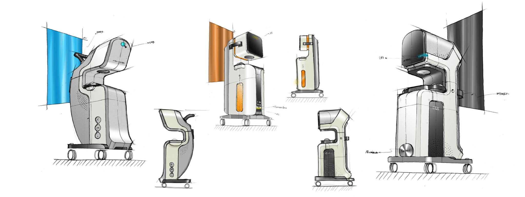 The body combines curves and straight lines in restrained proportions to provide a gentle familiarity while concealing technical complexity, simultaneously emphasizing hygiene and formal minimalism in hospital environments. The stable base structure, which widens toward the bottom, balances mobility and stability. The overall silhouette is refined into a simple object that blends naturally into space. Subtle graphic lines on the sides reinforce brand identity and establish a Reliable Design Language for medical equipment.