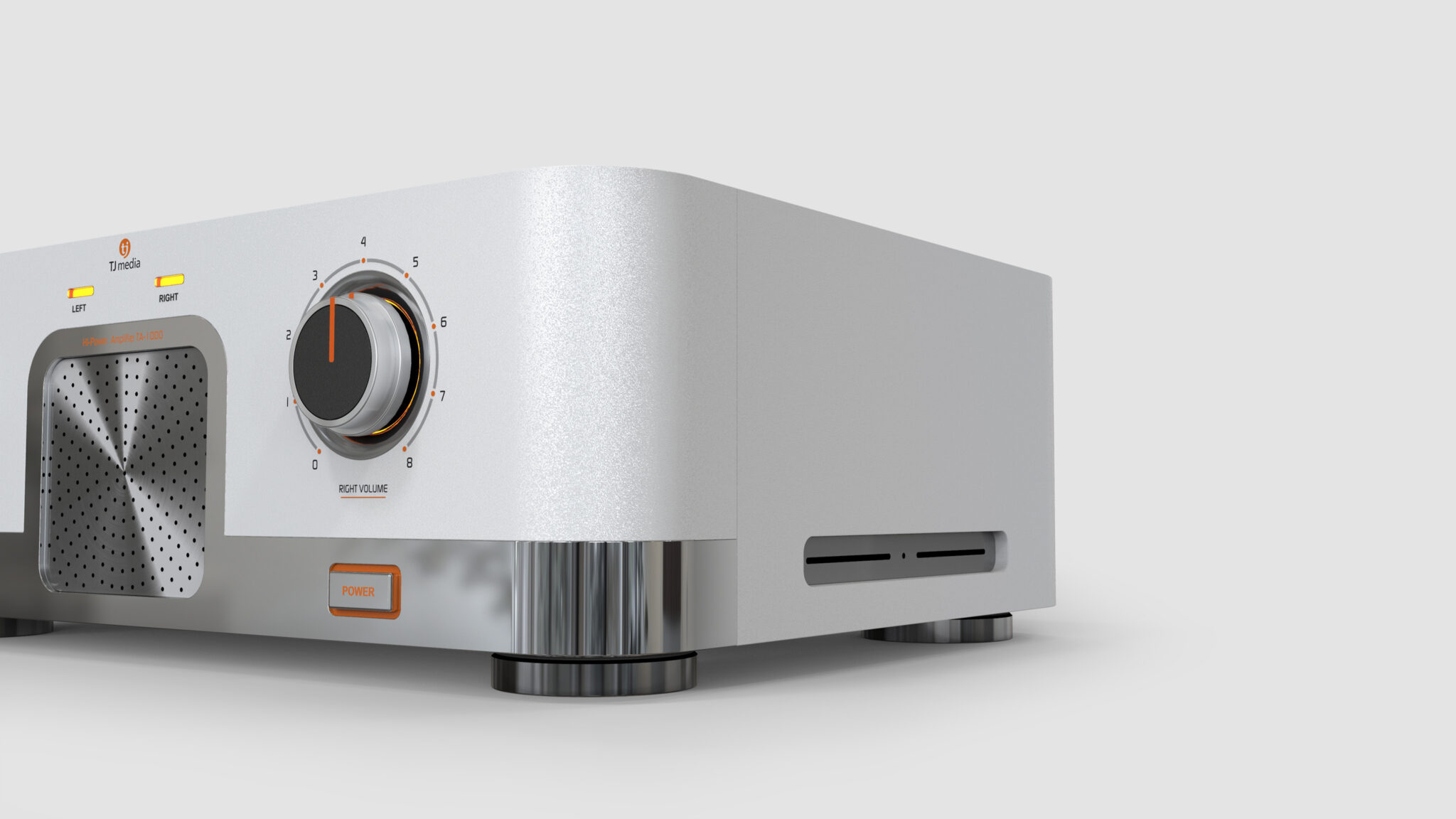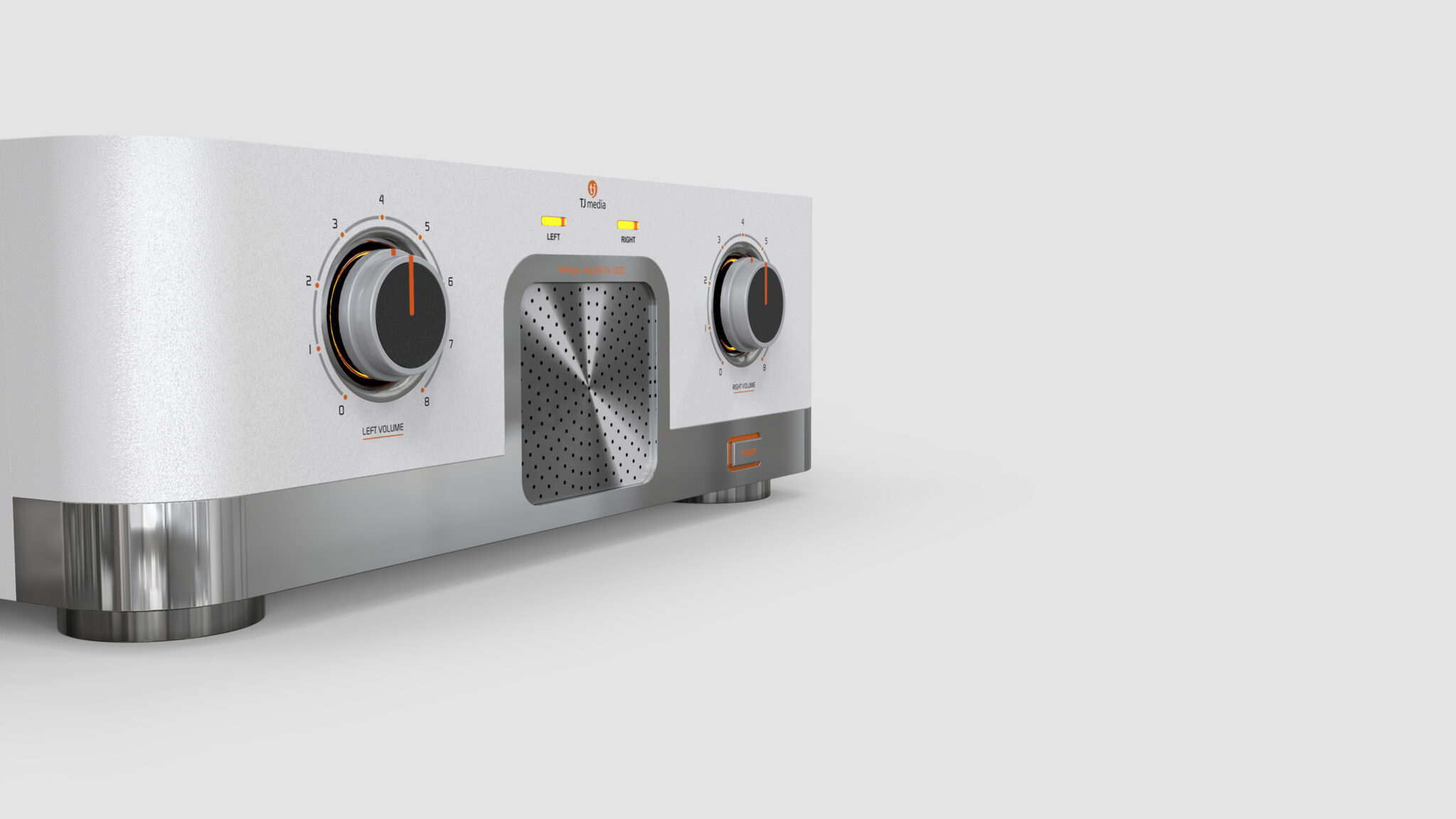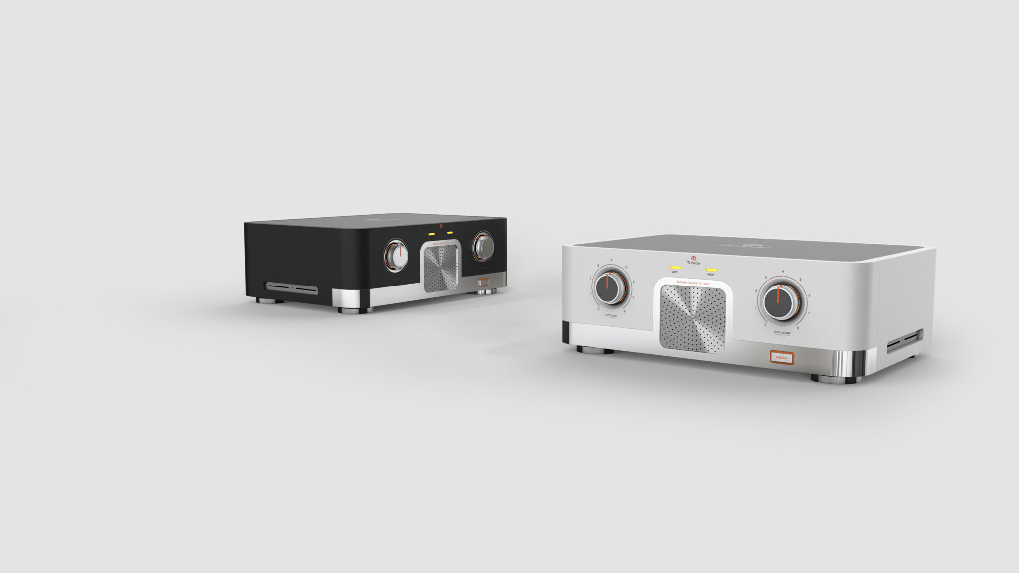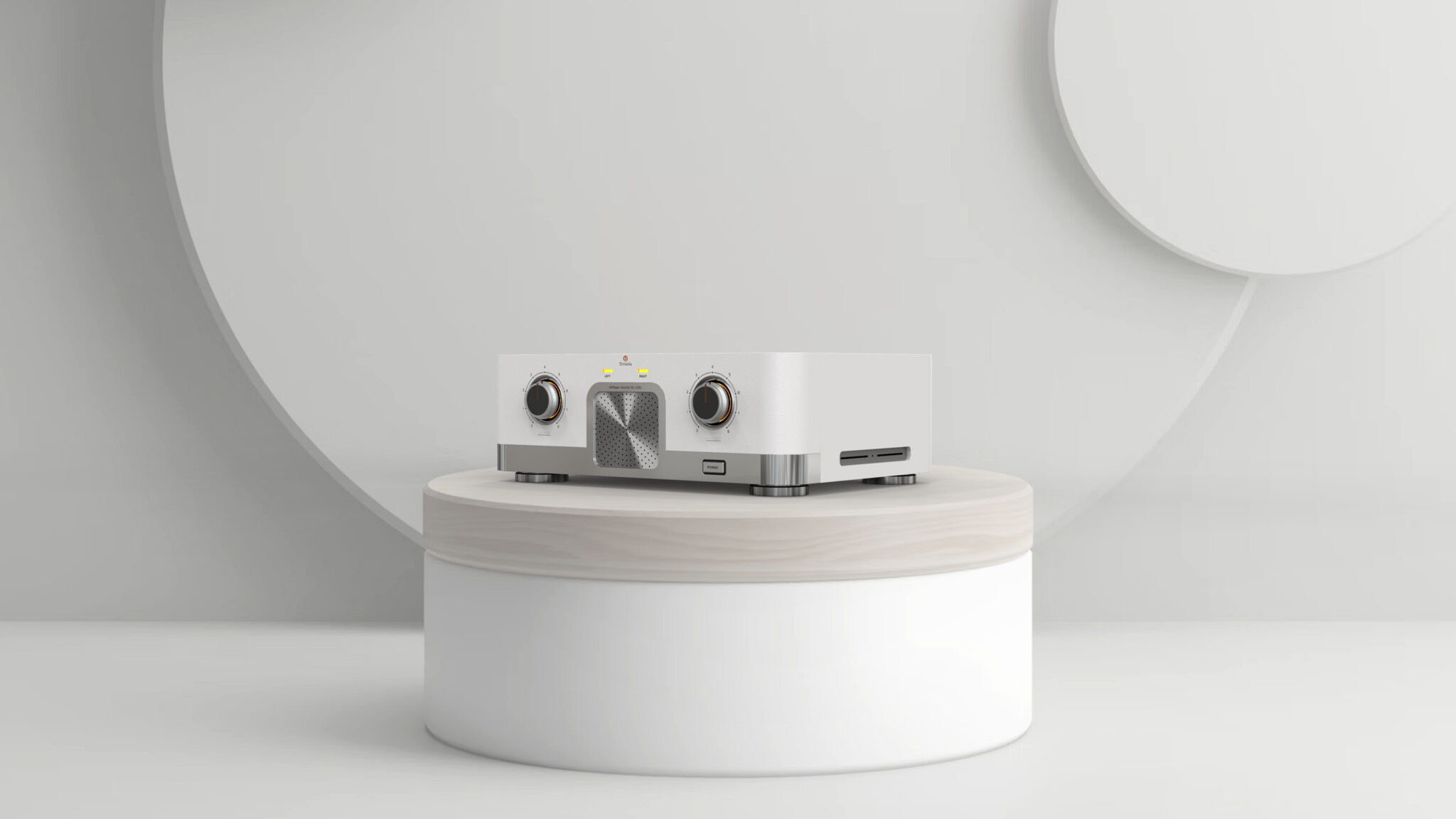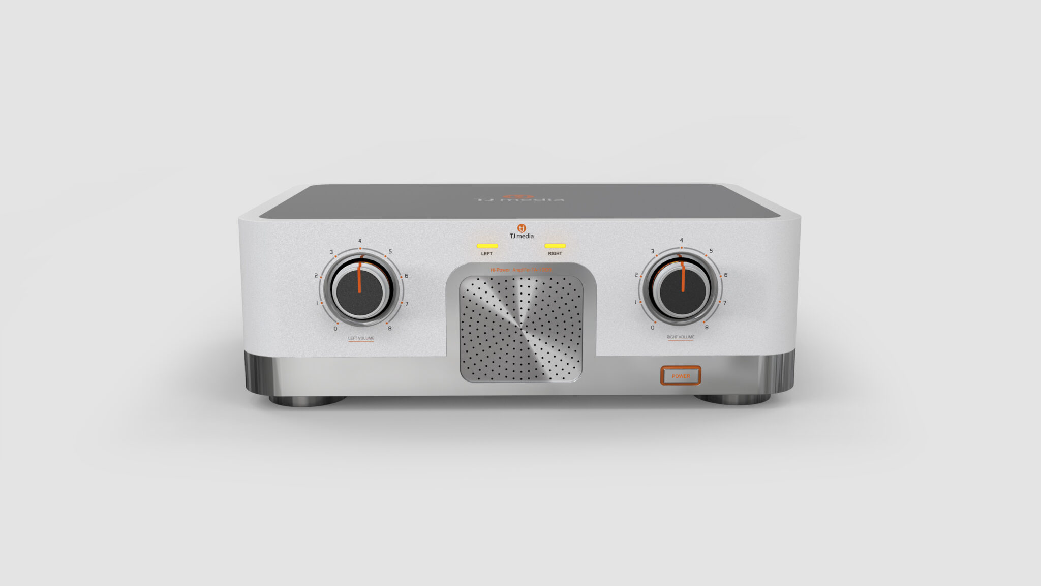 The Two Large Volume Knobs on the front maintain the symbolism of high-end audio while adding a modern touch with chrome bezels and restrained indicators. The central Metal Punching Grill visualizes the stability of the internal acoustic structure and acts as a key focal point that balances the device.