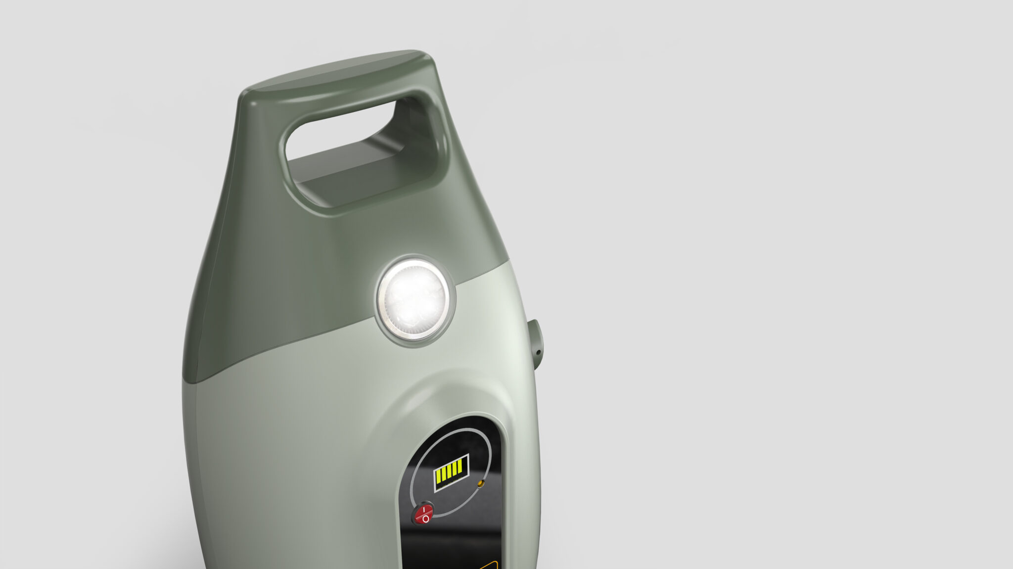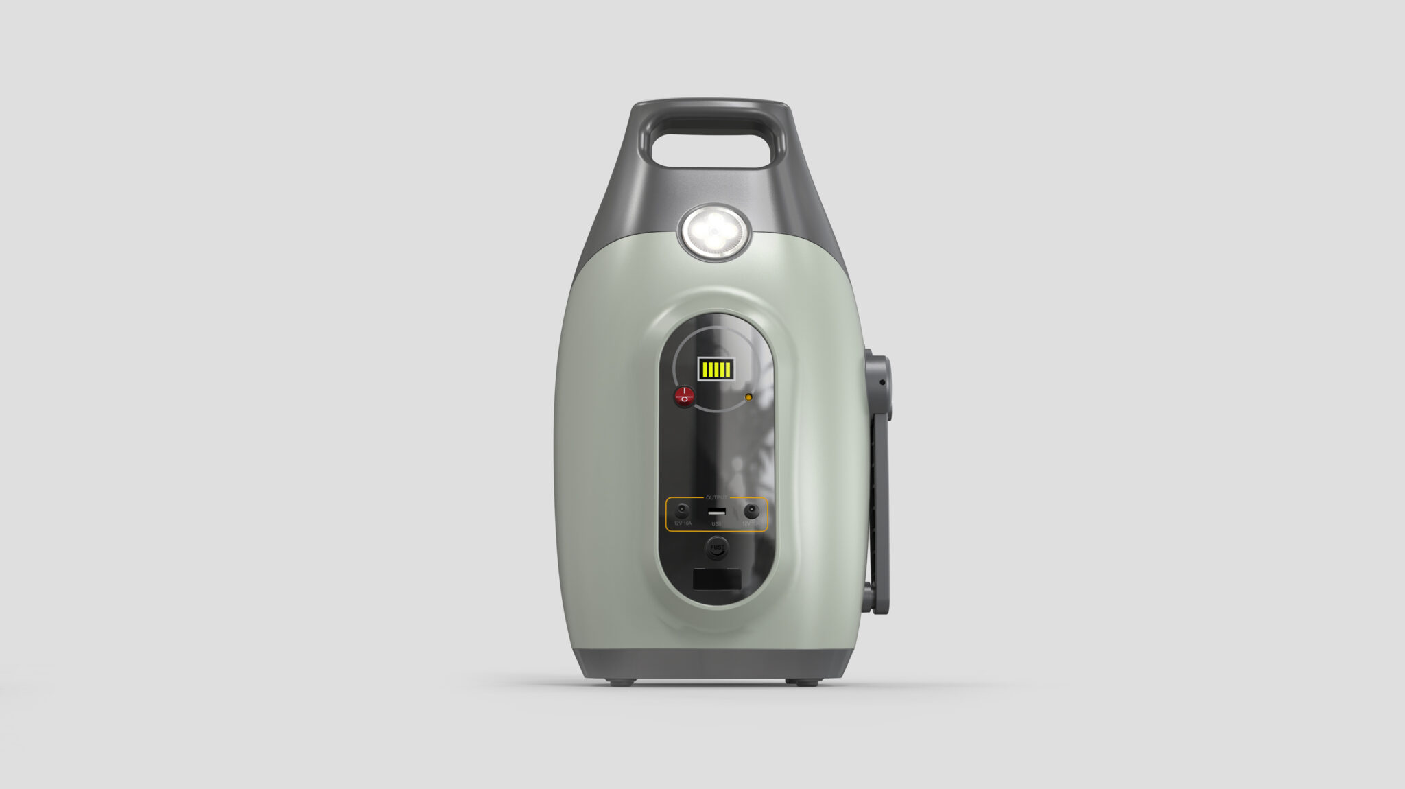 The wide, sturdy handle on top is structured for a natural finger wrap, ensuring an Ergonomically Comfortable Grip even during long-distance movement. A circular light at the top enhances utility for camping or emergencies, serving as a focal point that emphasizes the Practical Outdoor Character of the device.