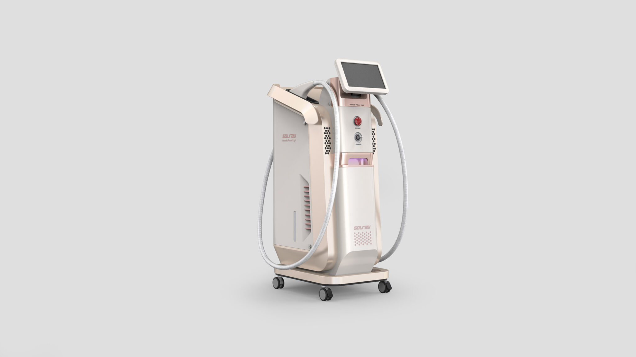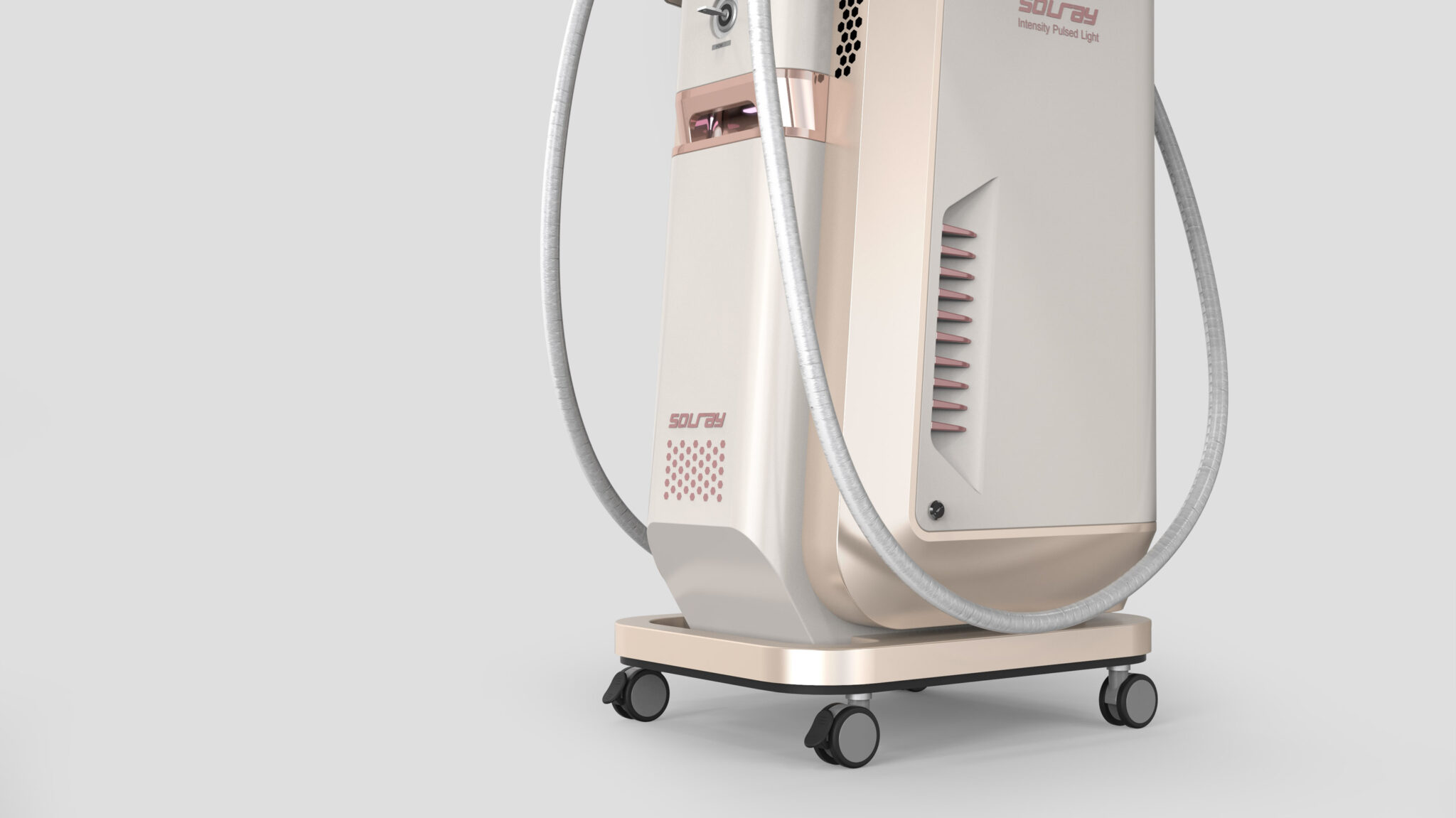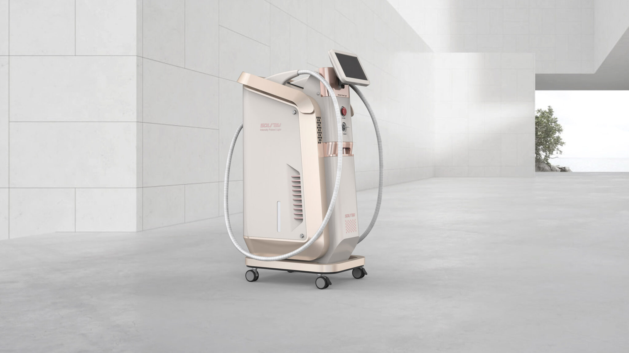 The diagonal lines on the sides and the elegant curved surfaces extending from the top emphasize the device’s slim and refined volume. This ensures that users feel a comfortable familiarity rather than mechanical intimidation when moving around or operating the equipment. The color scheme utilizes a combination of rose gold metallic and ivory matte, moving away from the cold image of traditional medical devices to complete a soft luxury tone reminiscent of high-end cosmetics.