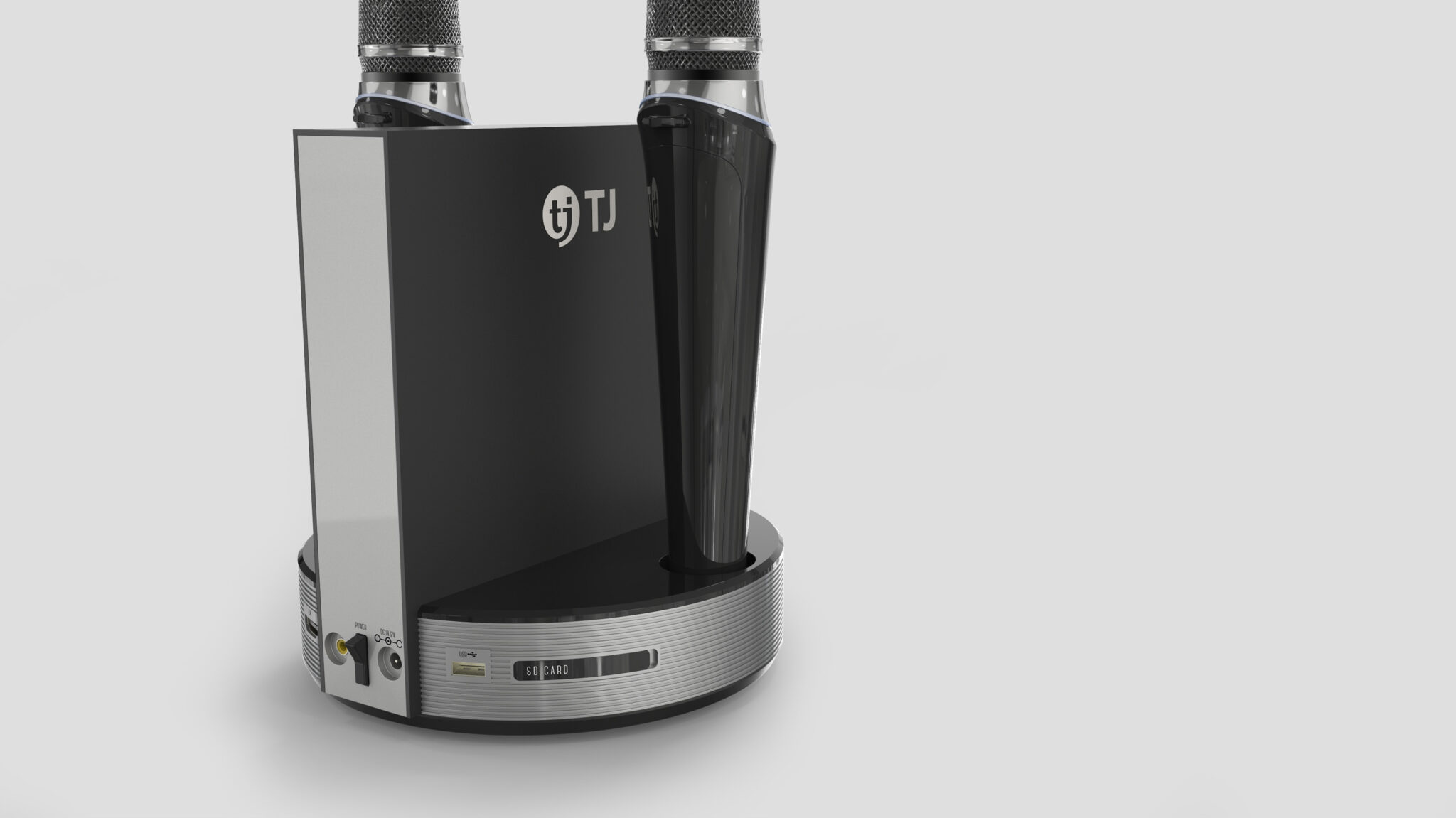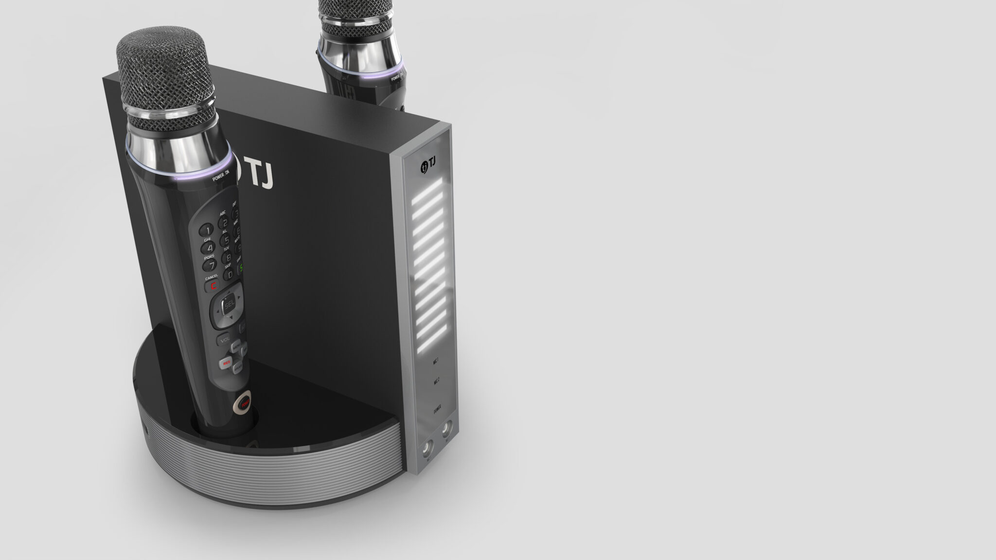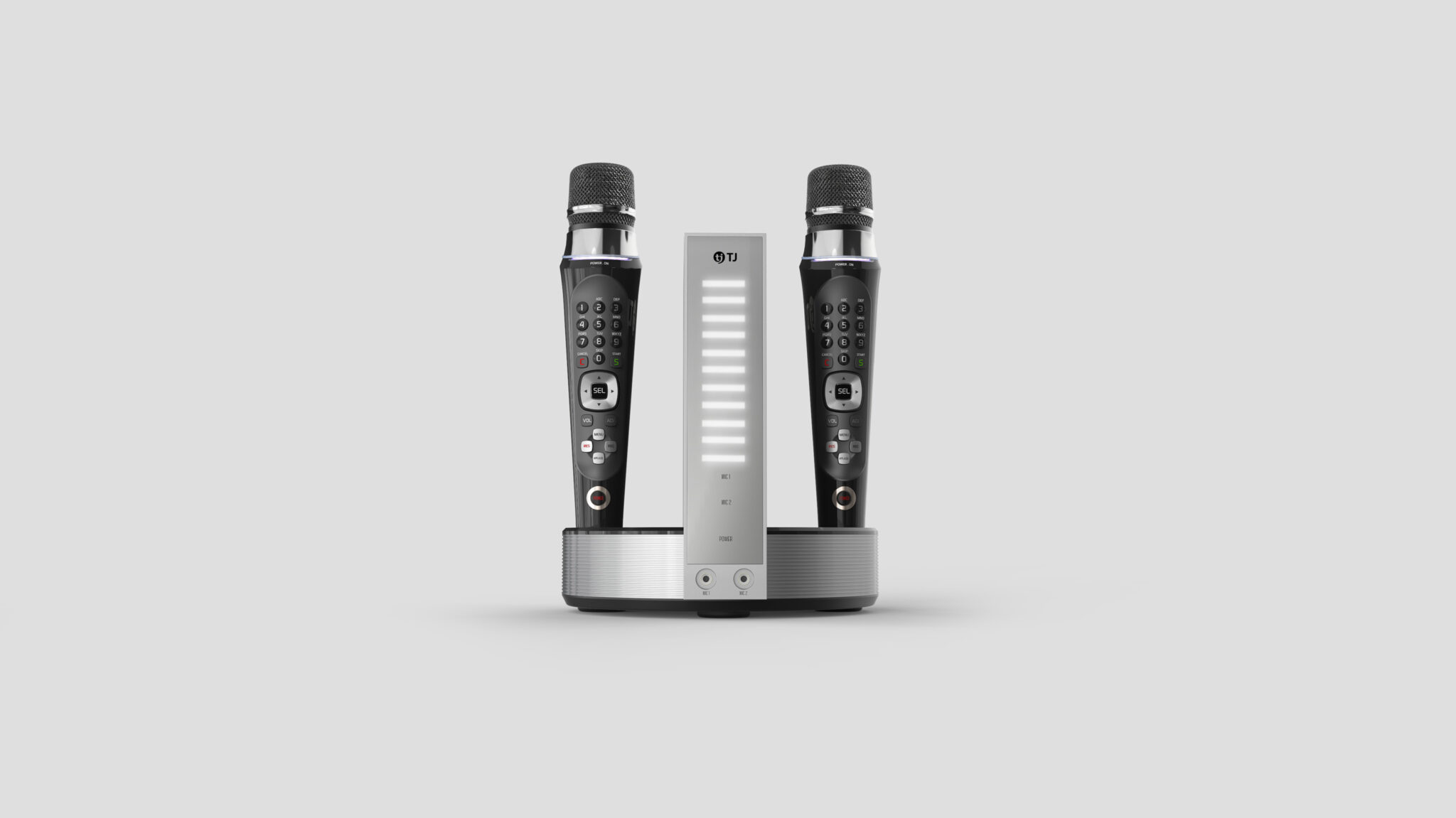 The most significant sculptural feature is that when the microphones are docked, the entire system achieves Vertical Balance and Symmetry, appearing as a single Sound Tower. This is an Aesthetic and Branding Design Strategy that allows the device to function as an audio object in a space even when not in use. The lower base, treated with a circular rib pattern, delivers 360-Degree Stability and functions as an element that visualizes the rhythm and energy unique to acoustic devices.