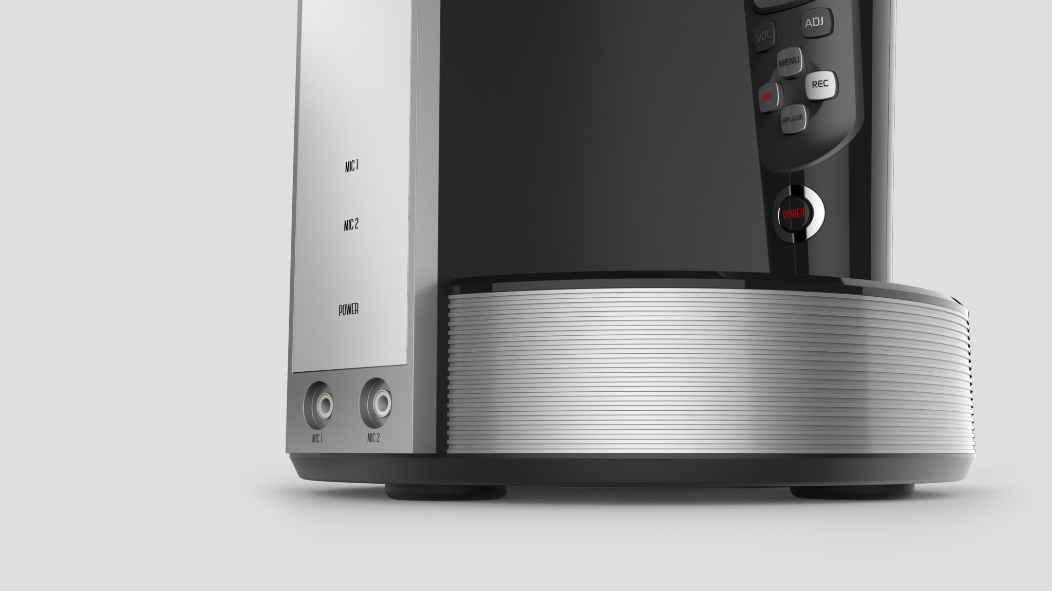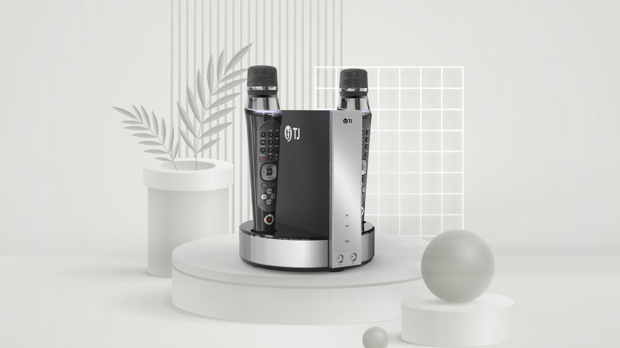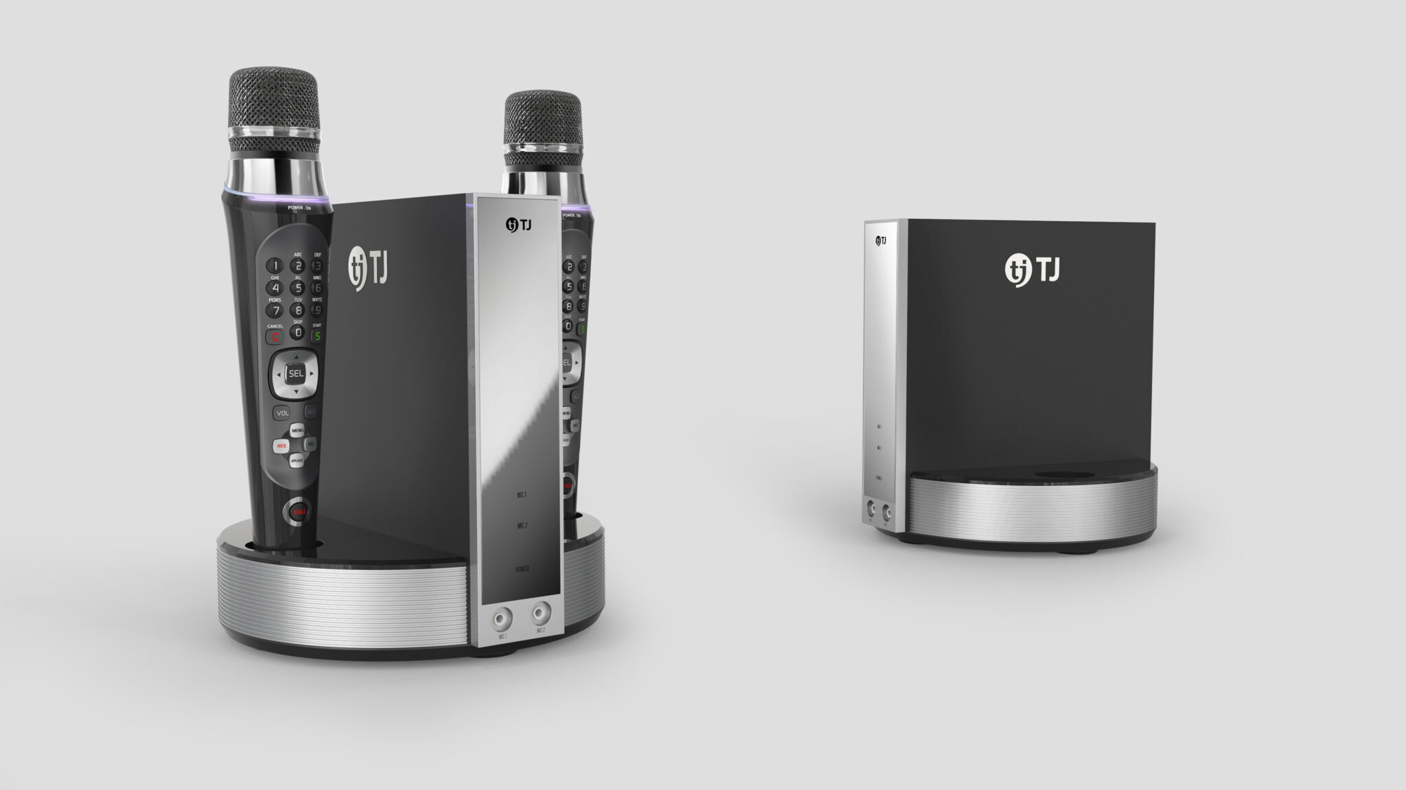 The most significant sculptural feature is that when the microphones are docked, the entire system achieves Vertical Balance and Symmetry, appearing as a single Sound Tower. This is an Aesthetic and Branding Design Strategy that allows the device to function as an audio object in a space even when not in use. The lower base, treated with a circular rib pattern, delivers 360-Degree Stability and functions as an element that visualizes the rhythm and energy unique to acoustic devices.
