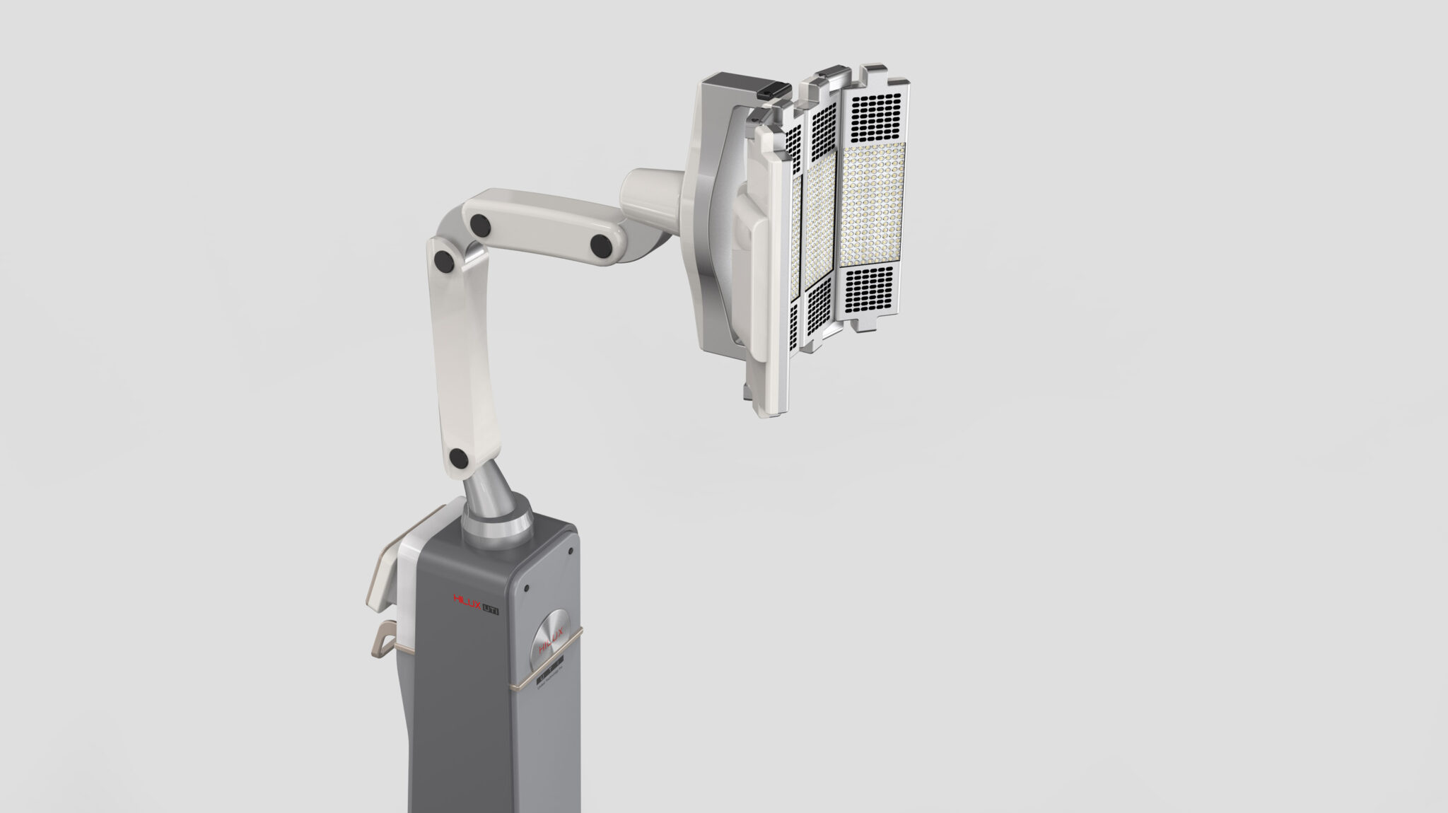 This equipment is designed around the core concept of Slim Upright + Robotic Precision, aiming to perform medical lighting tasks with greater sophistication and stability. The overall silhouette is based on a Monolithic Vertical Body, minimizing unnecessary details to emphasize the Clean and Professional qualities required of medical devices.