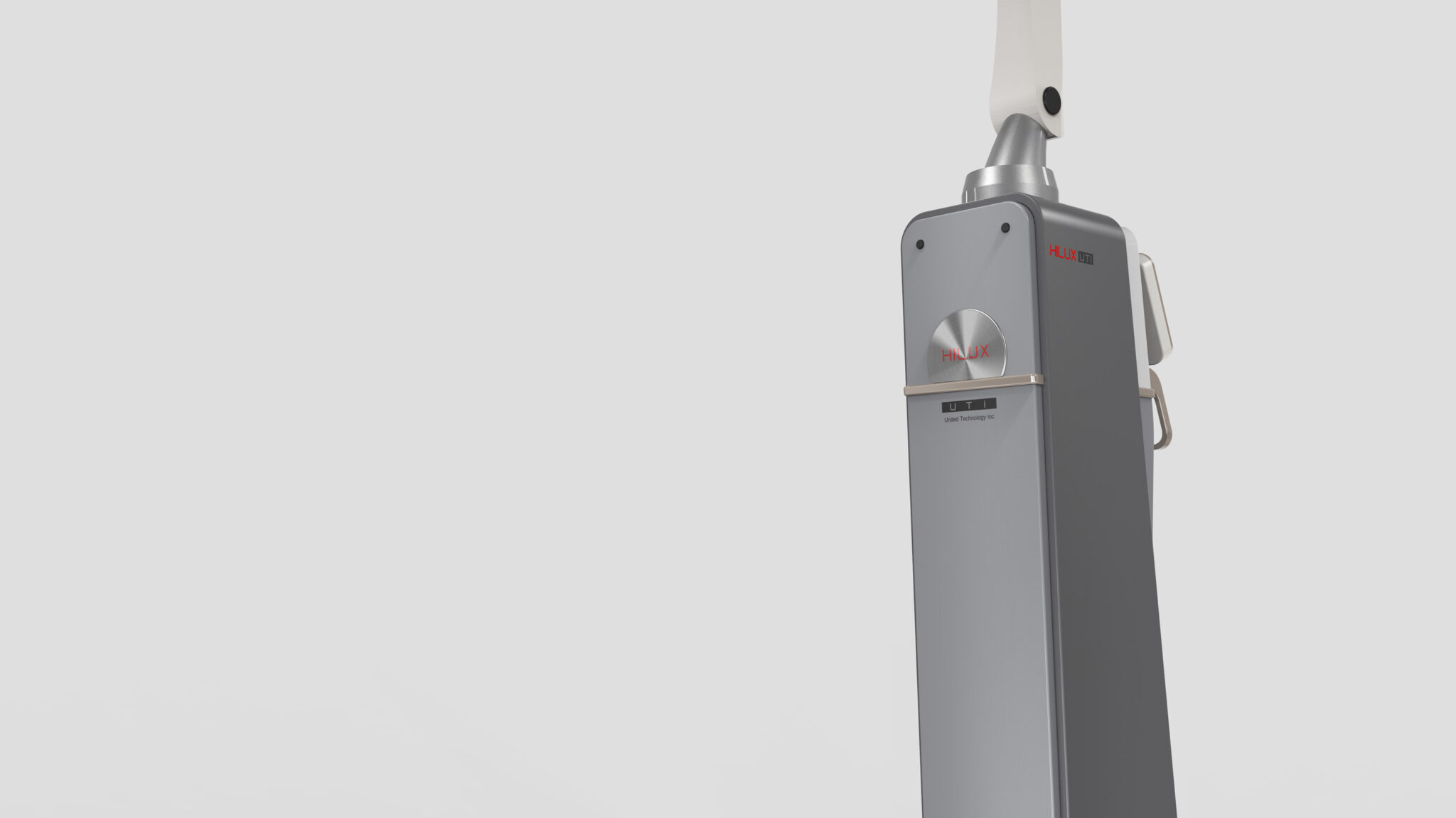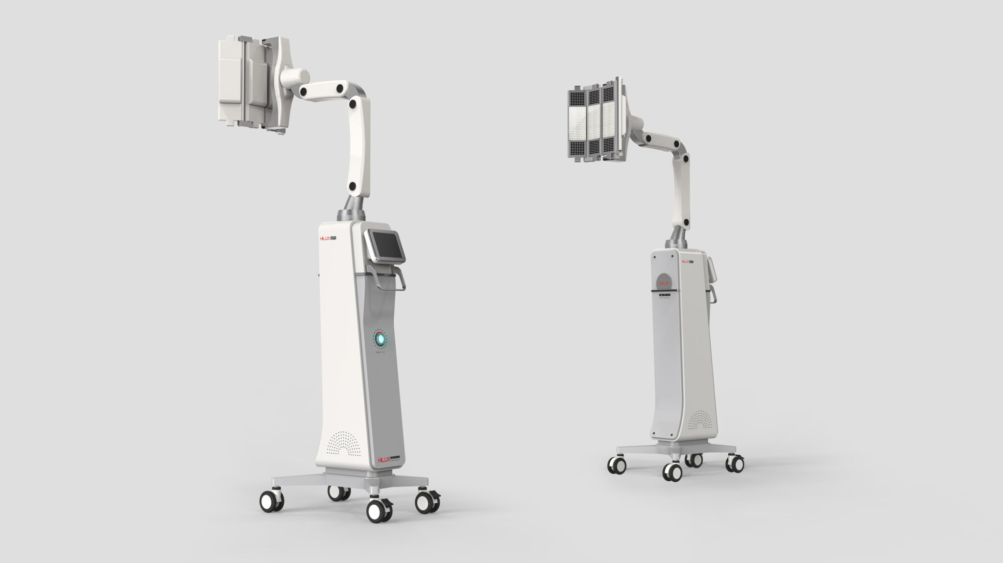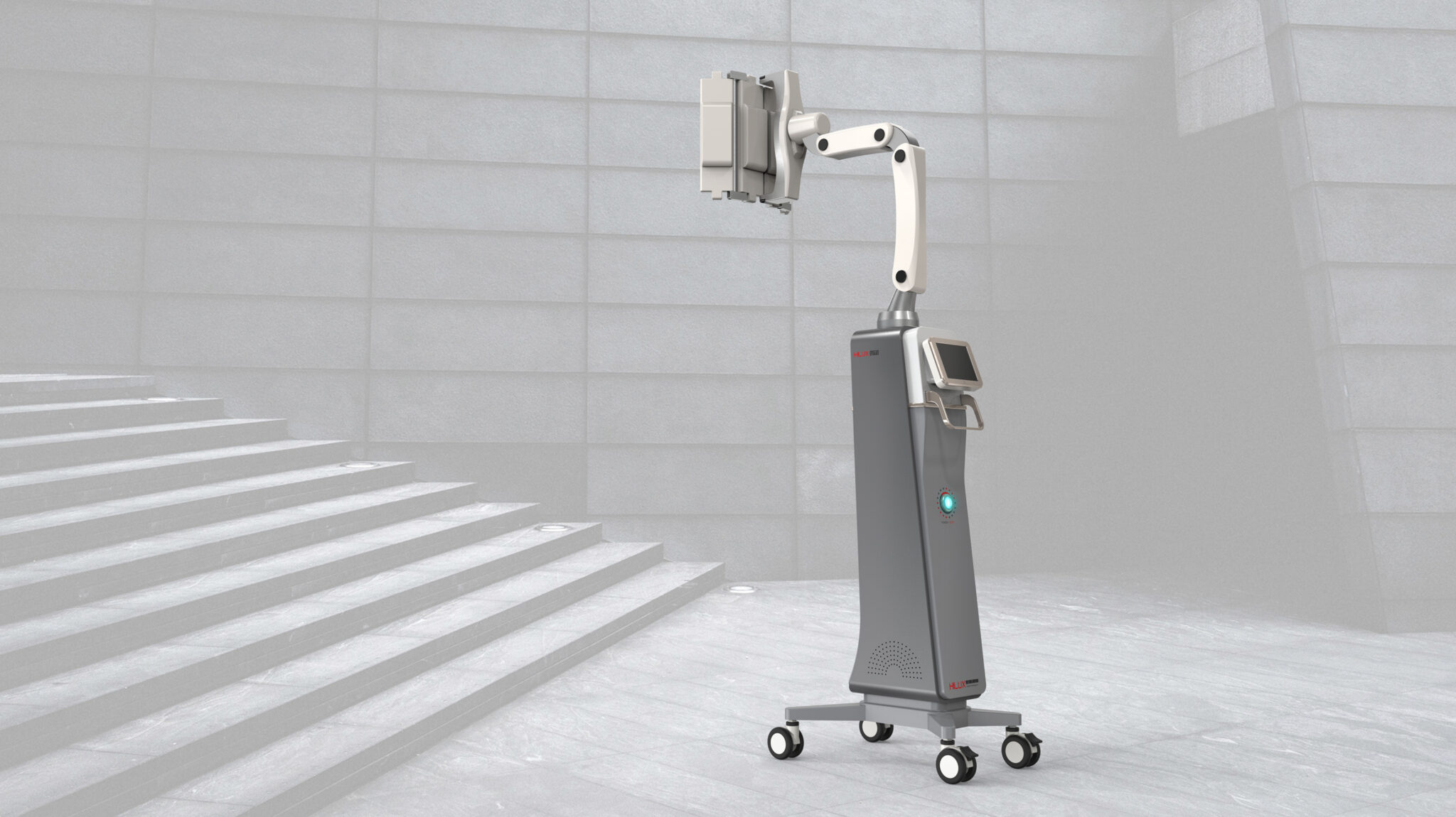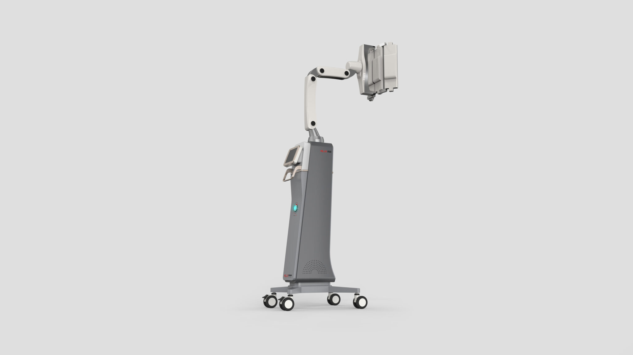 The central control panel is configured as a Tilted Extension Screen at an ergonomic angle, providing an interface tailored to the medical staff’s line of sight and hand position. The wide caster base at the bottom strengthens the overall stability of the equipment, contrasting with the slim body to ensure both mobility and firm positioning. The subtle light indicators and fine ventilation patterns represent a Function-Driven Aesthetic, sophisticatedly highlighting the device’s technical identity.