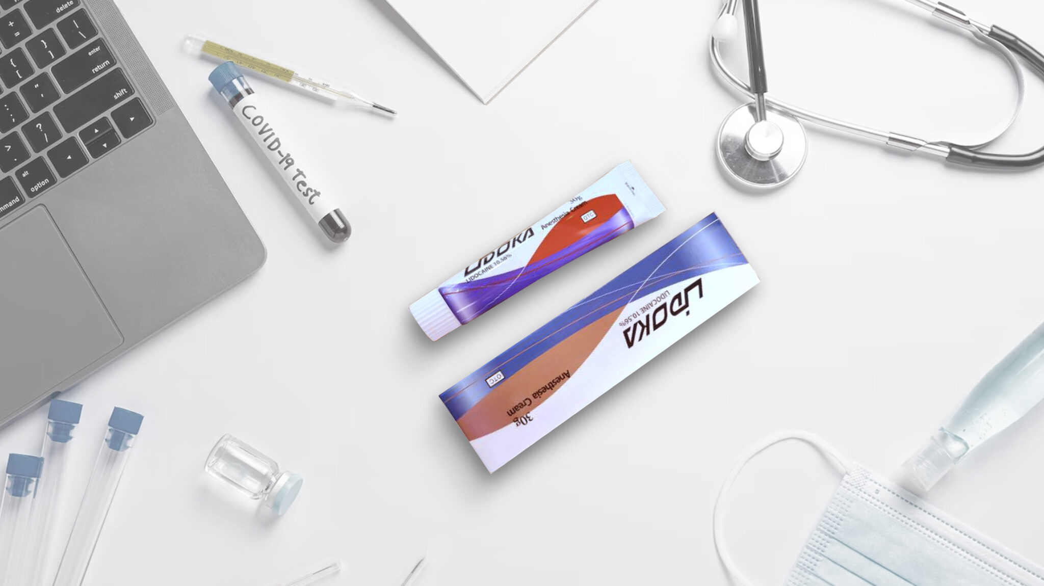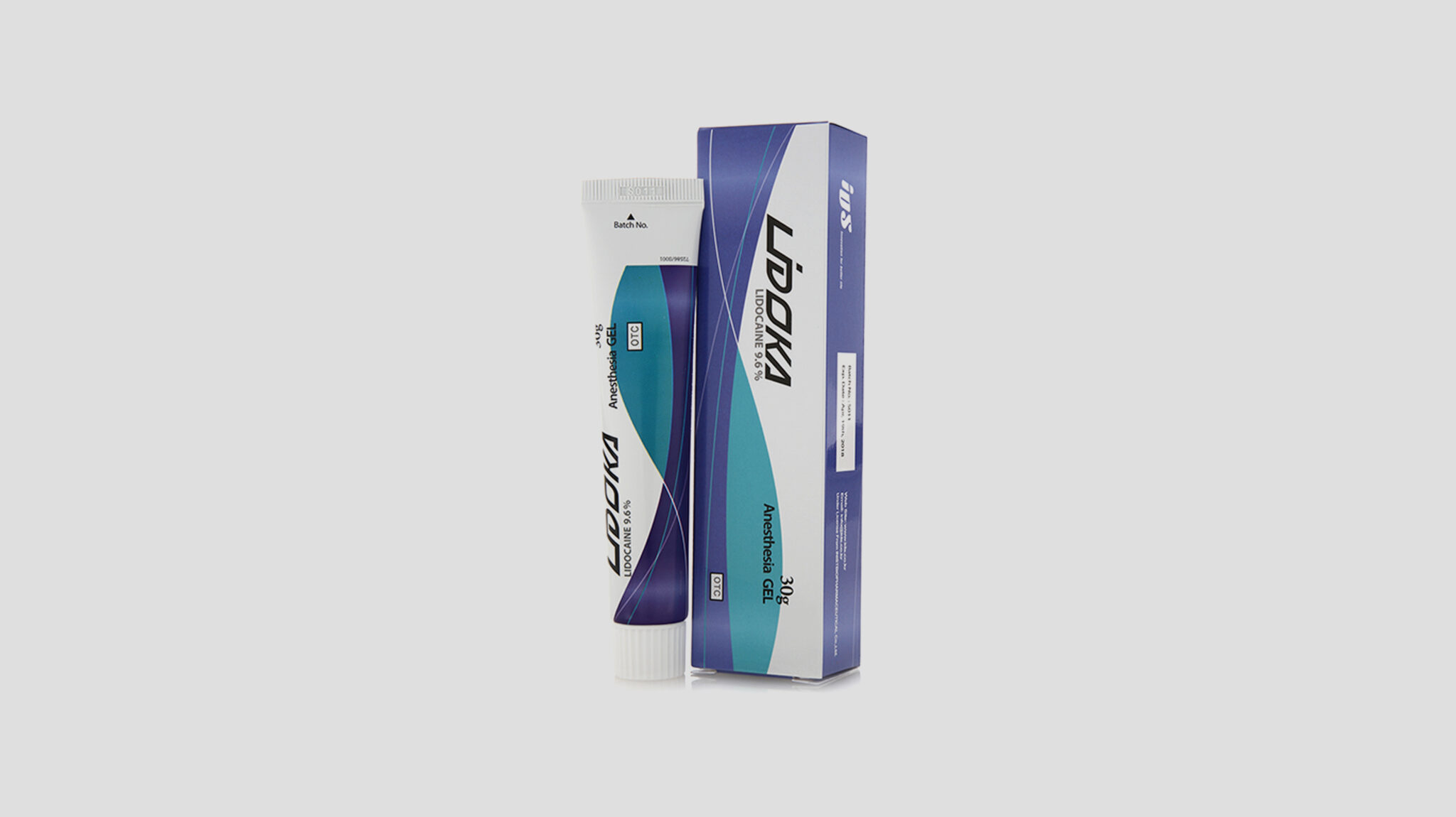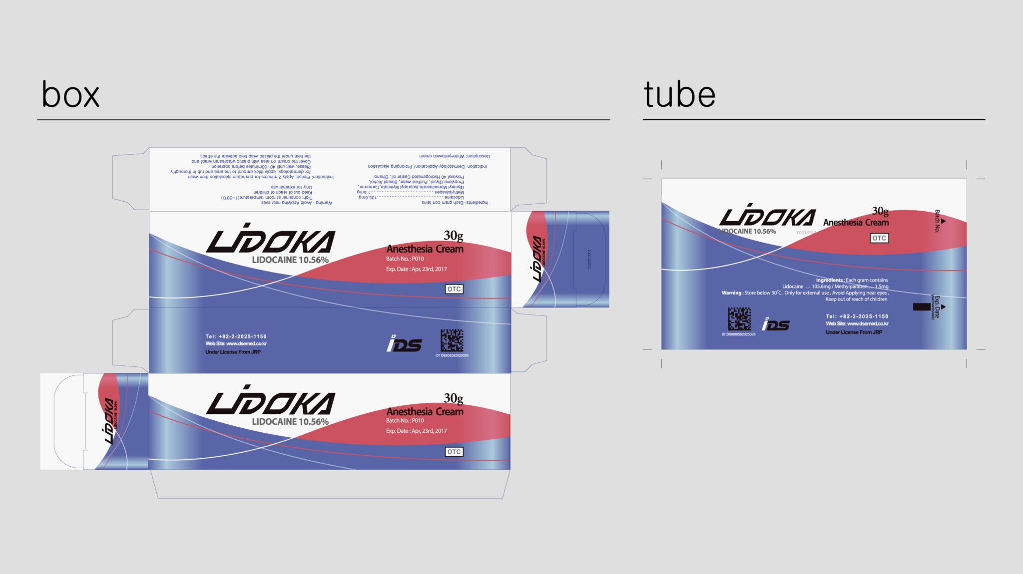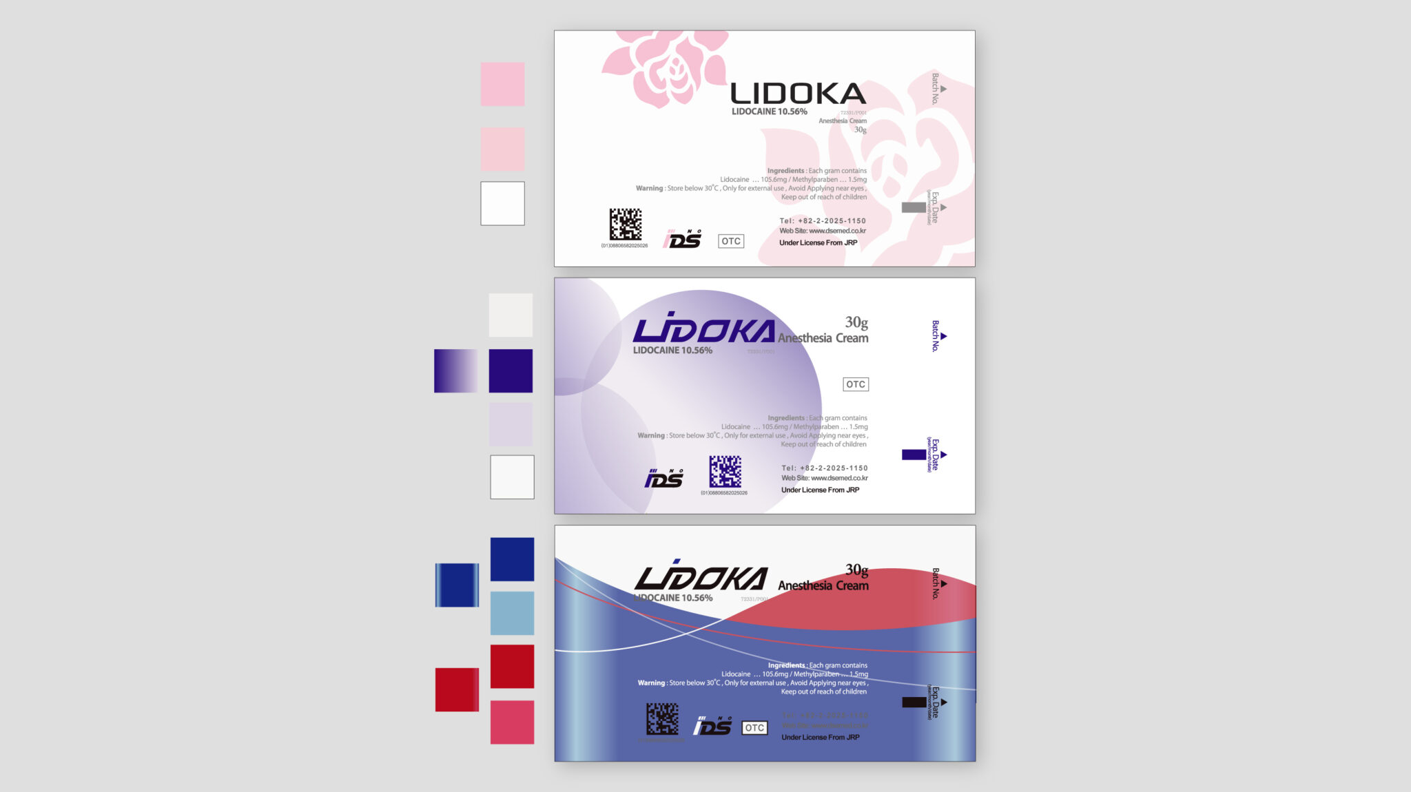 A Dynamic Diagonal Graphic Structure is applied over this base, lending technical energy and a modern sensibility to the pharmaceutical packaging. Colors such as orange and blue function as a Color Coding System for Intuitive Classification, helping medical staff quickly identify and select products. The product name, LIDOKA, is placed using high-contrast typography to enhance Rapid Information Accessibility and Professionalism while serving as a key branding element.