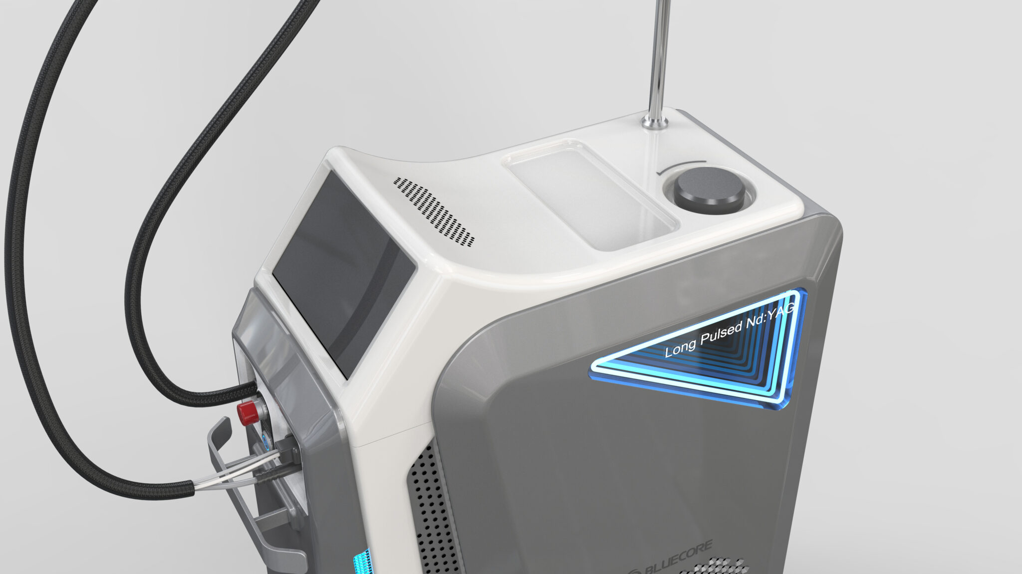 The core concept of this design is the armor-like structural form that protects the high-power laser technology inside the equipment. The segmented side surfaces and three-dimensional shield shape visually symbolize the durability and protectiveness of the device, strongly conveying the technical reliability expected of a high-performance laser system.