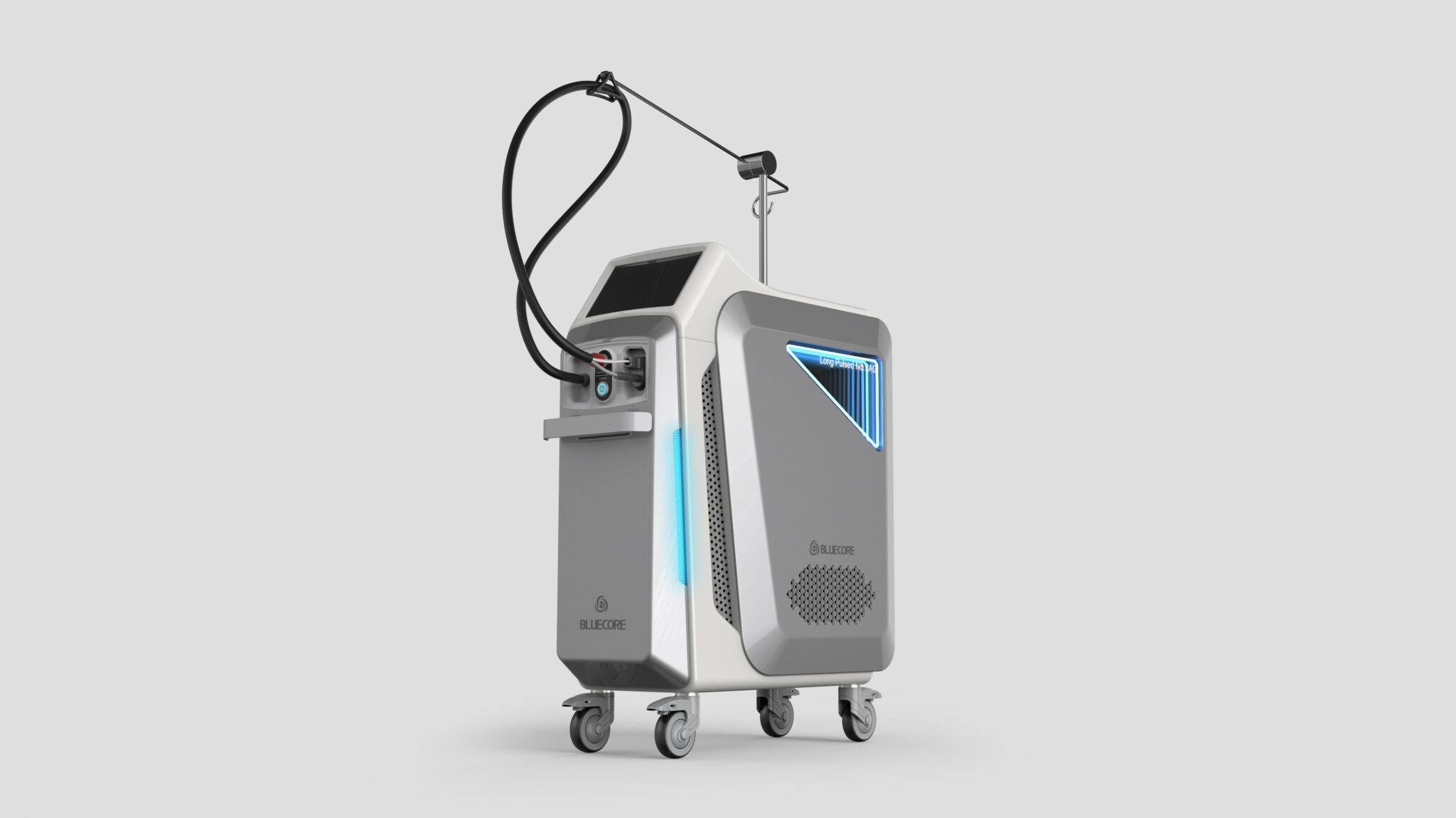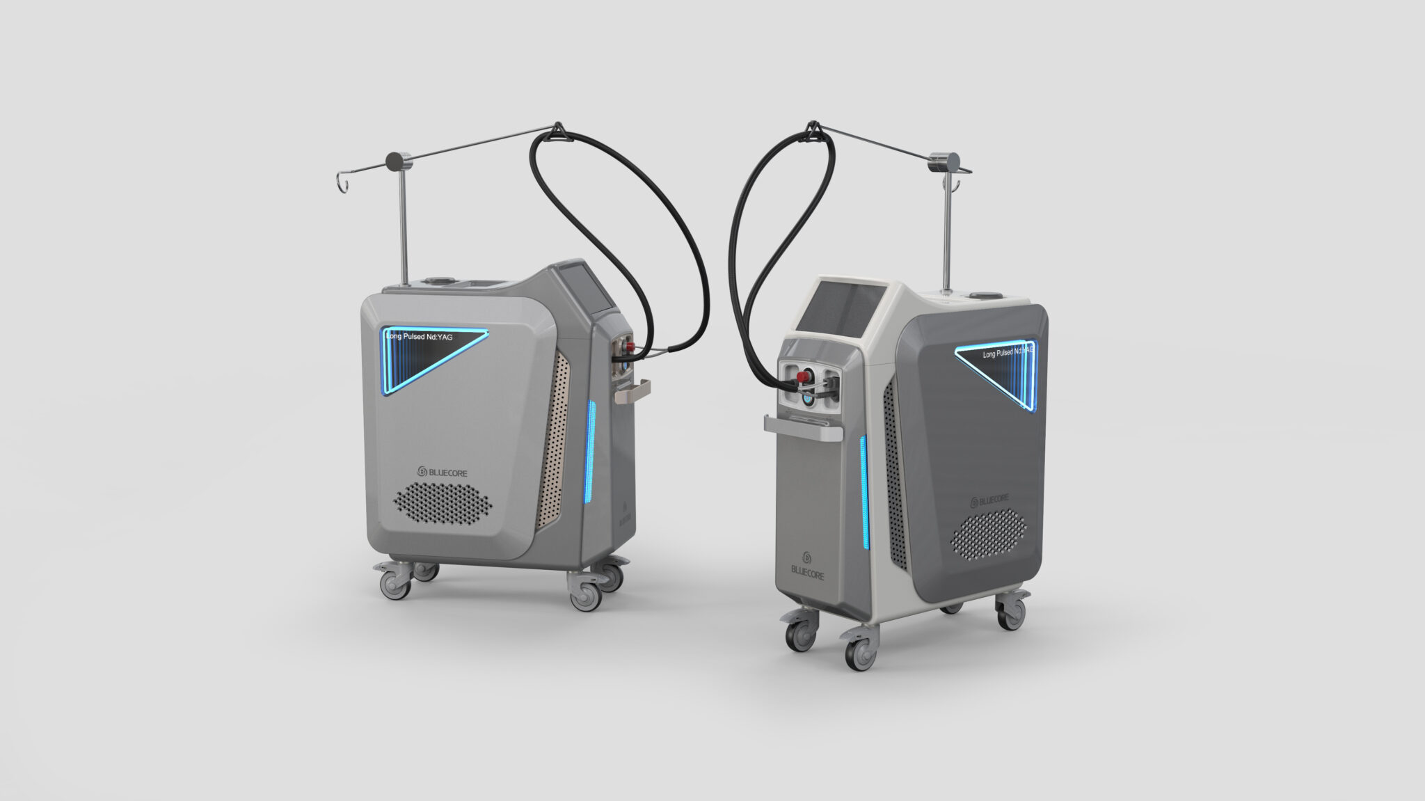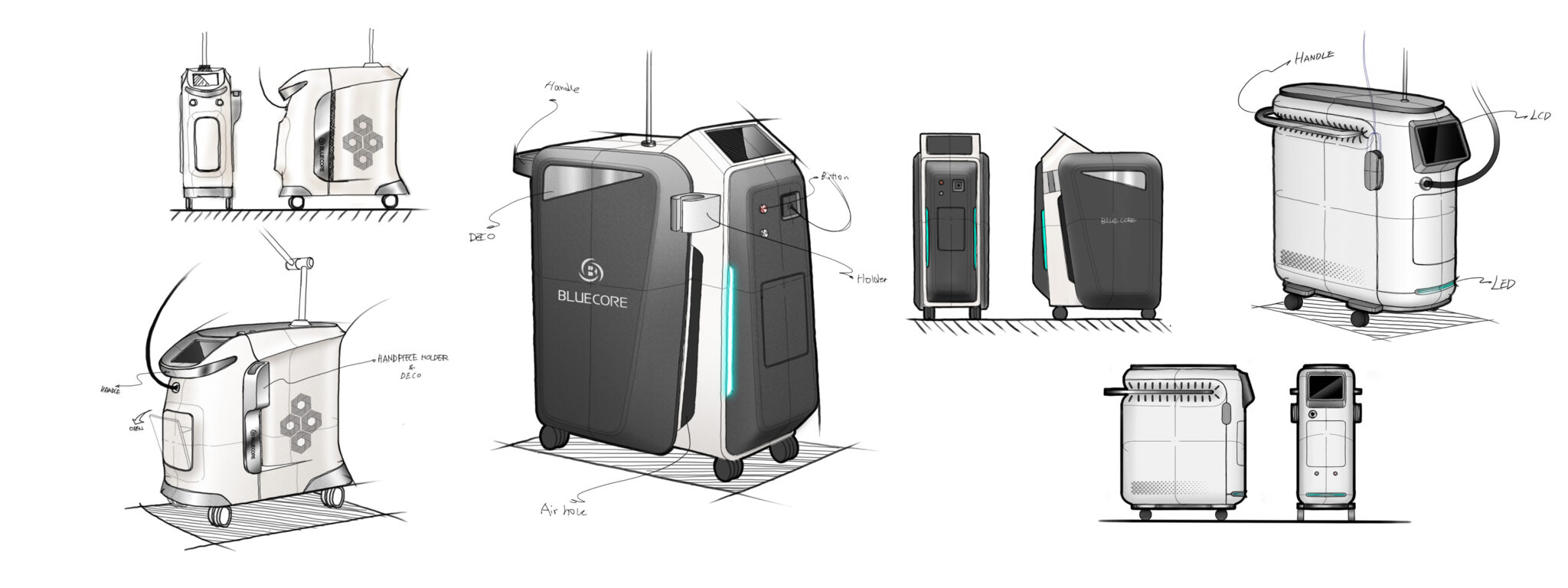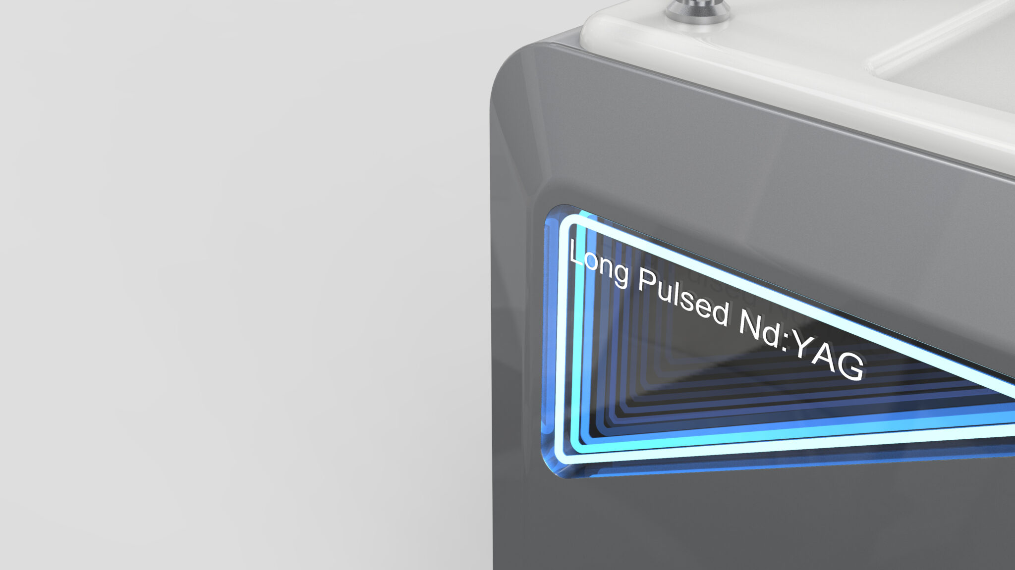 The triangular LED points on the front and the vertical light bars on the sides intuitively express the device’s operating status and energy flow, maximizing visibility and a high-tech sensibility, which are crucial for technology-based equipment. The overall color palette—composed of white, medical gray, and metal accents—maintains the cleanliness of medical equipment and the brand’s professionalism, while the blue lighting adds a futuristic impression.