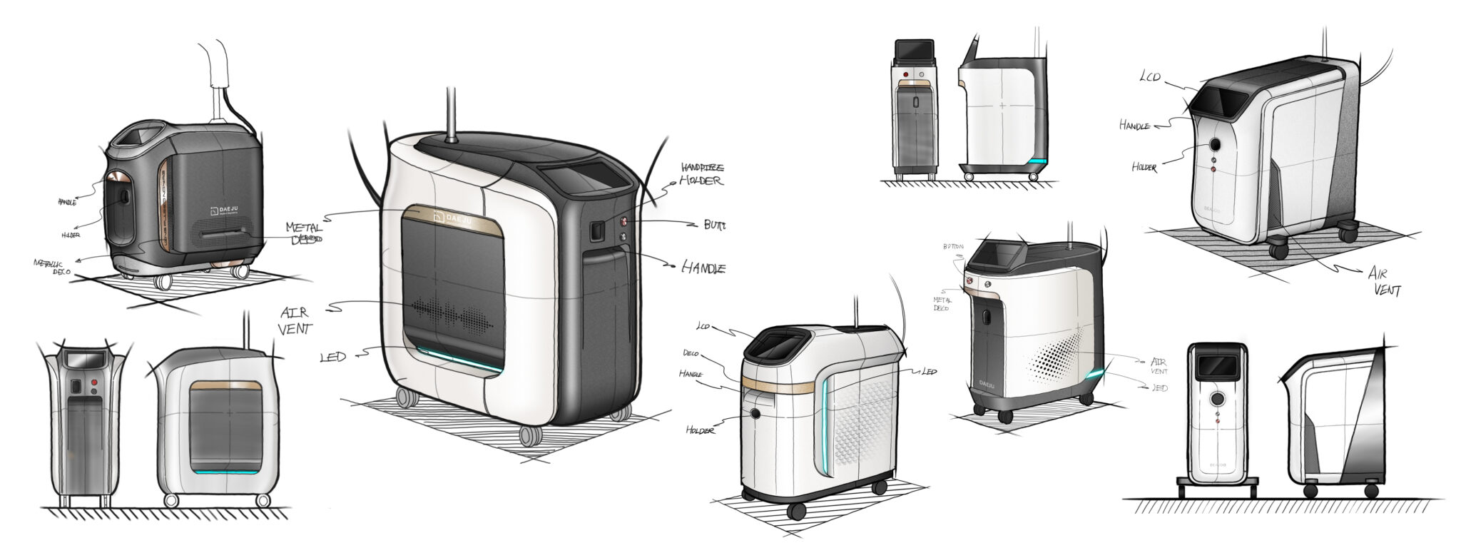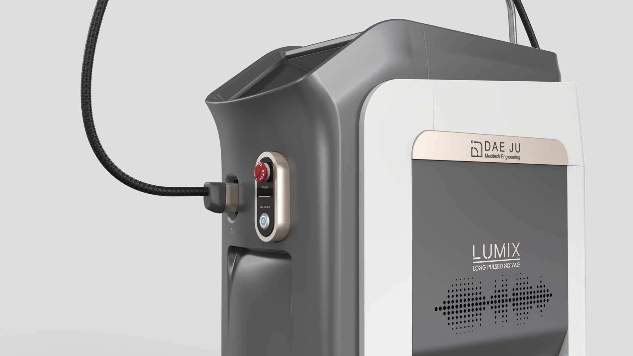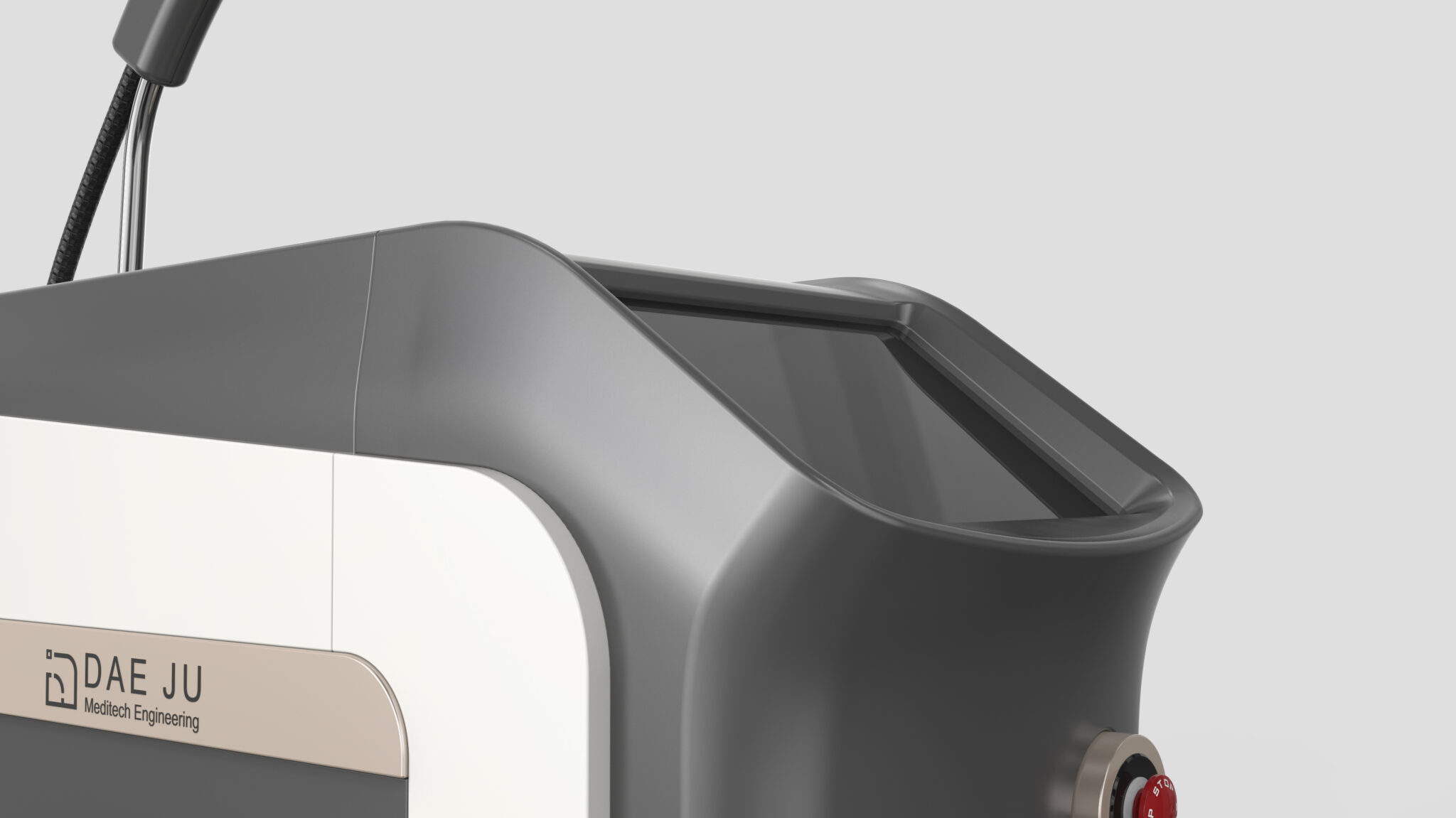 This design aims to be a medical laser device that combines industrial perfection with emotional intimacy. The entire body is centered around soft curves to minimize the fear or sense of alienation often associated with medical equipment. Conversely, the front white frame serves as a core structural element that emphasizes medical reliability and technical precision by clearly separating functional zones.