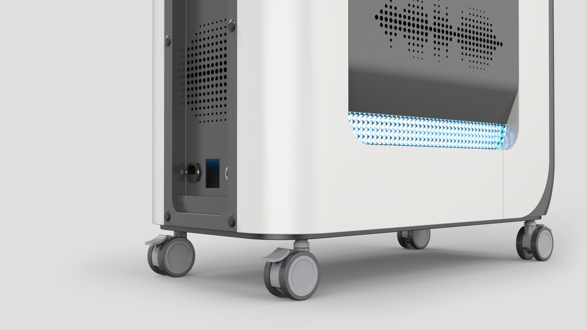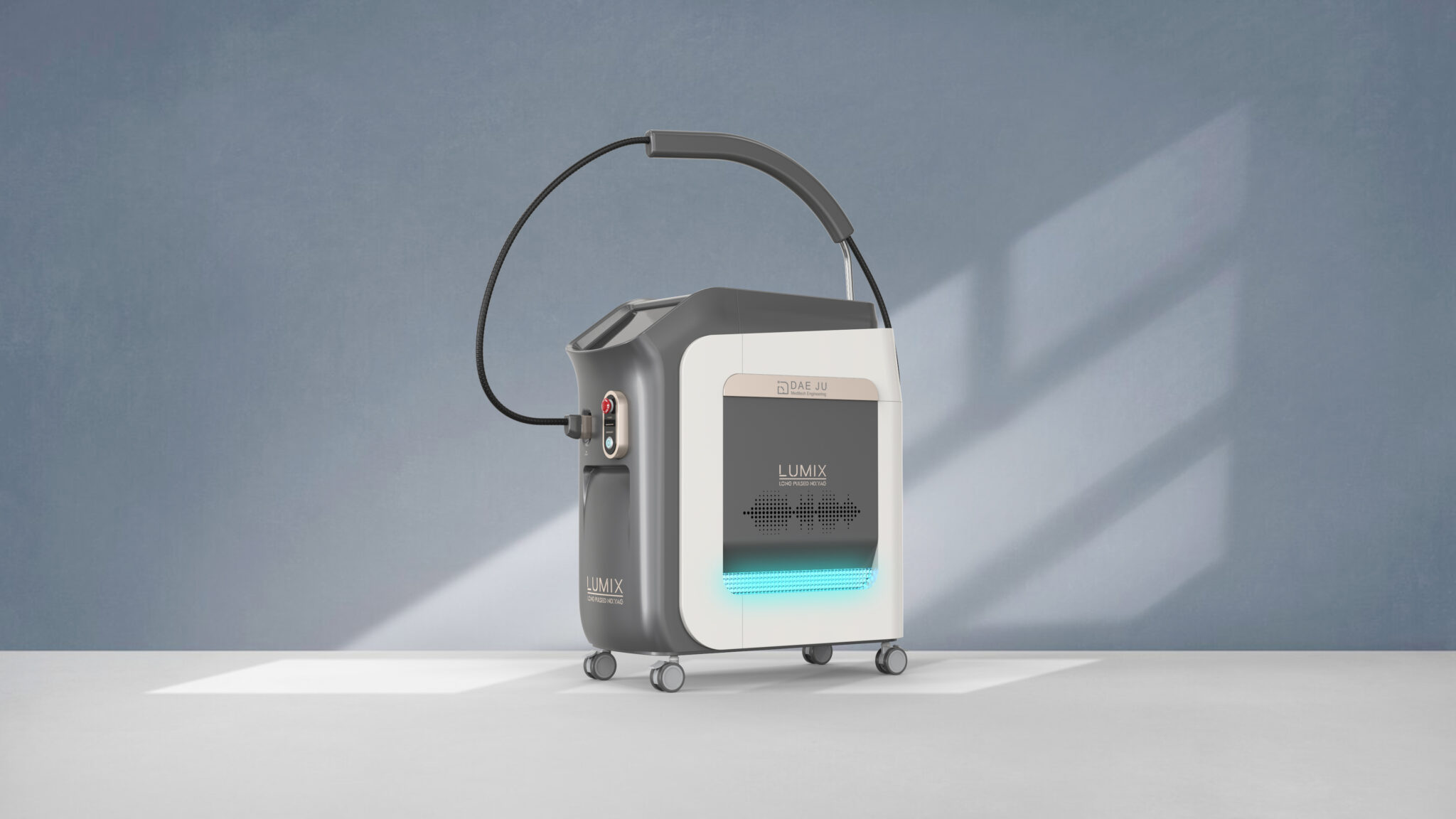 The blue lighting at the bottom front is an interactive UI that intuitively communicates the device’s active status, while symbolically representing the vibration and wavelength of laser energy to strengthen the brand’s emotional and technological image. The handpiece cable is designed to provide both a smoothly flowing line and an organized storage structure, considering the movement of users working in a dynamic environment. Overall, this equipment is a design that embodies comfort, stability, and technical reliability required in modern medical settings through the natural fusion of soft form, clear structure, emotional light, and ergonomics-based usability.