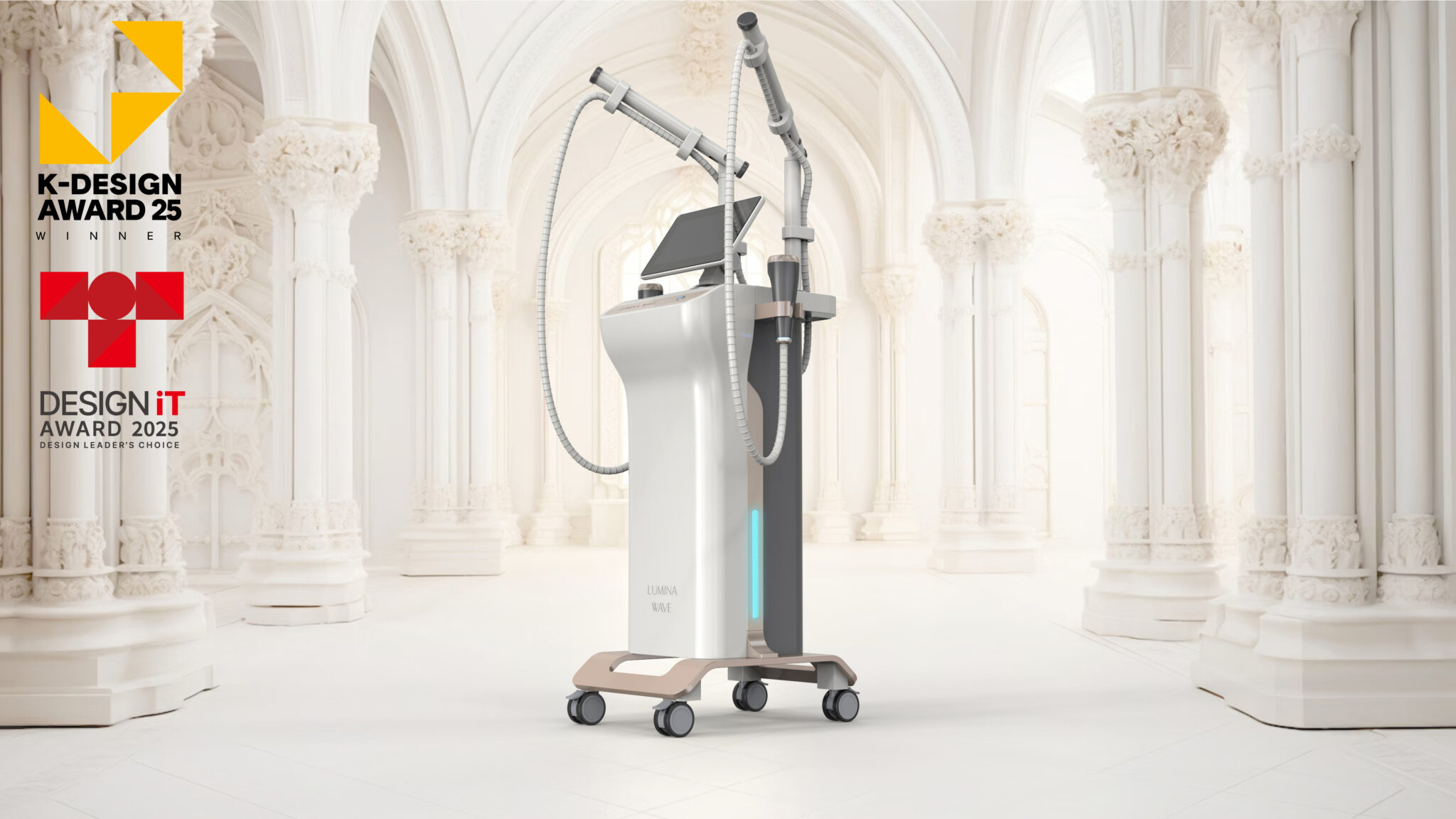 This design aims to be a sculptural medical device that redefines medical equipment as an object within a space. Based on architectural vertical proportions, the silhouette creates a calm and solid presence that harmonizes with the clinic environment. It is designed to function as a central object that symbolizes both the dignity of the space and brand reliability, rather than merely being a functional tool.