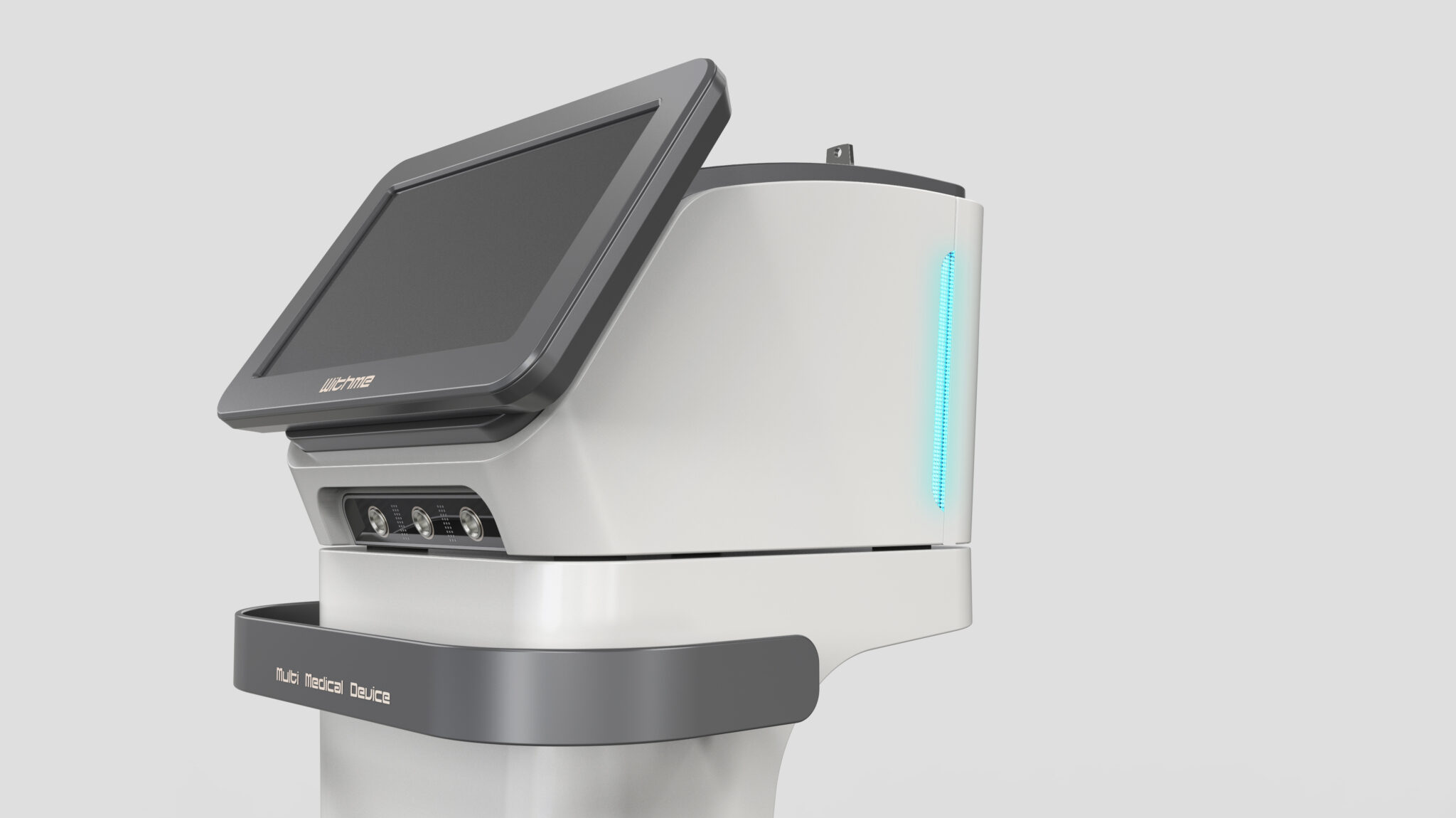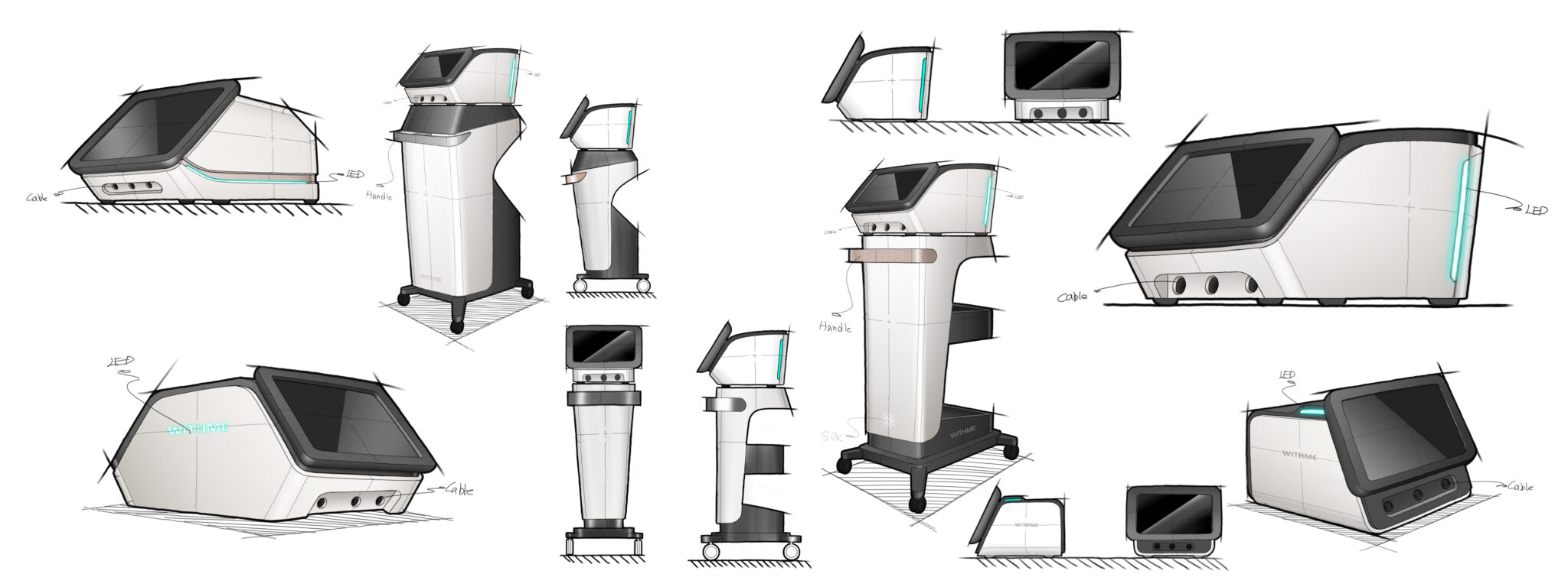 The upper display module is designed in a unique floating-like structure that appears separated from the body, emphasizing functional focus and creating an effect where medical technology seems to visually emerge. The body features a hybrid form combining soft curves and straight lines, allowing intimacy through softness and professionalism through technical linear beauty to coexist.