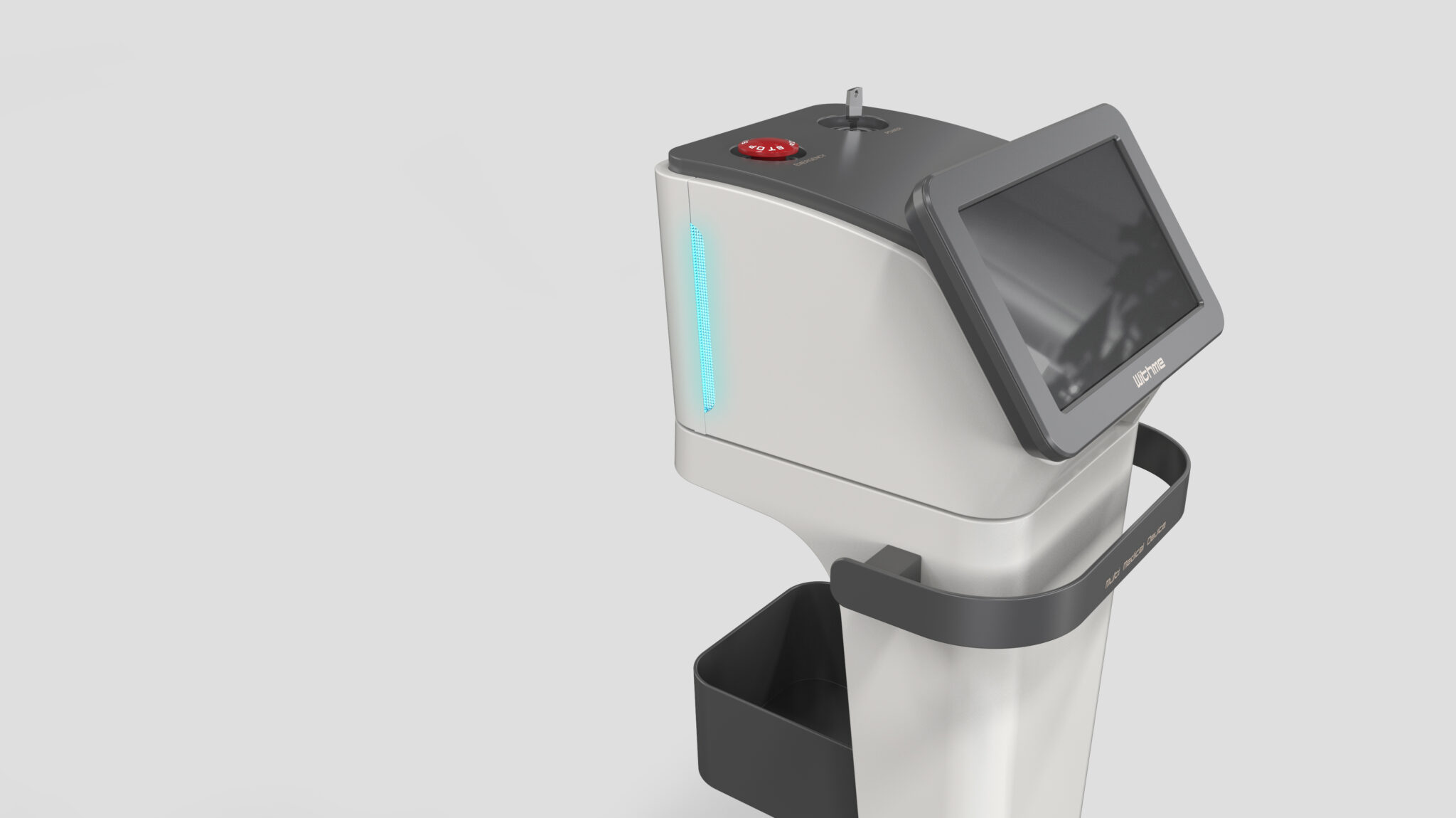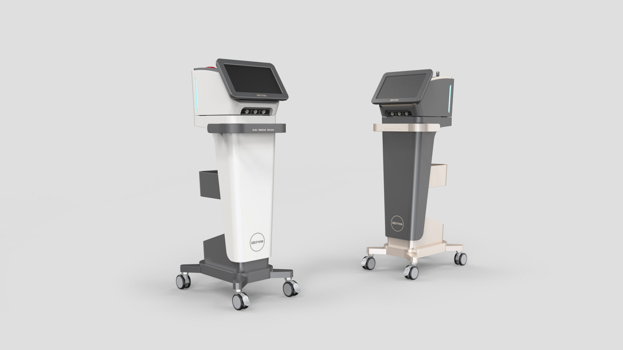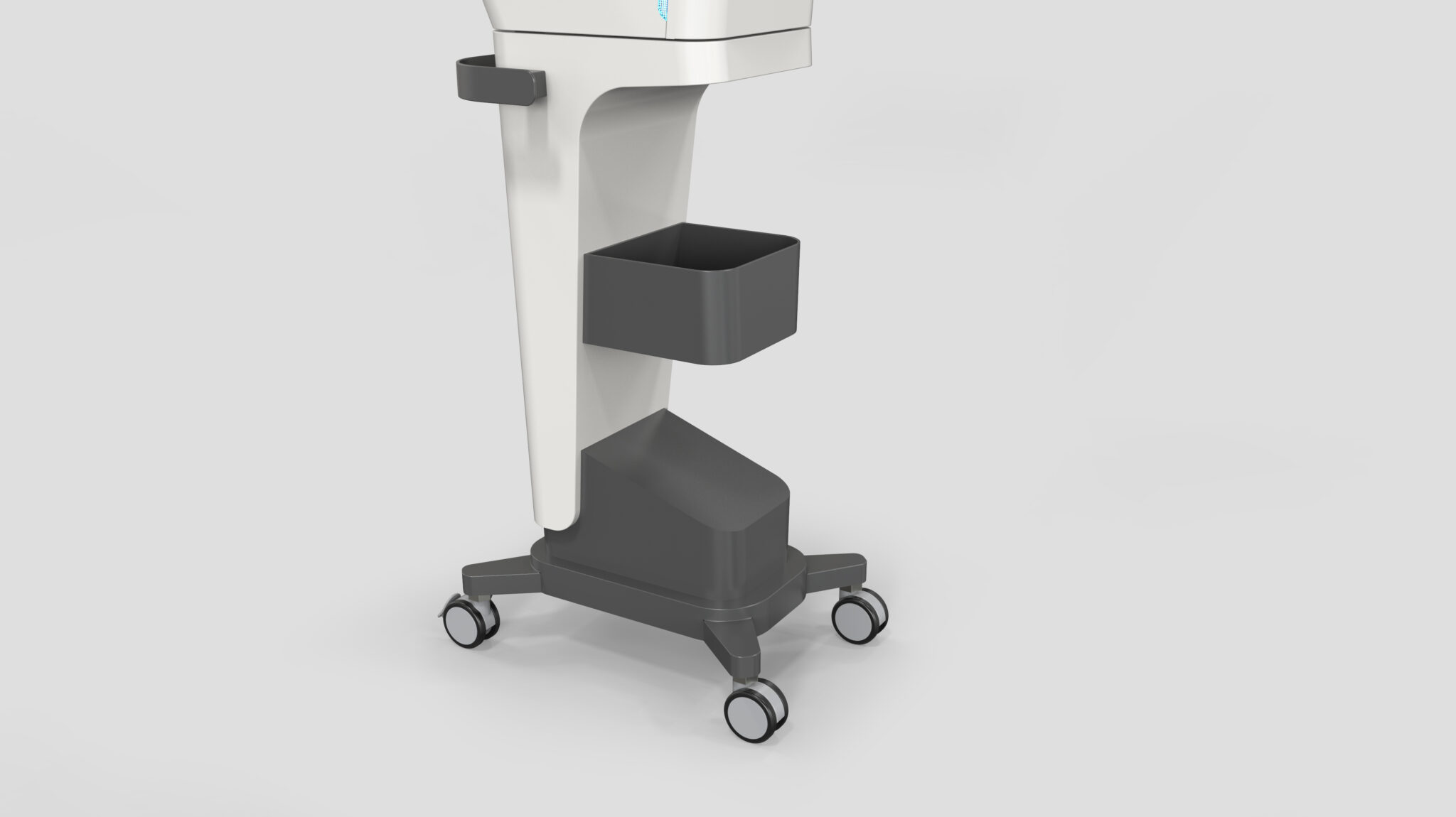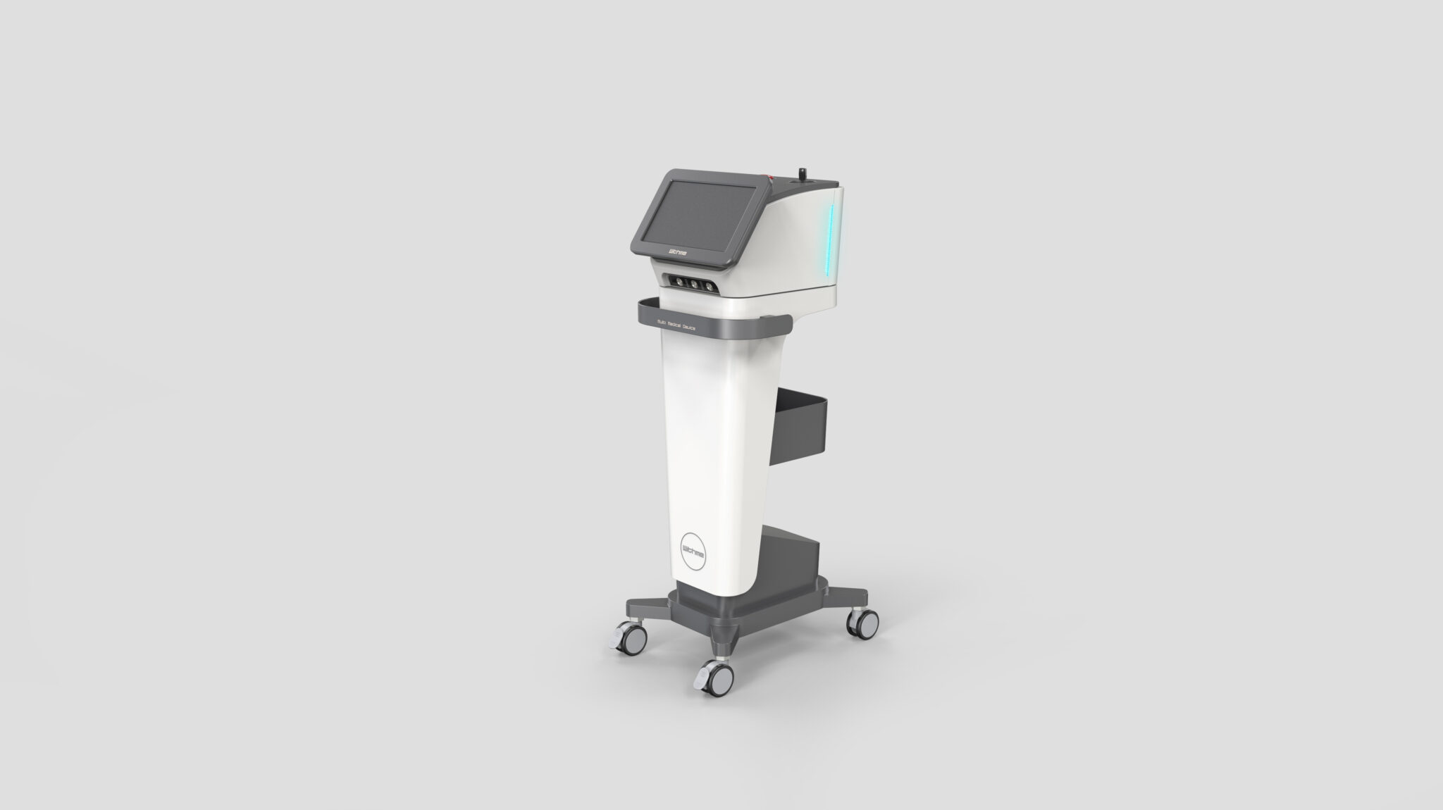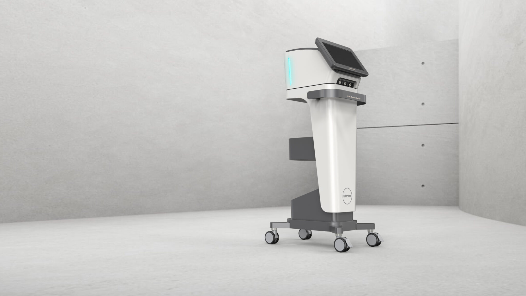 The side lights function as an indicator of the device’s status, further elevating its premium presence within the space. At the bottom, the wide base and robust caster structure visually represent the stability and durability essential in medical environments characterized by frequent movement and repeated use.