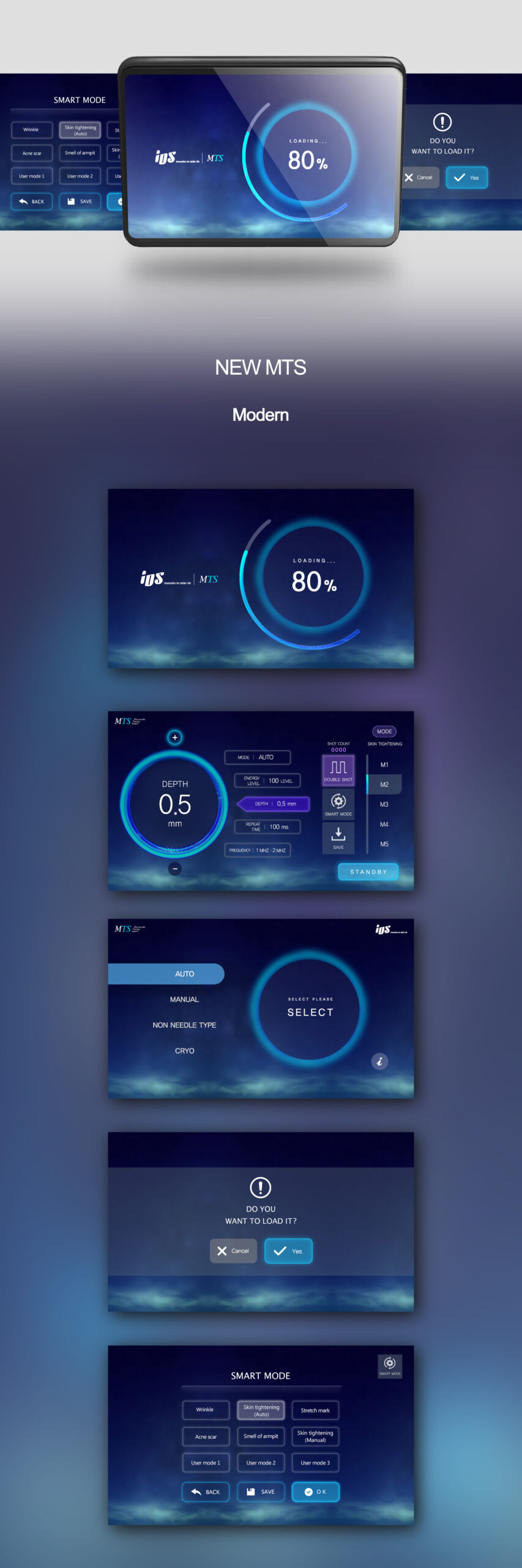 This design centers on a modern interface structure configured for intuitive control of the depth, rhythm, and accuracy of MTS procedures. The deep, calm blue tones convey stability and professionalism in a medical environment while inducing visual focus. The blue gradients and dreamy layers visually represent the subtle waves, circulation, and depth of MTS energy delivered deep into the skin tissue.