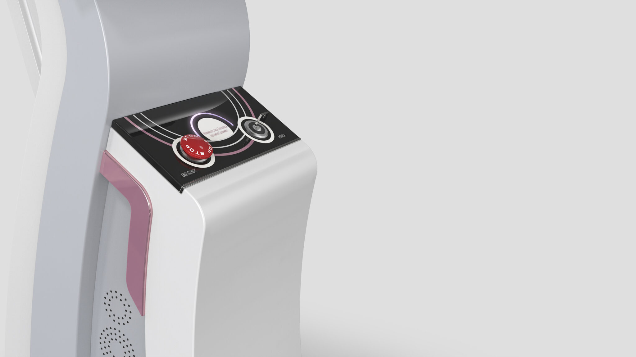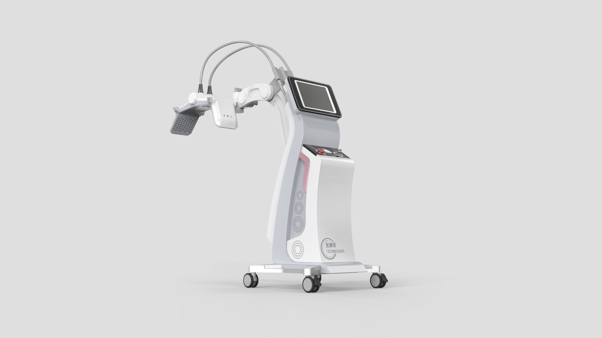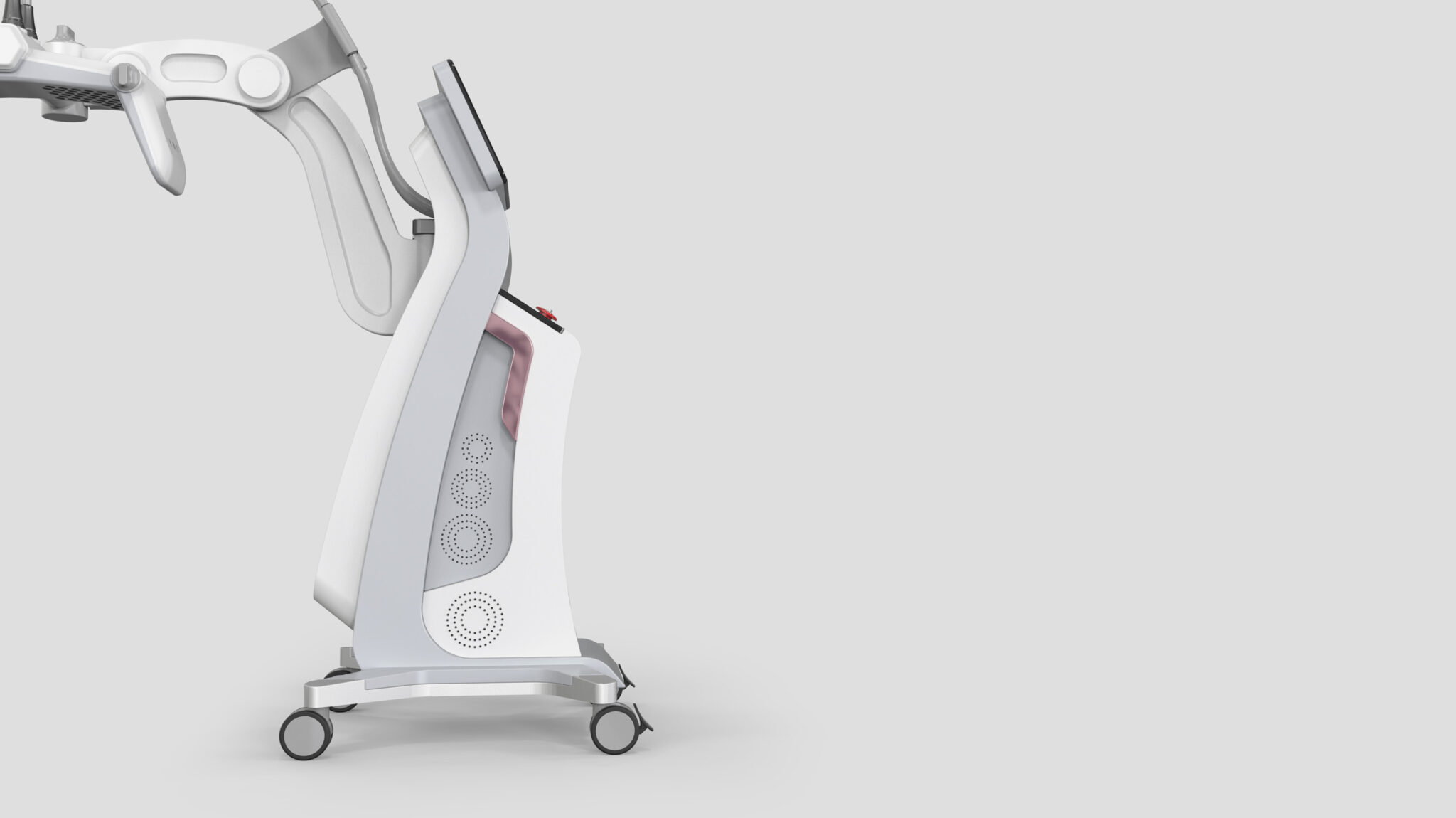 This system is designed by integrating the core values of non-invasive body contouring, Precision Energy Delivery, Body Contour Compatibility, and Stable Experience, into a single formal language. The flowing curvature of the body is inspired by the human silhouette, visually expressing the Soft Non-Invasive Feel of energy-based procedures. The S-line structure, which expands as it rises, naturally guides the movement of the treatment head and the medical staff’s workflow, while the stable base frame and cart structure enhance professional reliability.