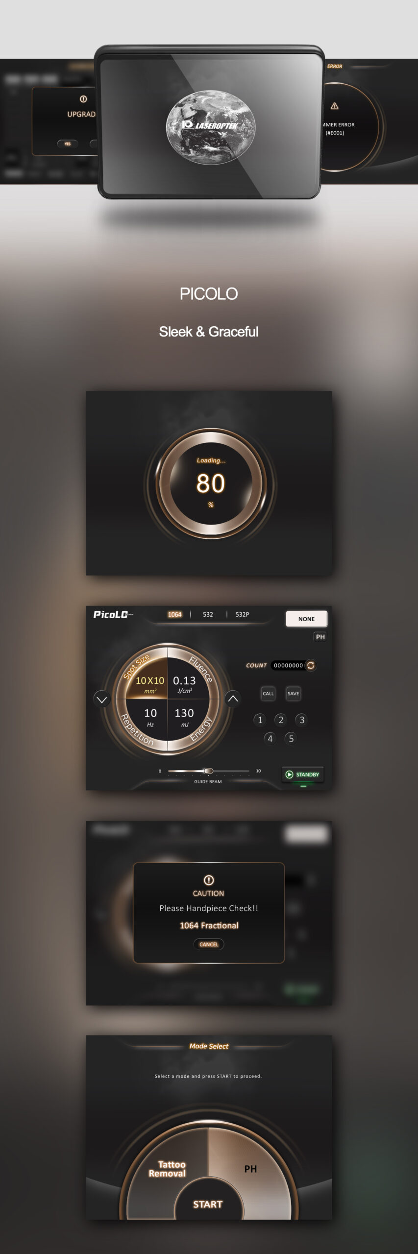 The graphics utilize subtle luster, deep shadows, and smooth motions to express the screen as a functional and sensory technical object. This goes beyond a simple operation screen to form a premium visual identity that reinforces the brand’s value. Consequently, the UI for PICOLO is a Sleek & Graceful Medical UI that harmoniously combines accuracy, technology, and luxury to provide optimal usability and aesthetic satisfaction.