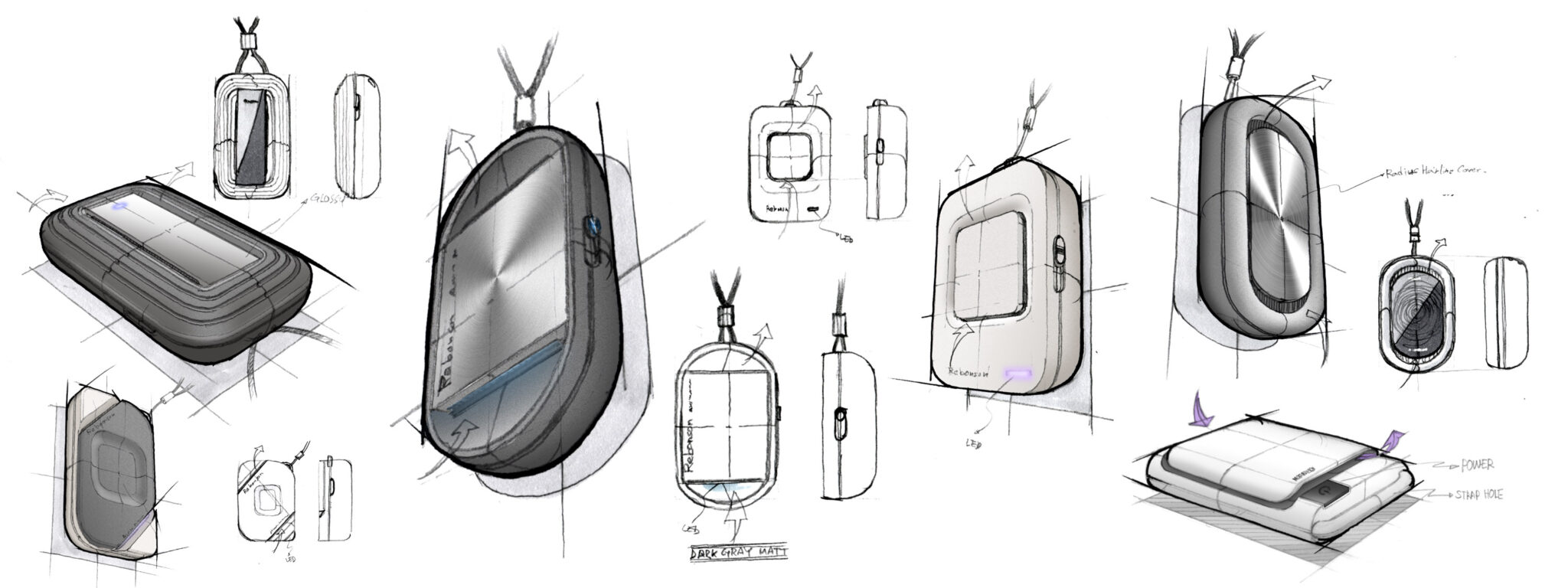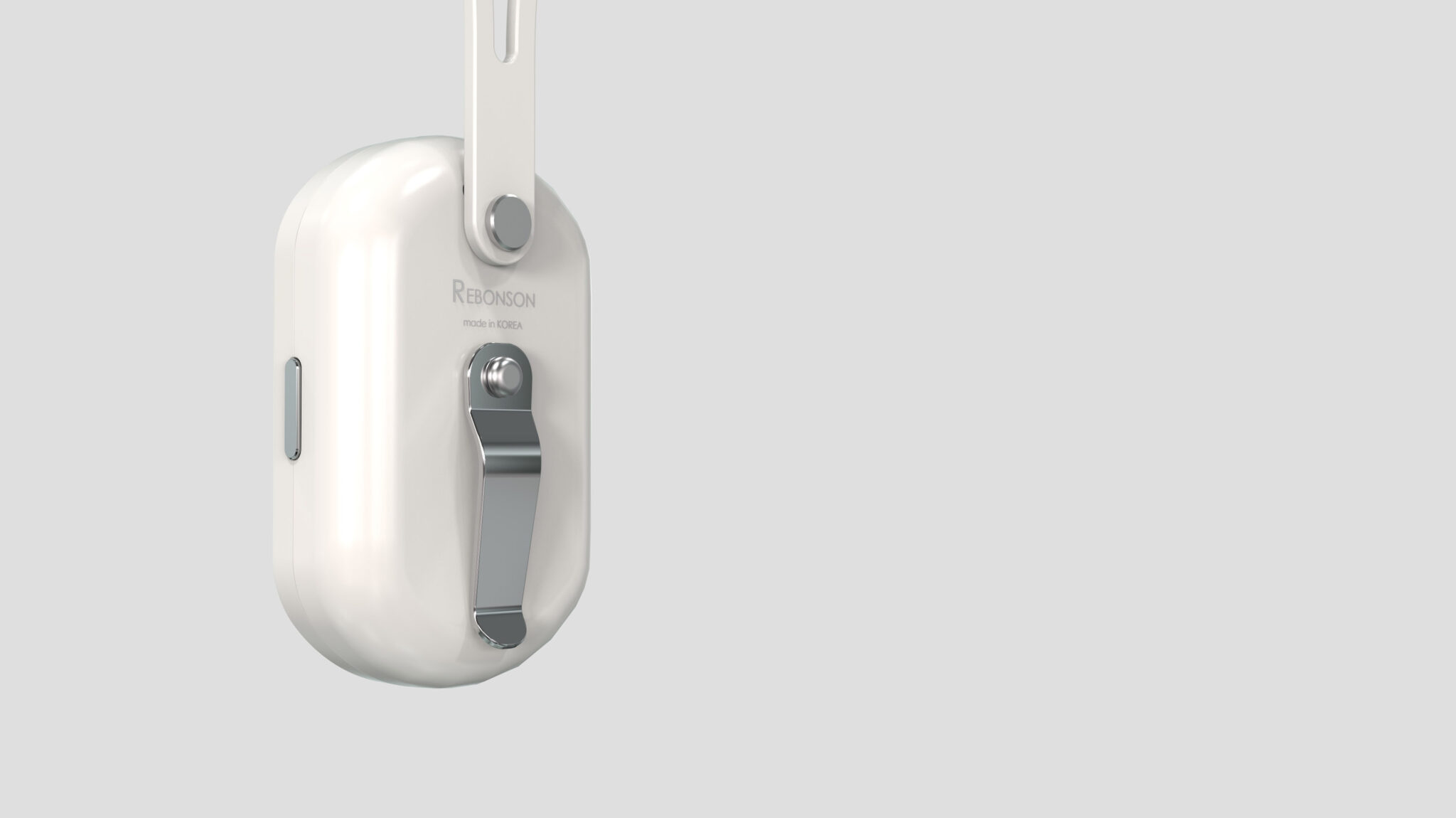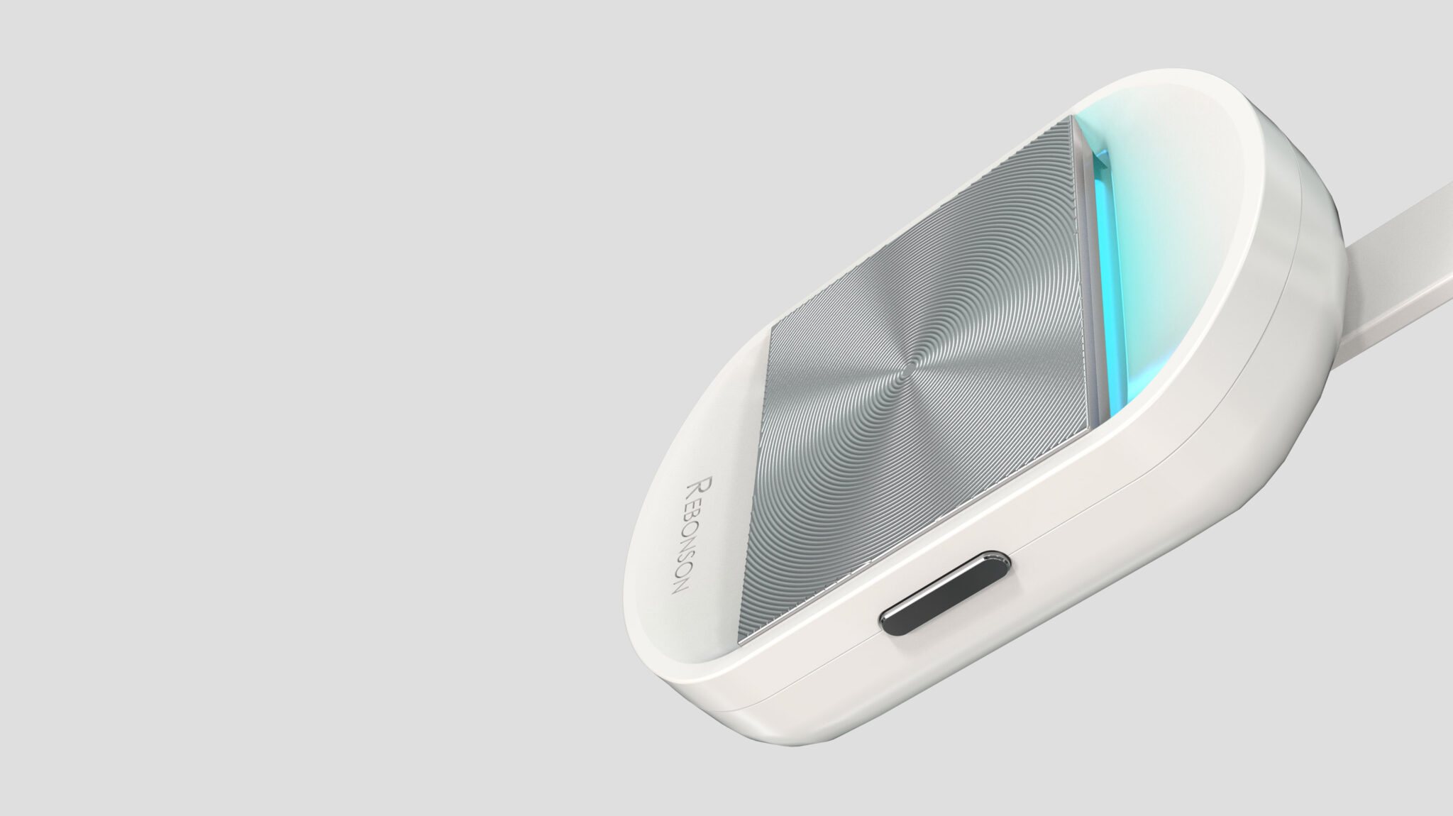 This design originates from a concept that expands the portable air purifier into the realm of “wearable tech devices.” The overall rounded silhouette is engineered for a comfortable fit against the body, while the metallic radial texture panel on the front symbolically represents the flow of purifying air. This metal panel provides a strong technical presence, balancing with the compact volume to create the impression of a premium pocket device.