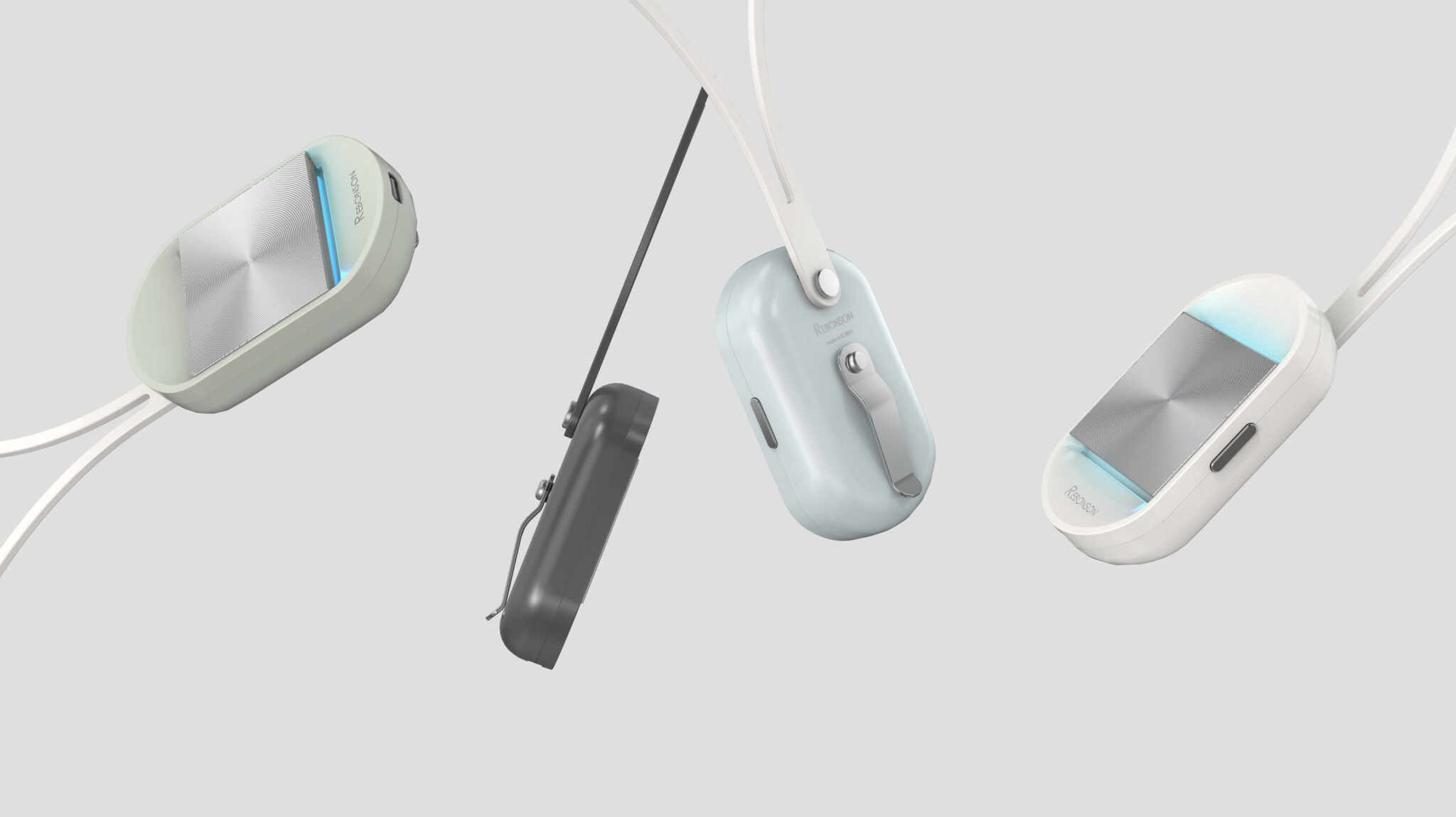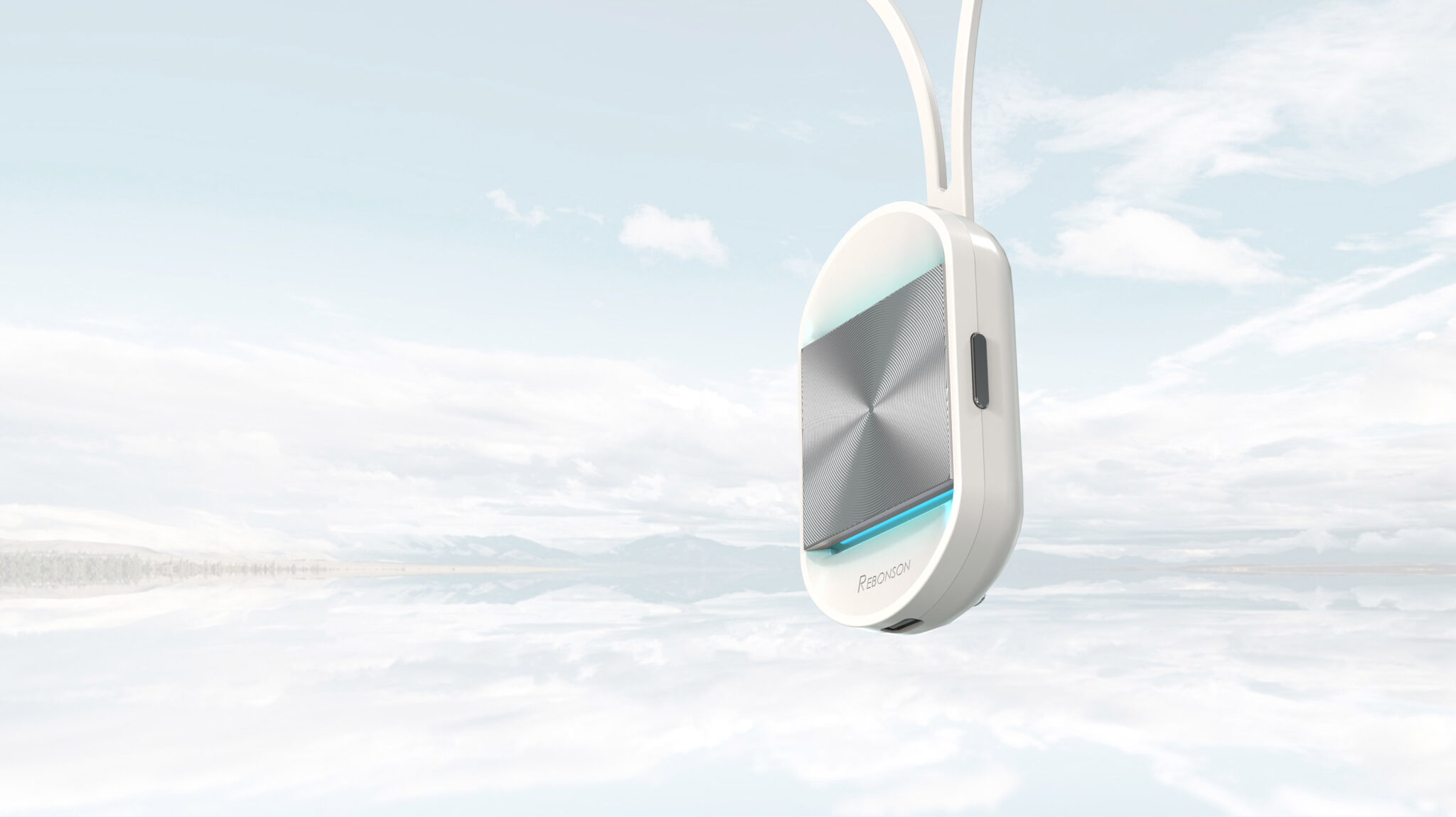 The blue light edge running along the bottom is an emotional UI element that intuitively conveys operational status while emphasizing a crisp, refreshing sensation. The side buttons and air holes are kept minimal to integrate seamlessly into the overall form without compromising usability. The harmony between the product and the sky-themed background reflects the message that this device provides “air as clear as the open sky” anytime, anywhere.