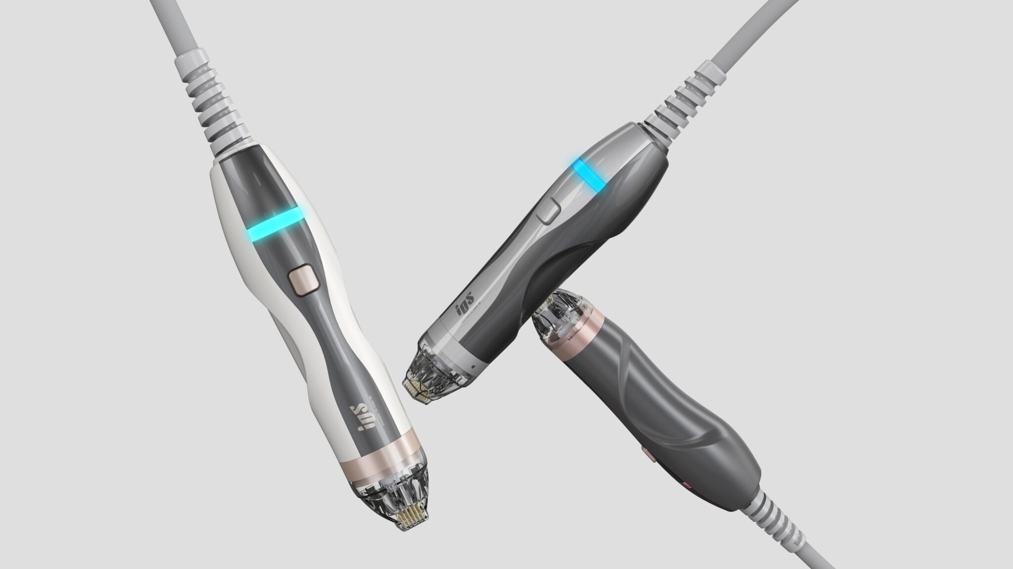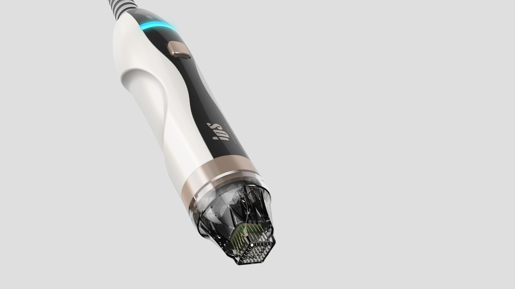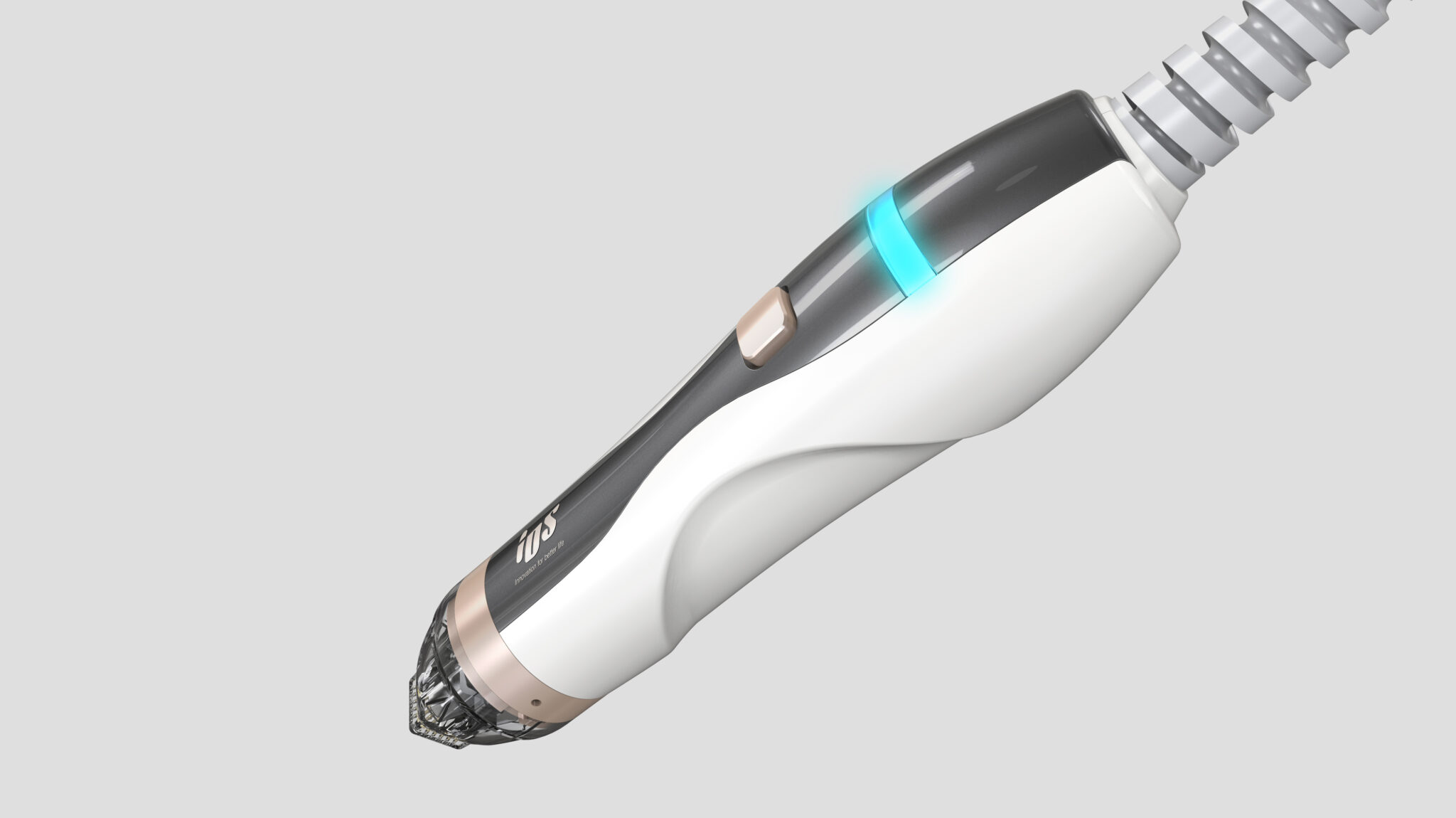 This premium medical and aesthetic handpiece (MTS series) is an ergonomic object meticulously designed around the user’s hand and the procedural experience. The silhouette is based on organic curved lines that naturally follow the flow of the hand’s grip, rather than a linear mechanical aesthetic, designed to minimize fatigue even during prolonged use. The body uses a white and dark gray two-tone color scheme to convey professionalism, while rose gold accents reinforce the premium image and serve as a UX-driven design element to help users intuitively recognize functional areas.