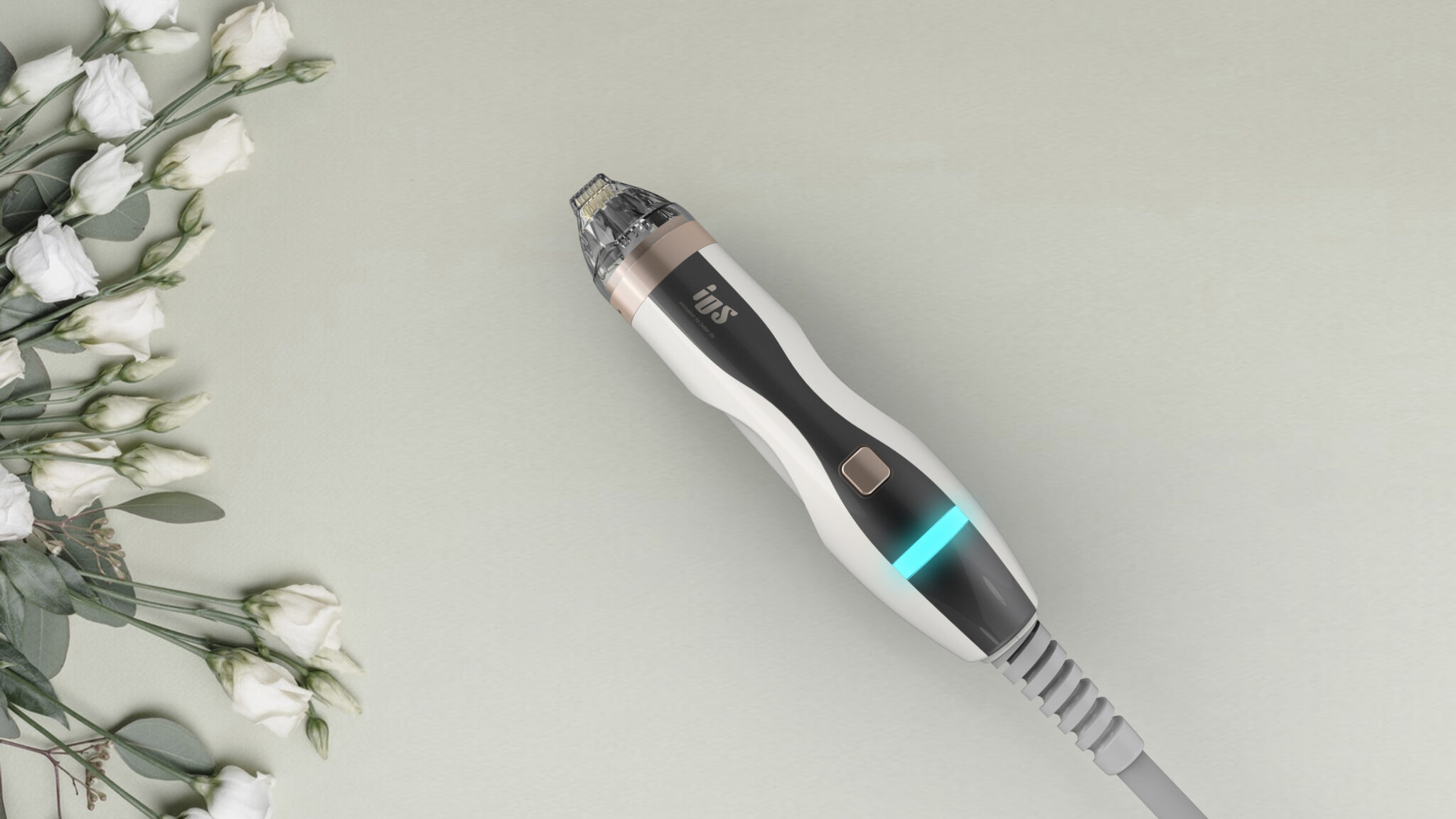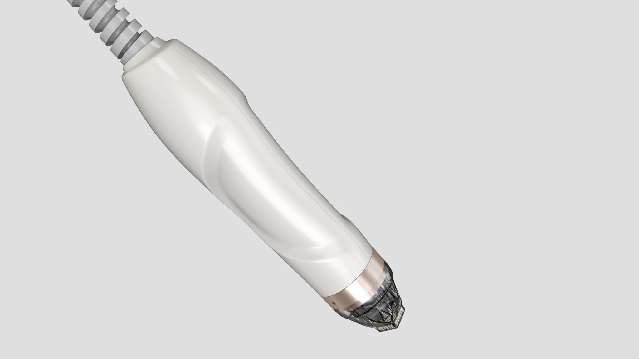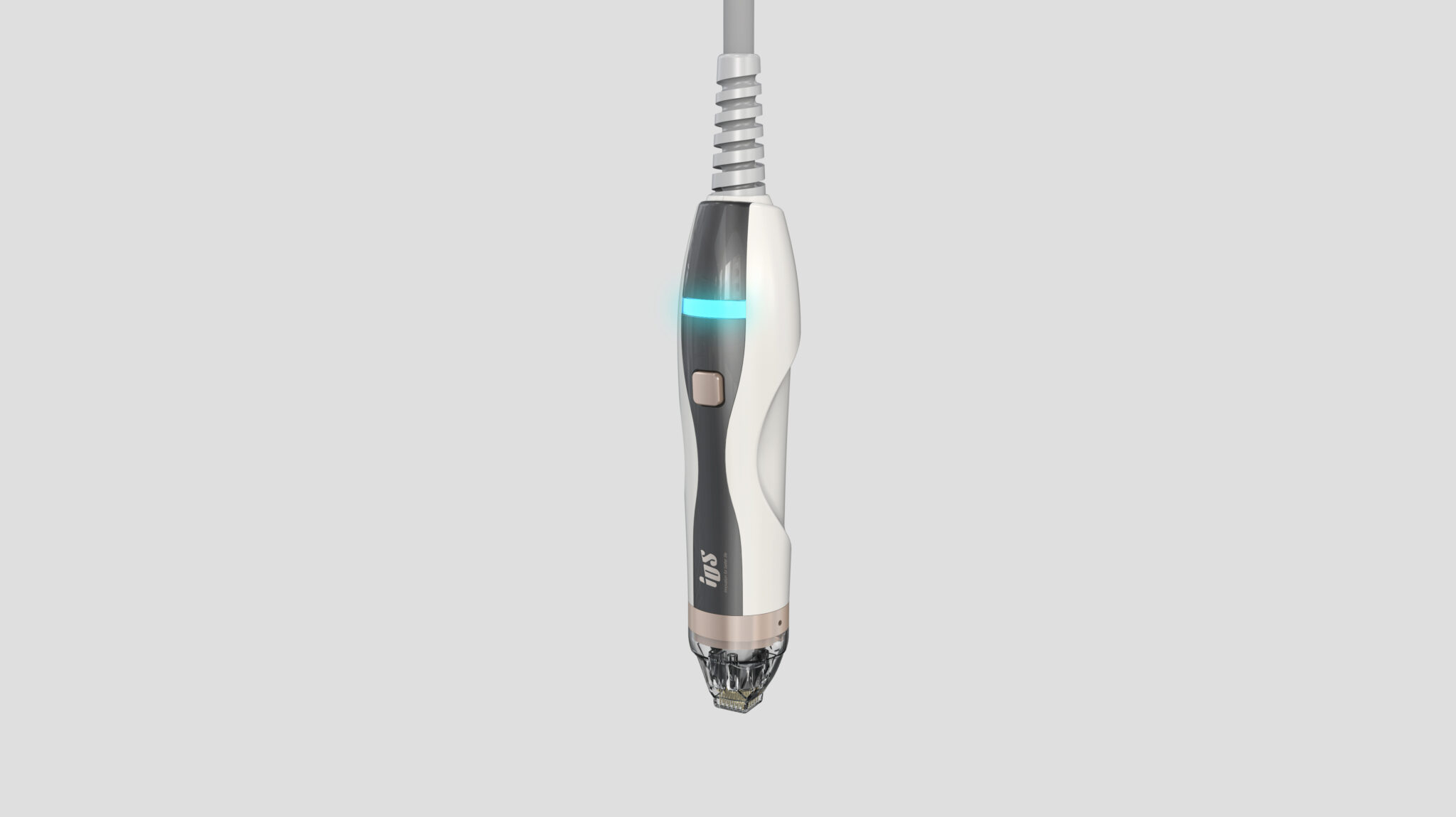 This premium medical and aesthetic handpiece (MTS series) is an ergonomic object meticulously designed around the user’s hand and the procedural experience. The silhouette is based on organic curved lines that naturally follow the flow of the hand’s grip, rather than a linear mechanical aesthetic, designed to minimize fatigue even during prolonged use. The body uses a white and dark gray two-tone color scheme to convey professionalism, while rose gold accents reinforce the premium image and serve as a UX-driven design element to help users intuitively recognize functional areas.