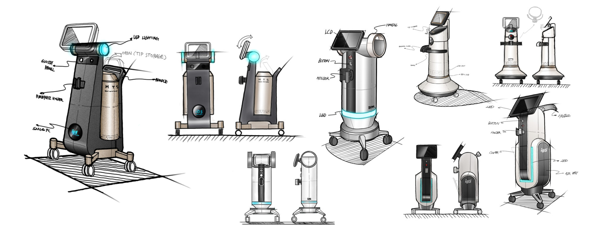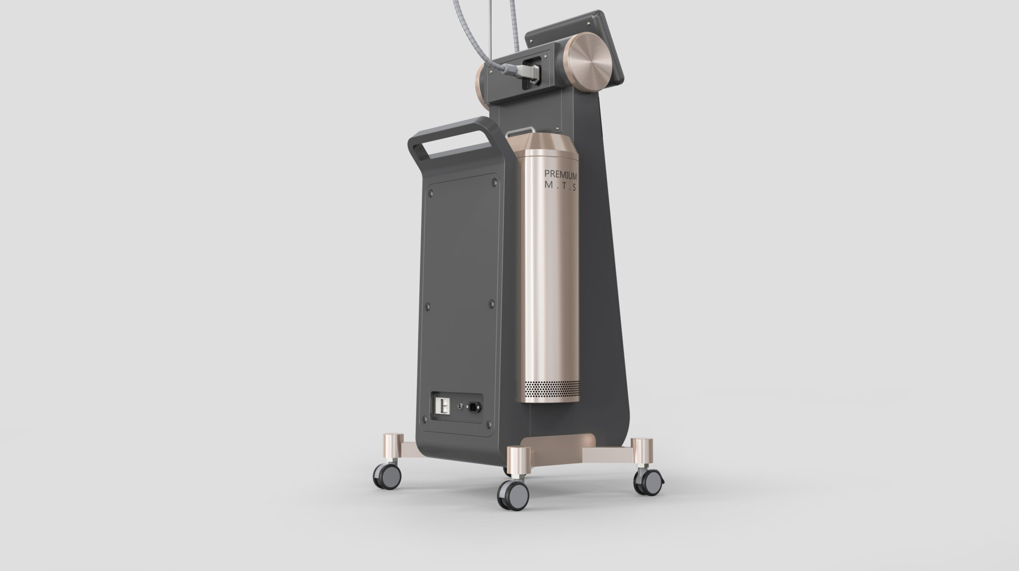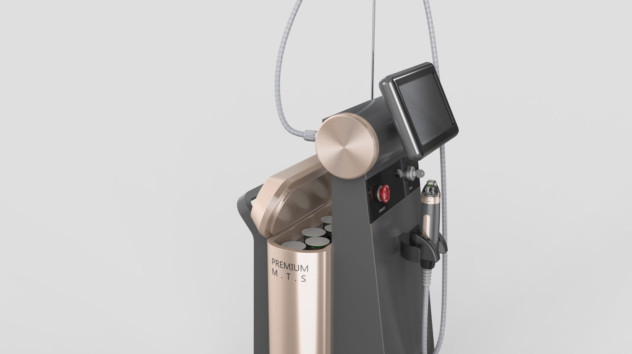 The structure, where the handpiece cable leans against the device in a consistent arch, represents a harmony of functional and design elements, creating a high-quality visual language where soft curves meet sharp straight lines. This equipment goes beyond a simple procedural tool to deliver the message of being a design object that elevates salon and clinic spaces, and a premium MTS system embodying the evolution of technology.
