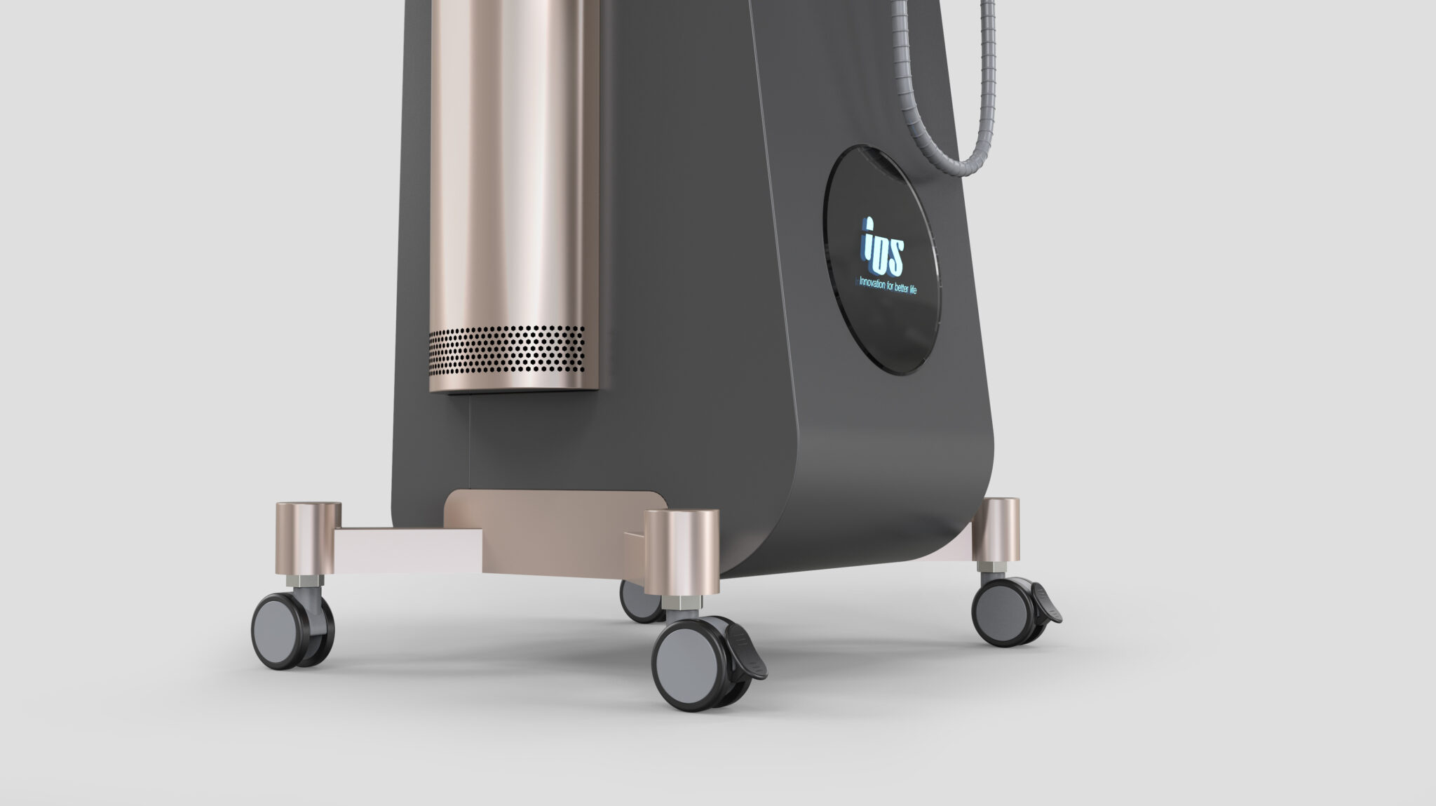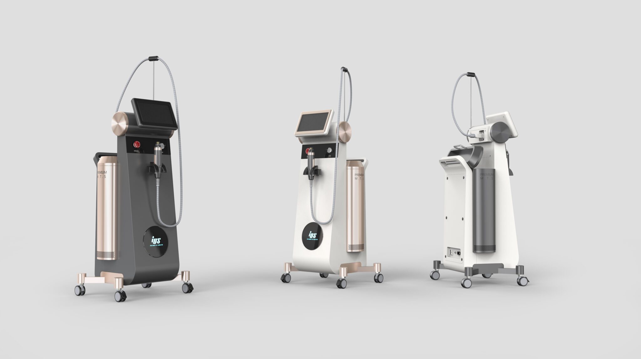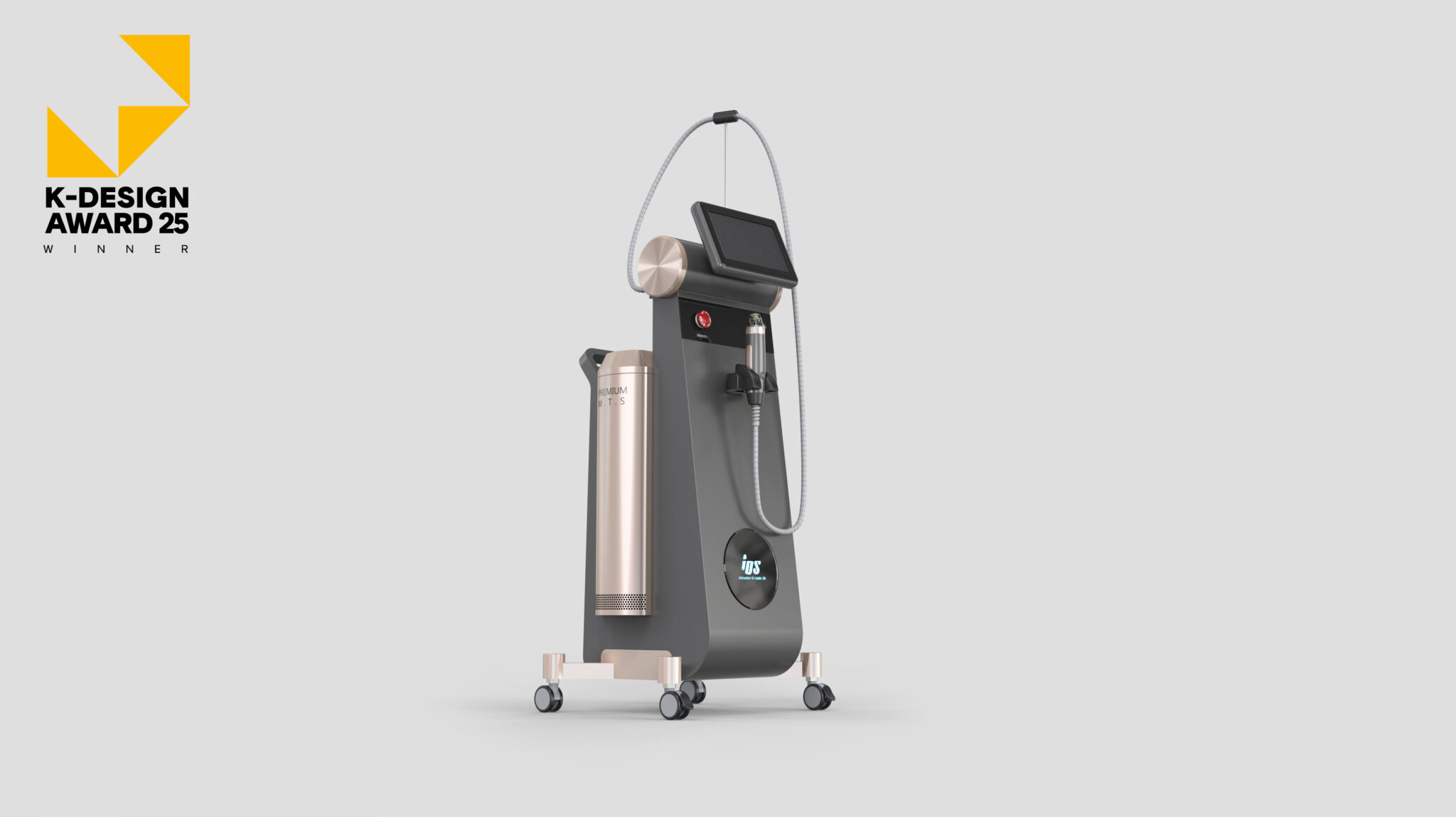 This product is designed as high-end equipment that maximizes ease of use while creating a luxurious atmosphere in professional skin booster and MTS treatment environments. The overall form establishes a silhouette that feels lightweight at the top while maintaining a solid base, ensuring both visual stability and user focus. Metal elements on the front and sides reinforce the feeling of precision equipment, and the choice of rose gold elevates the product from a mere machine to a premium beauty object.