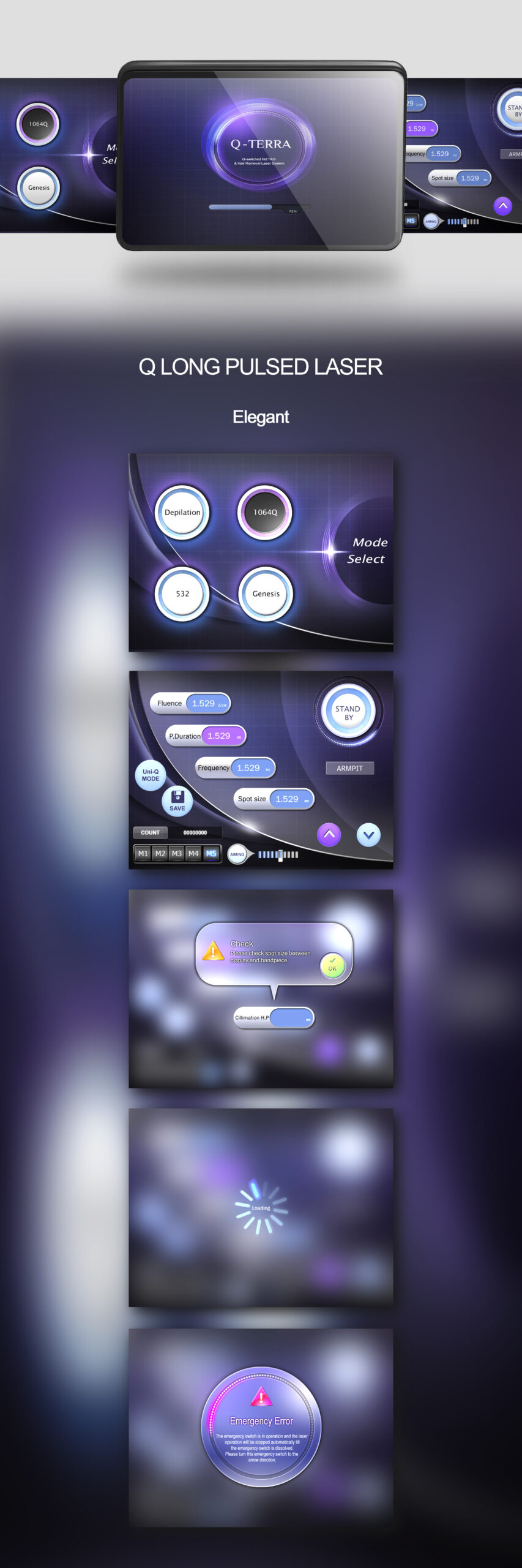 This design implements a Premium Tech-Elegance UI that organizes technical complexity into a sophisticated interface language, based on the requirements for precise parameter adjustment, hazard visualization, and a safe user experience. The overall screen uses a deep purple-based Quantum-like gradient and soft glow effects to Visually Express the Technical Depth and Energy Wavelengths of High-End Medical Equipment.