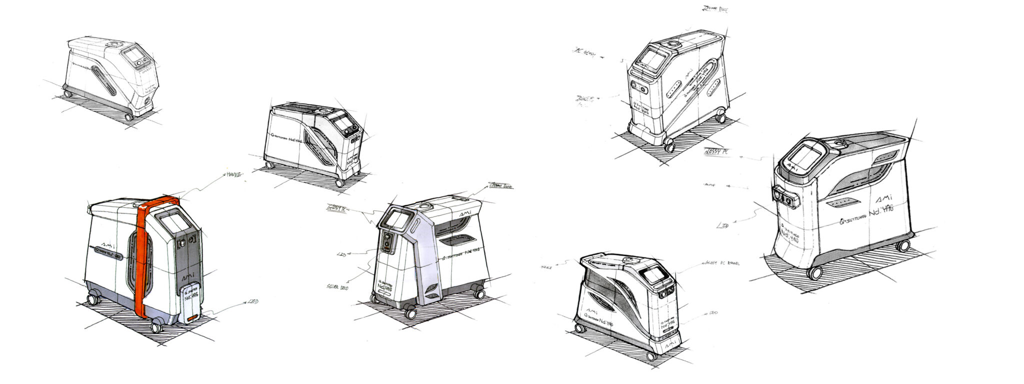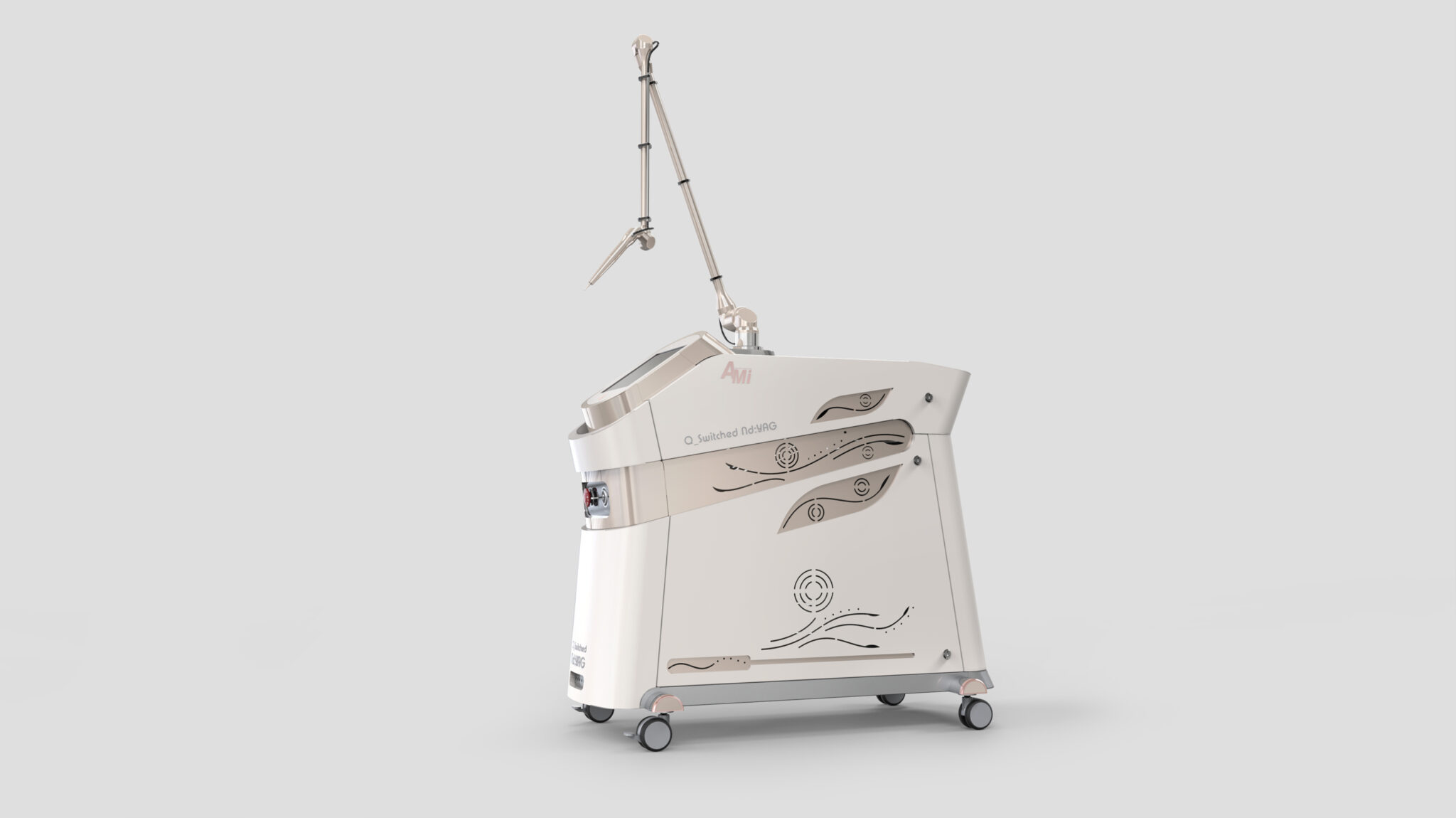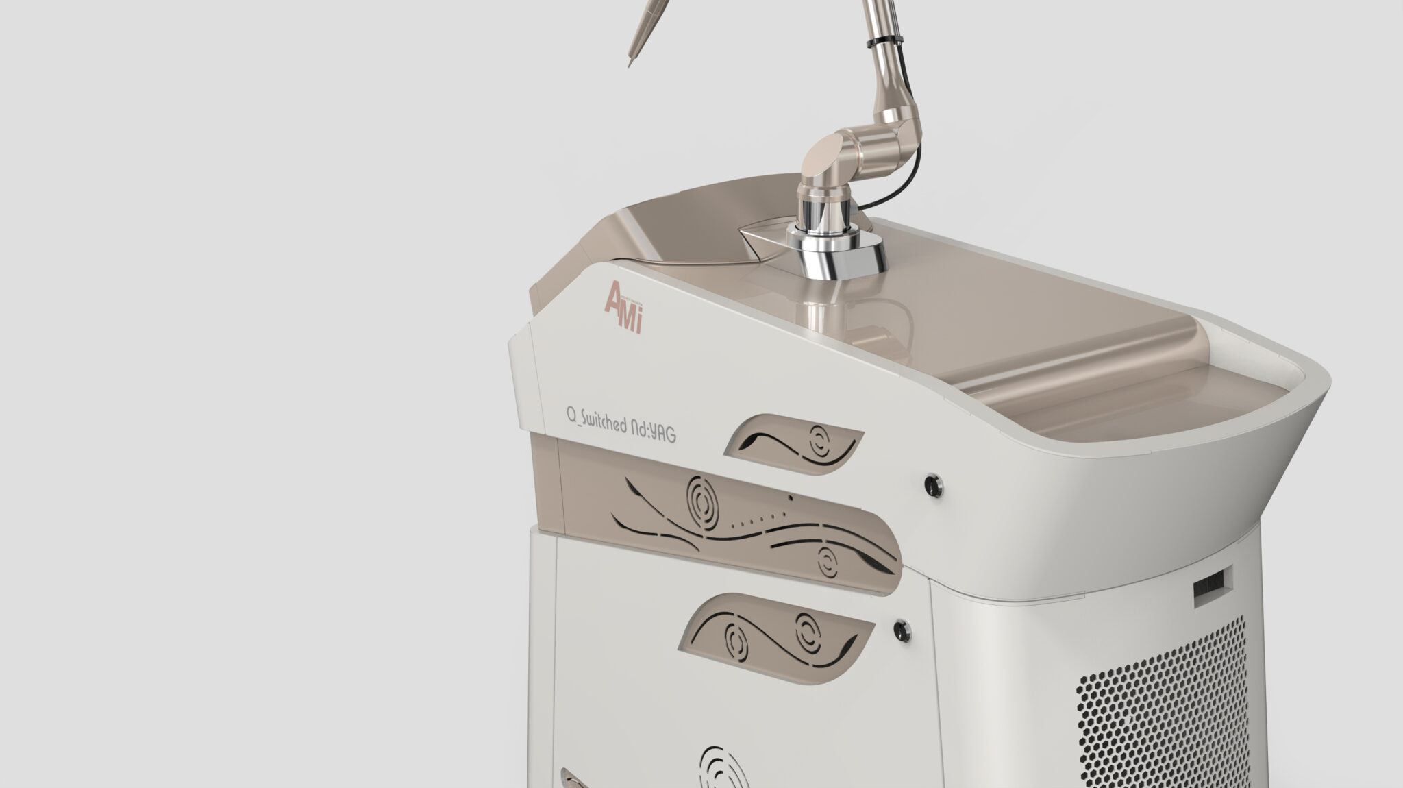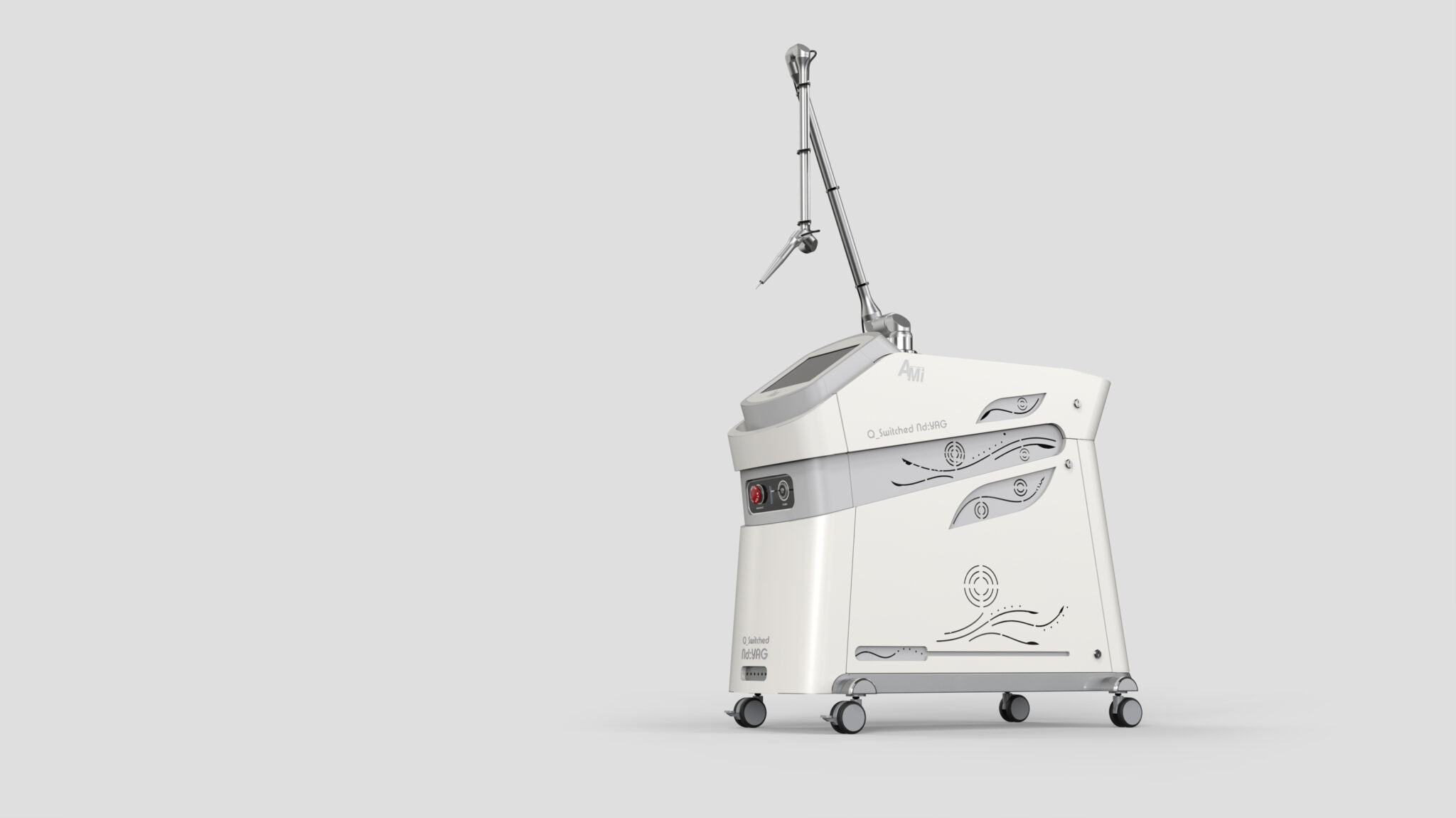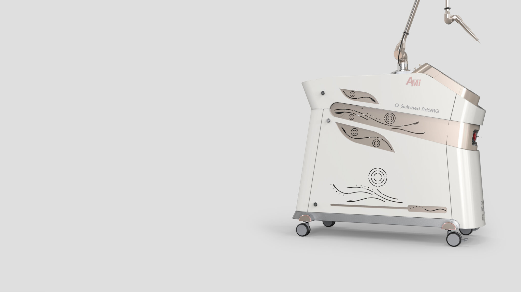 The Curved Pattern Detail on the side visually interprets laser beam waves and energy flow, seamlessly blending a flexible and sophisticated Brand Sensibility into the rigid image of medical equipment. Geometric cutting lines on the front and top symbolically express the sharp technical identity of the laser device, while the overall mass features a stable, low center-of-gravity design and proportions optimized for mobility.