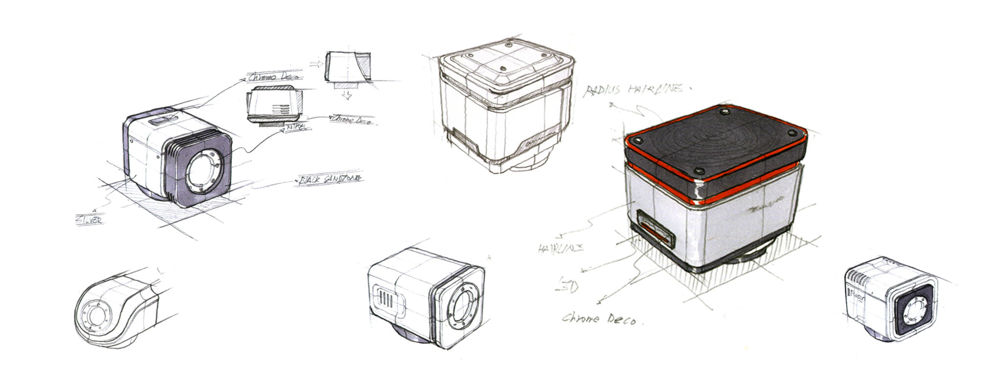 The design is characterized by capturing the Reliability, Stability, and Technical Perfection Expected of Precision Optical Equipment in a restrained form within a compact block structure.